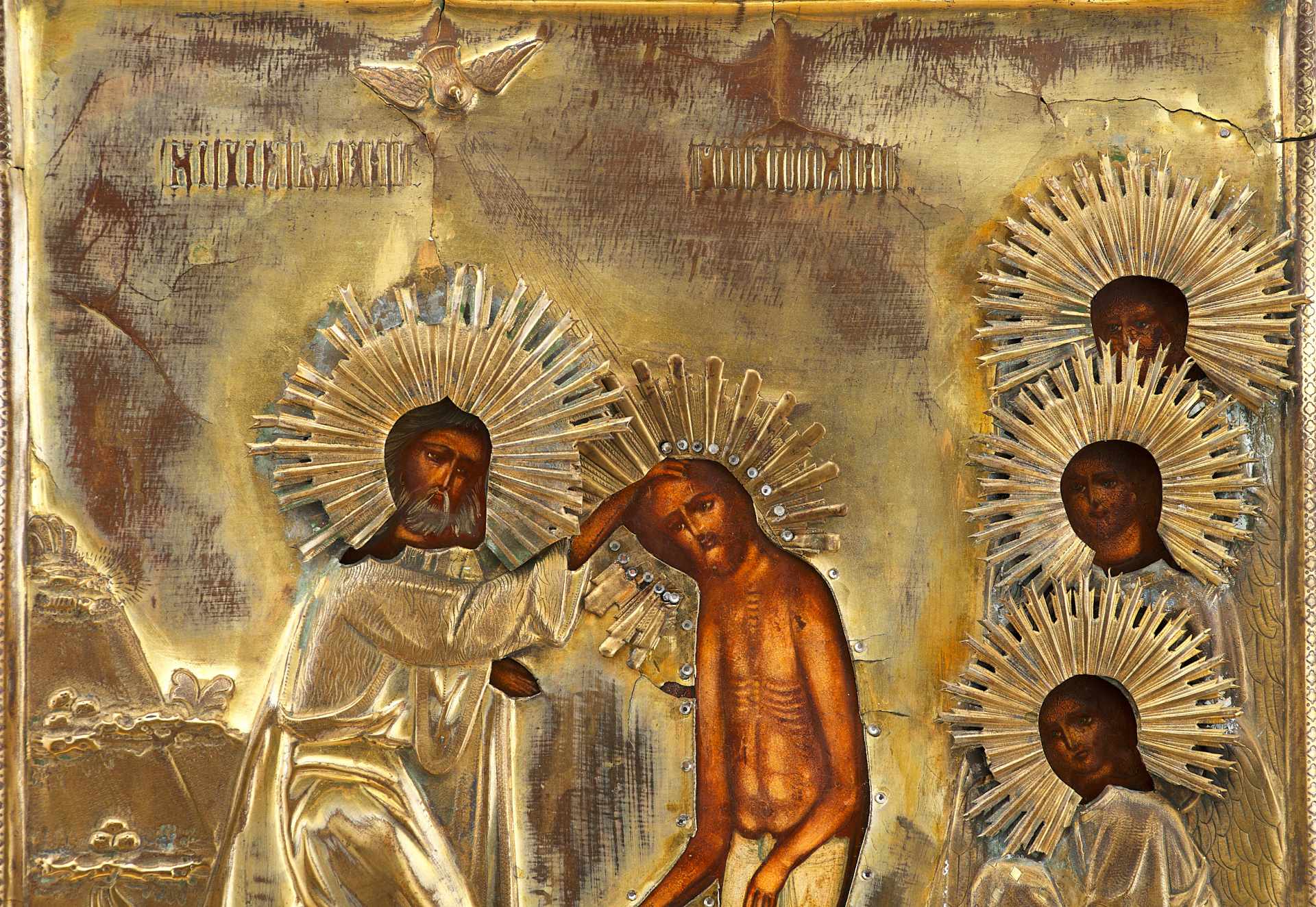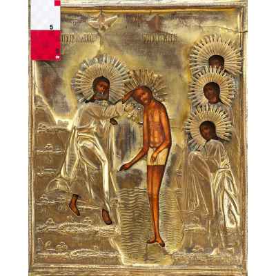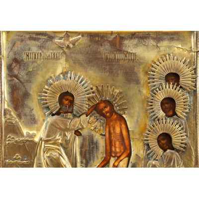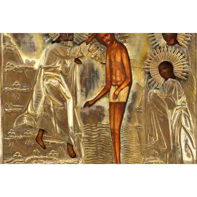 Храмовая икона в окладе Богоявление Крещение Господне золочение 46,5x37,5 см. конец XIX - начало ХХ вв