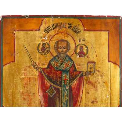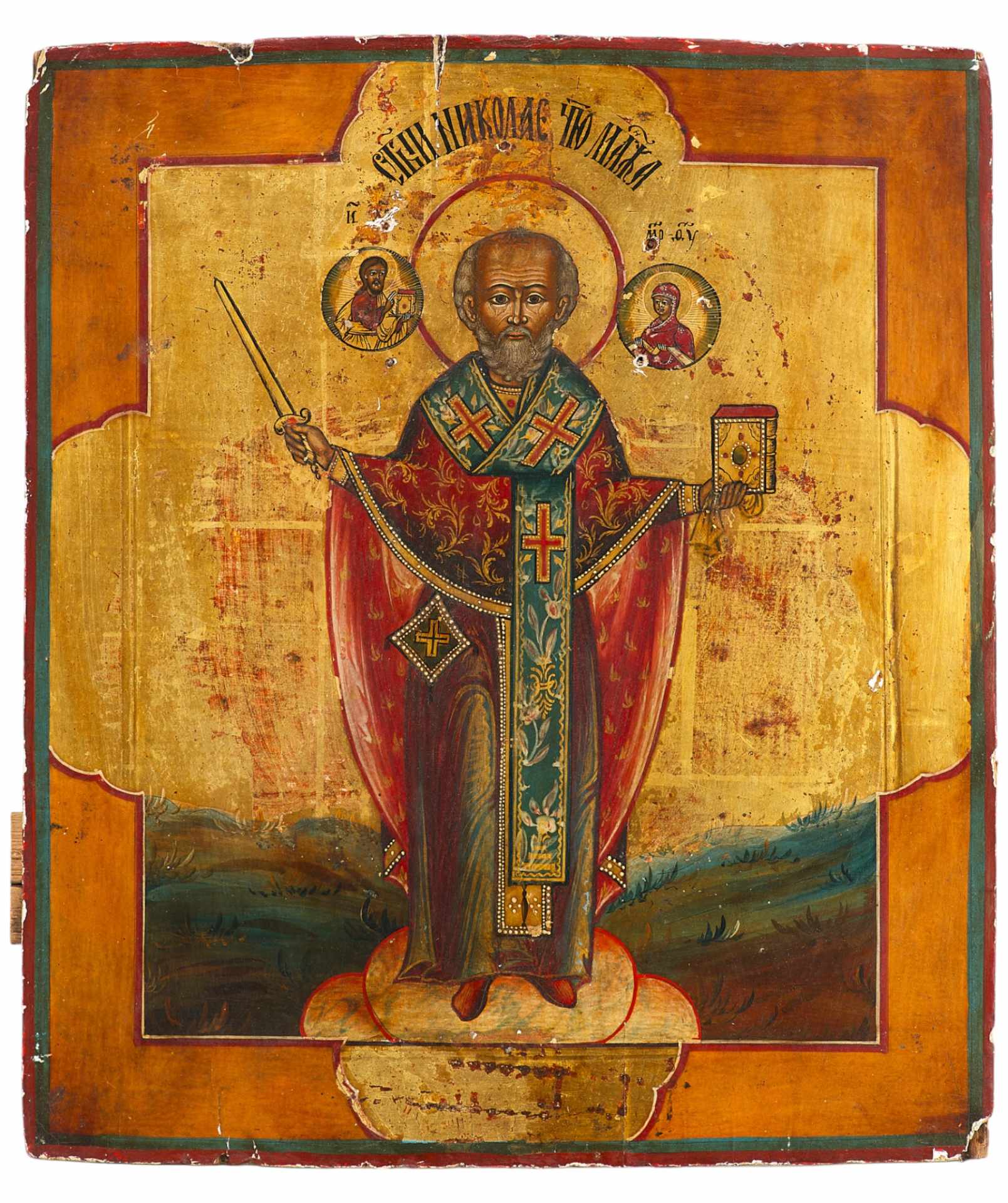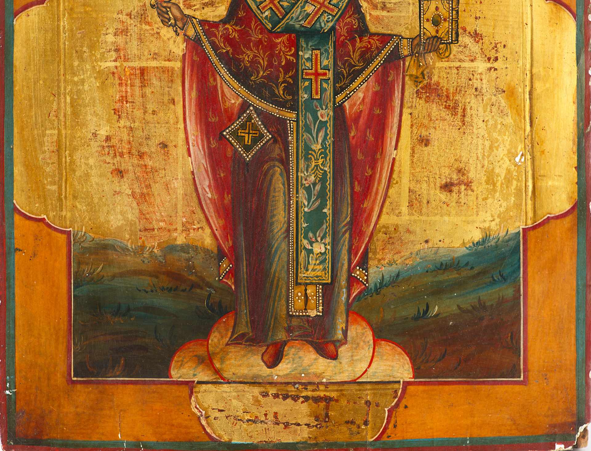 Вверху изображены Христос с Евангелием в рук.ах и Богоматерь с омофором - Никейское чудо, часто изображавшееся на иконах святого.