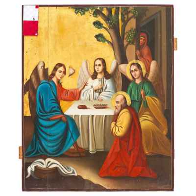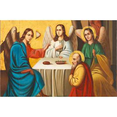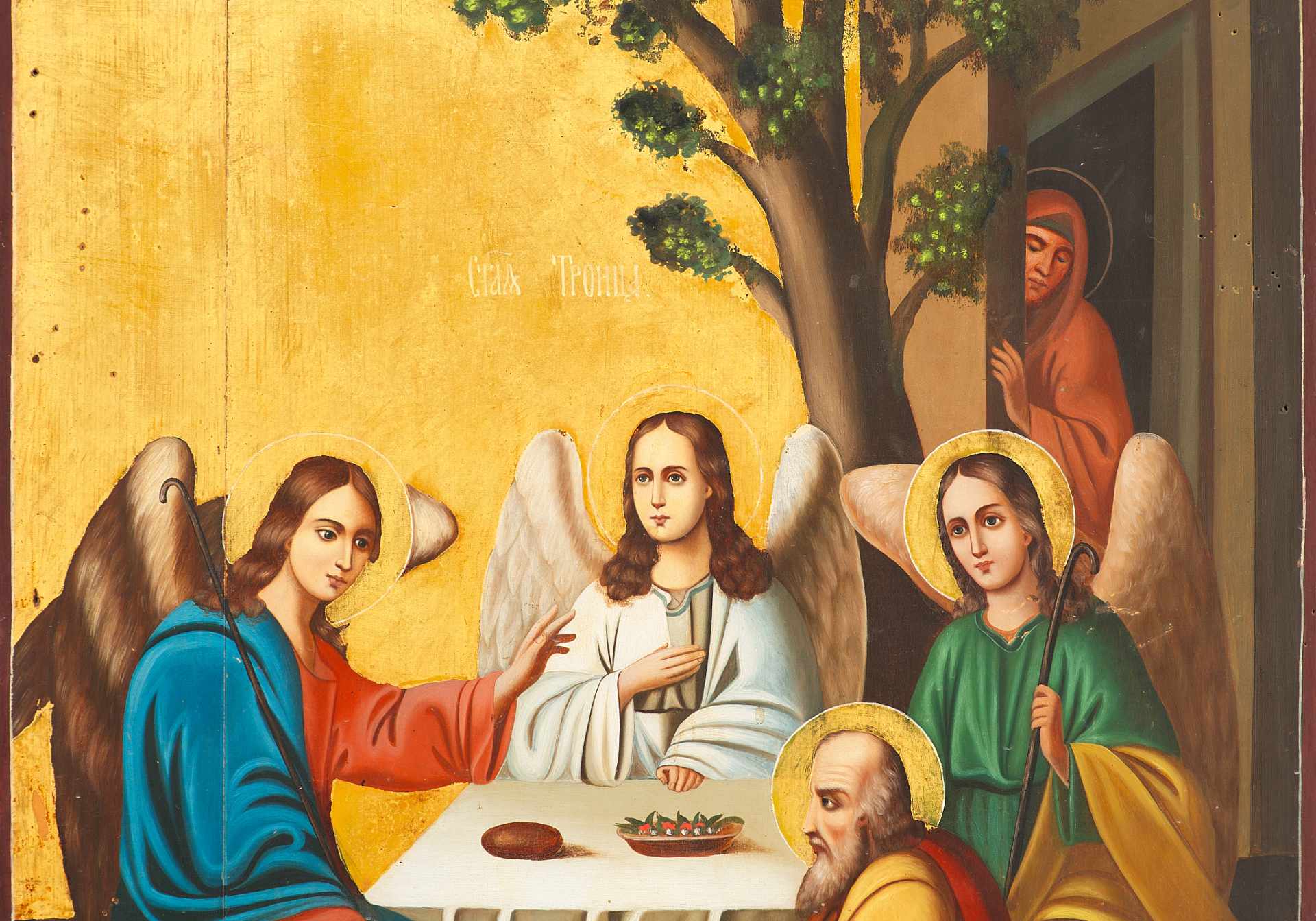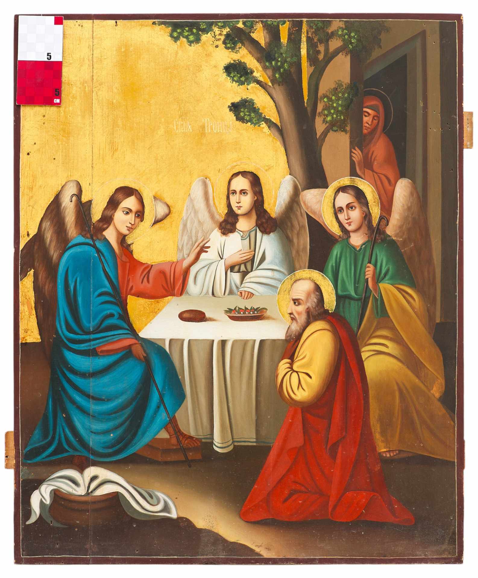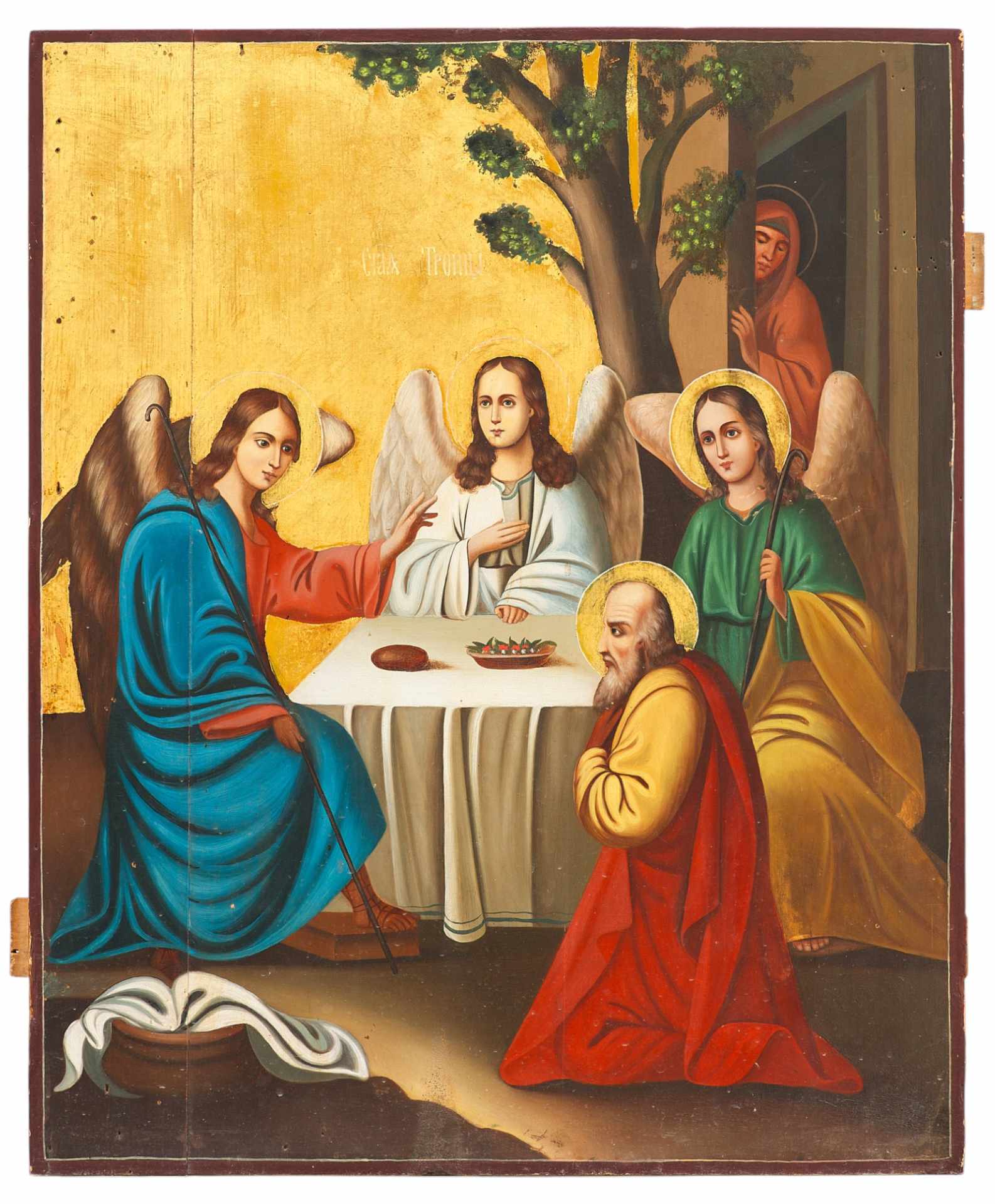 Сюжет происходит из Ветхого завета (Быт. 18: 1-16): по библейскому преданию, Авраам и Сарра до старости не имели детей. Однажды к праведному старцу явился Бог в виде трех ангелов и за трапезой дал ему твердое уверение, что через год Сарра родит сына и от Авраама произойдет «великий и сильный народ», среди которого родится Спаситель всего человечества. Изображение Ветхозаветной Троицы популярно в русской иконописи.