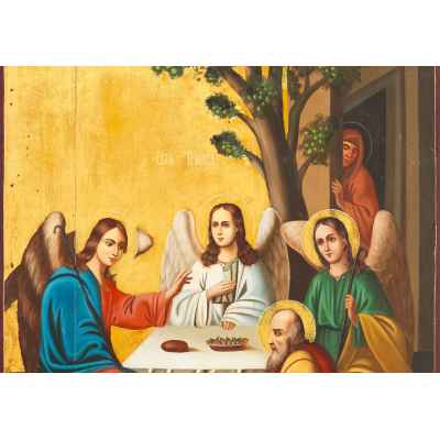 На иконе представлено три ангела, сидящие у Мамврийского дуба. Справа - Авраам и Сара. Ангелы изображены сидящими за столом с трапезой, приготовленной для них Авраамом, и благословляющими её.