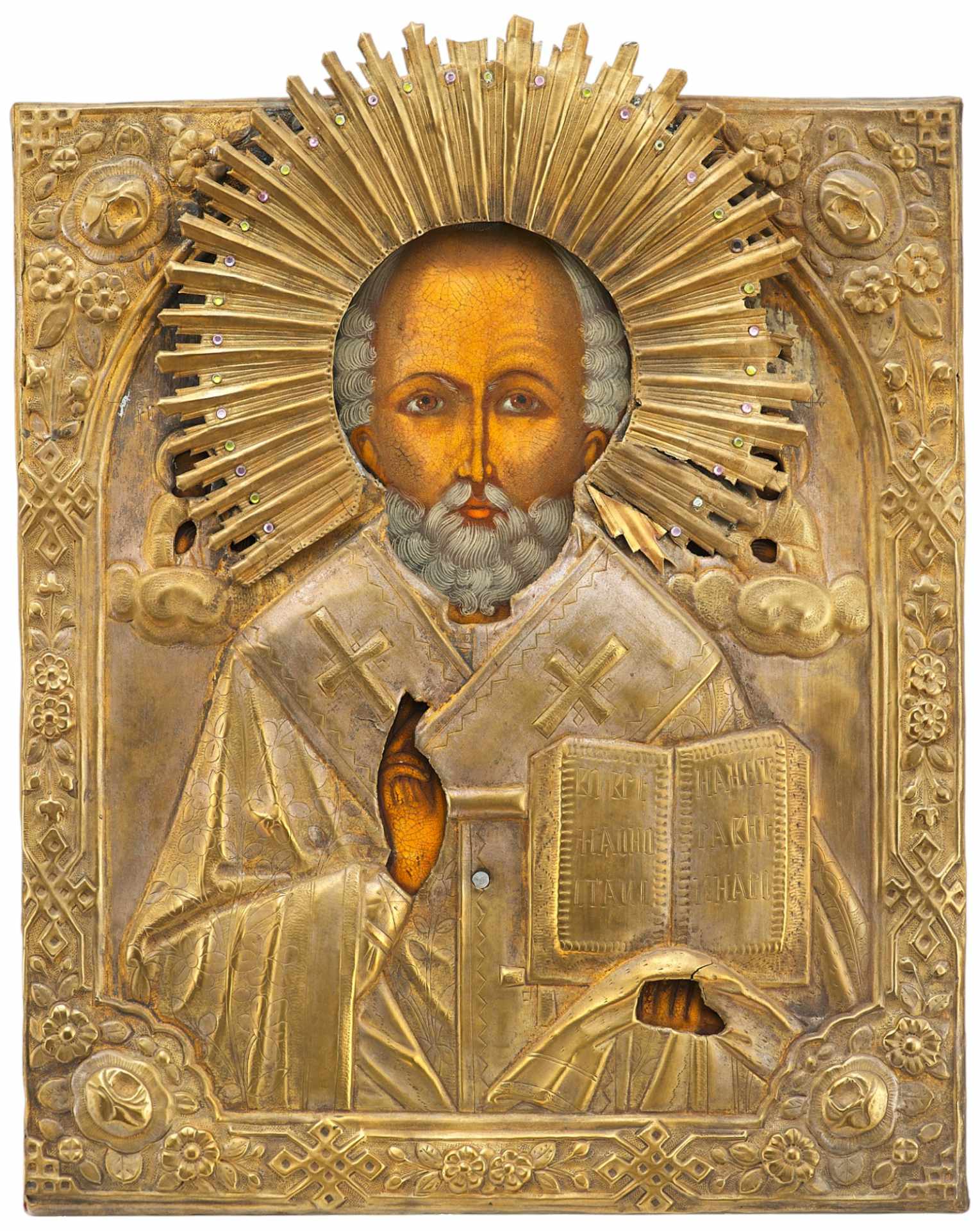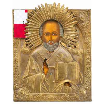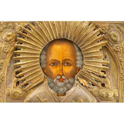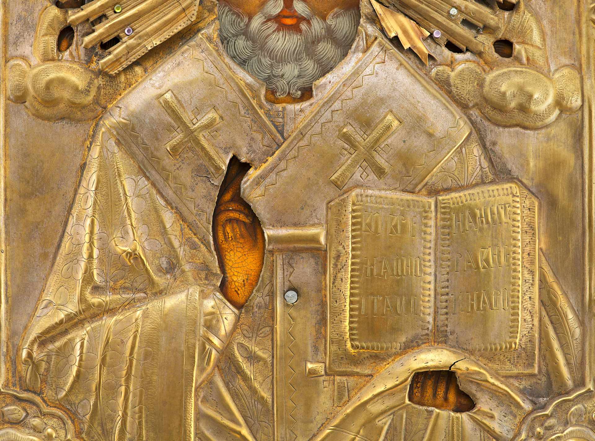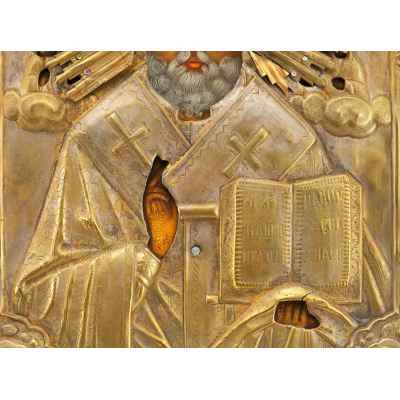 руке. Николай одет в святительские одежды с широким омофором, на котором выделены два креста. По сторонам нимба - изображение Христа и Богоматери напоминают о событии Первого Вселенского Собора, на котором Николай выступил с обличением Ария, за что был посажен в темницу и лишен епископского сана. Согласно легенде Богоматерь и Христос, явились в темницу, вернули Николаю Евангелие и омофор - знаки епископского достоинства.