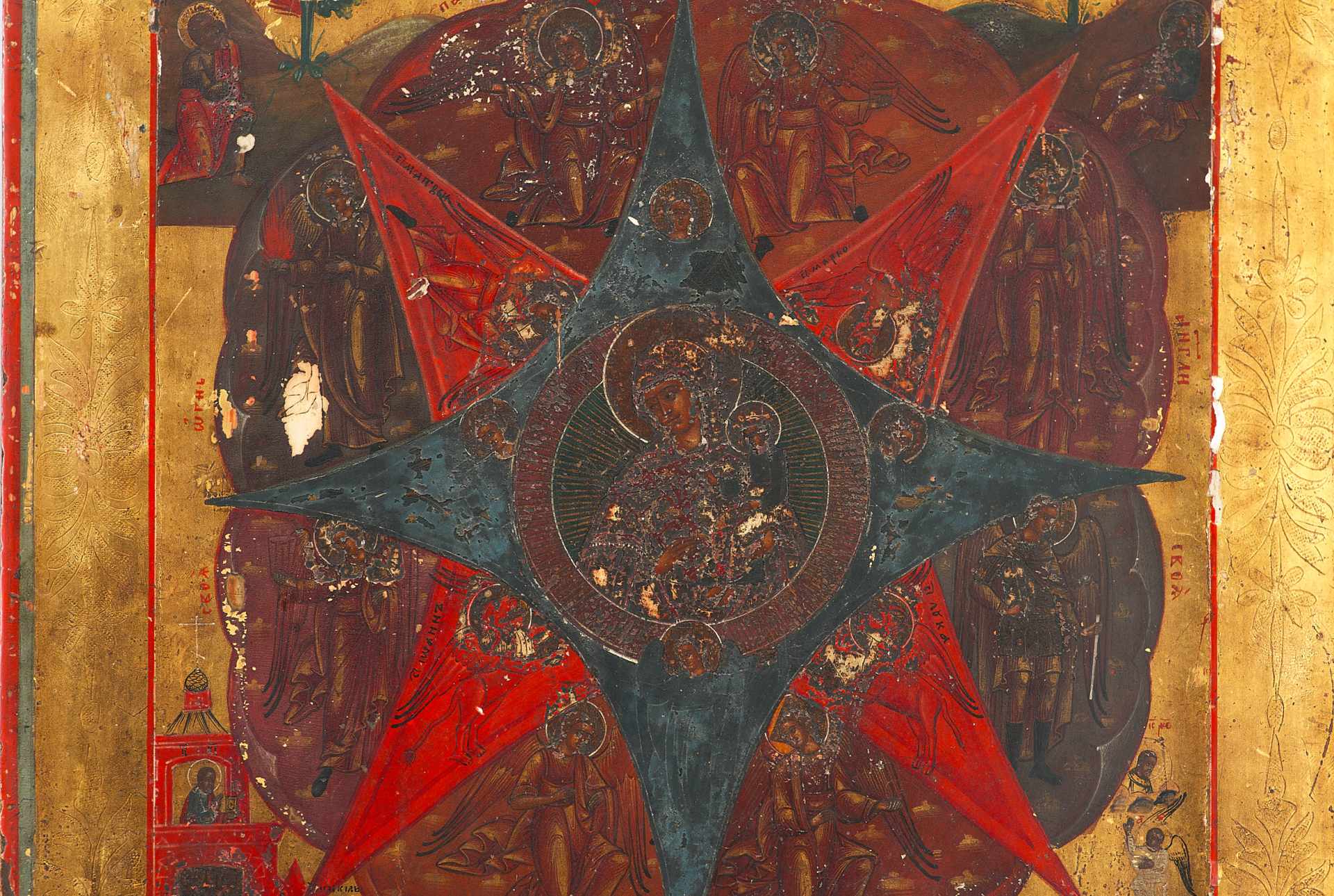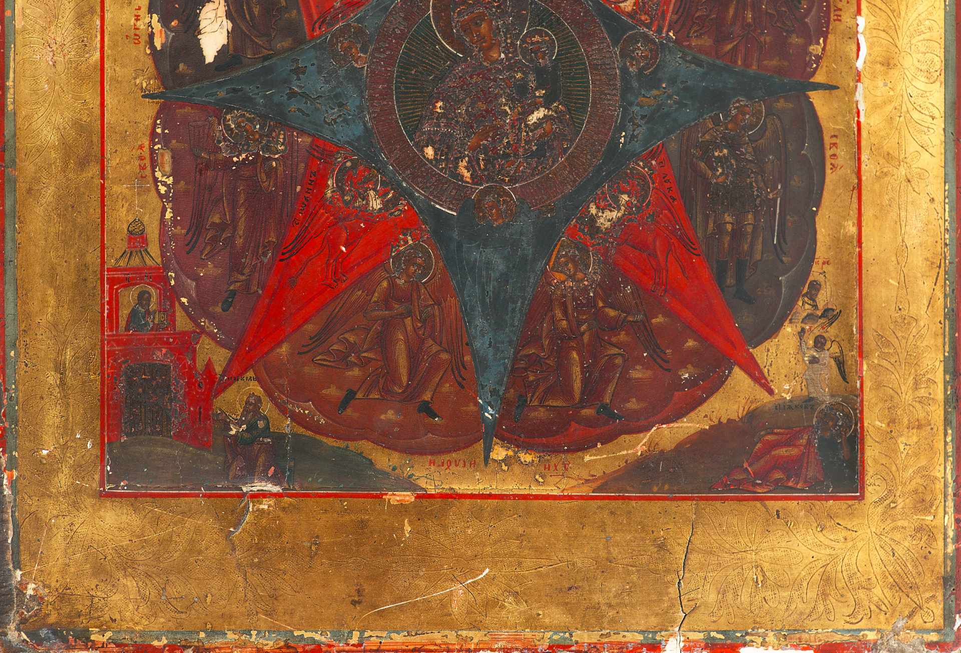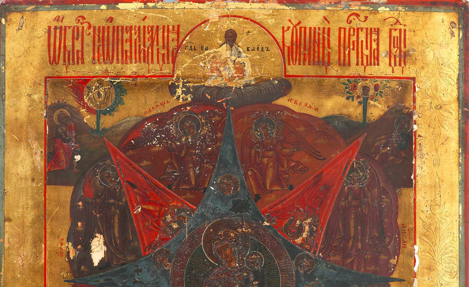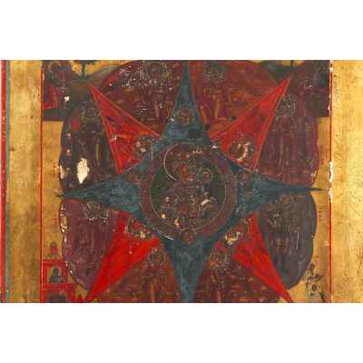 Иконография Богоматери Неопалимой Купины (празднуется 4/17 сентября) известна в русском искусстве с середины XVI века. Она сформировалась на основе толкований ветхозаветных пророчеств о Боговоплощении. Образ Неопалимой Купины восходит к тексту книги Исход (Исх. Ш, 2-3), описывающему явление пророку Моисею объятого пламени, но не сгоравшего тернового куста (Купины). В новозаветной традиции образ купины воспринимался как пророчество о Богоматери, неопалимо» вместившей в себя огненное естество Бога Сына и родившей миру Богочеловека Иисуса Христа. Усиление почитание иконы