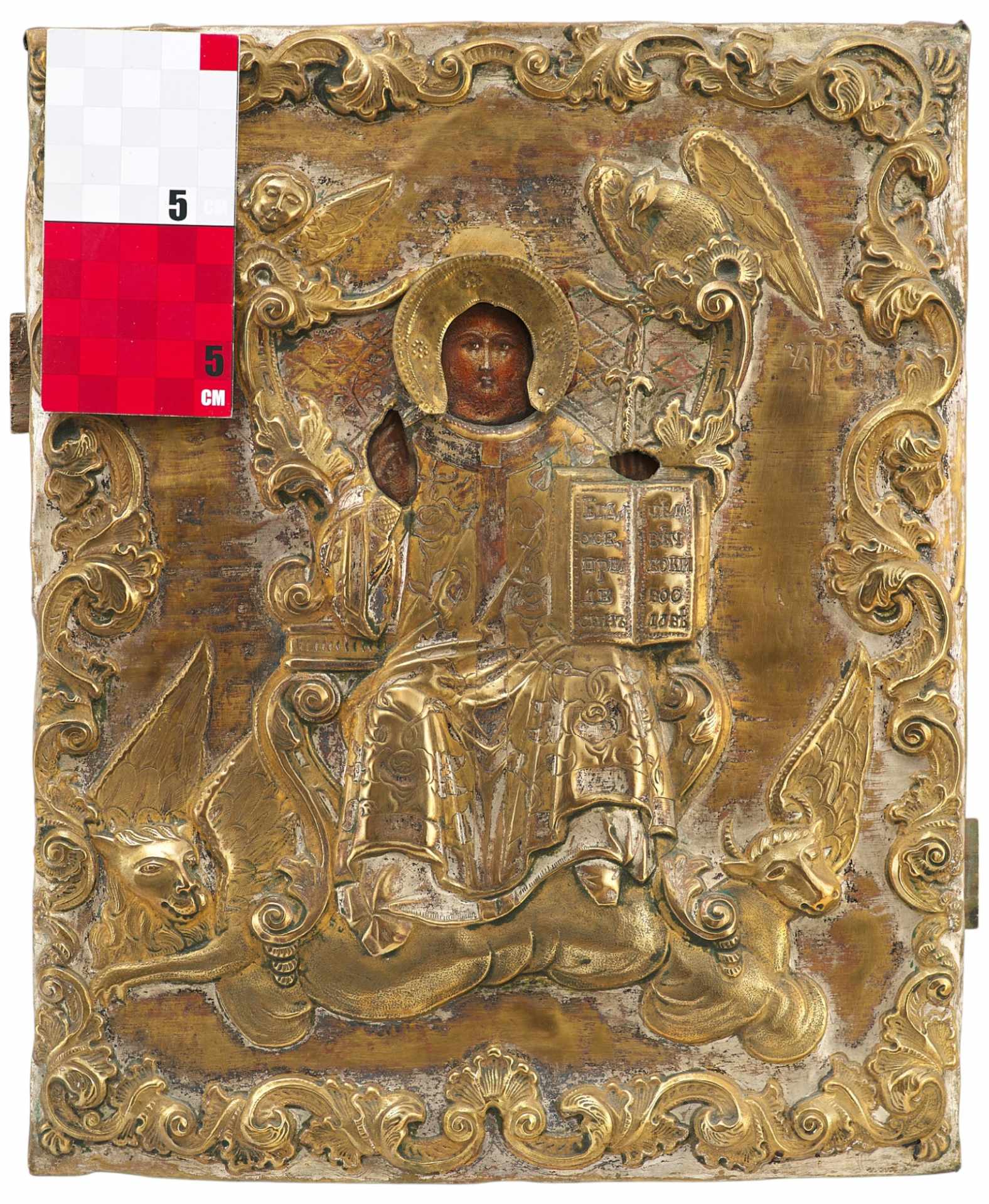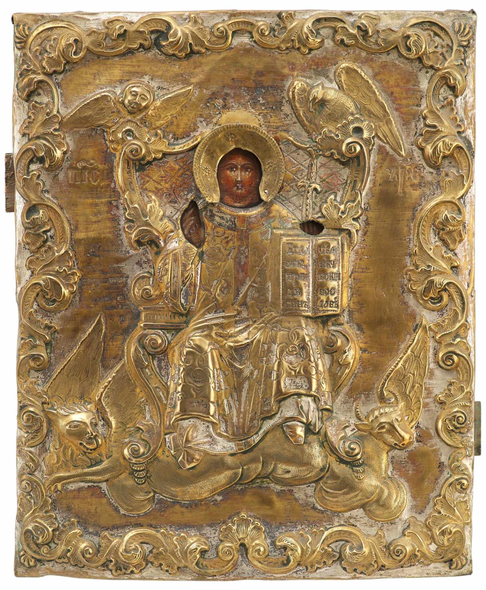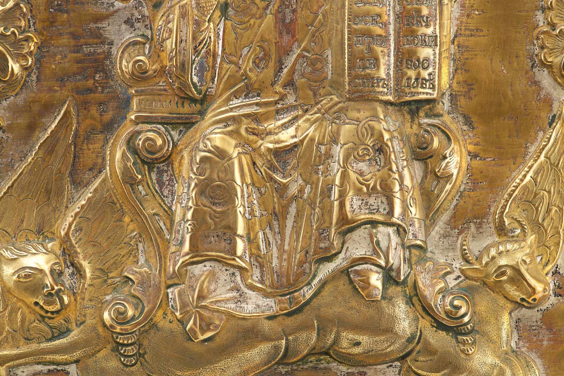 Спаса окружают — четыре животных Откровения, которые являются также символами Евангелистов: апостола Матфея —