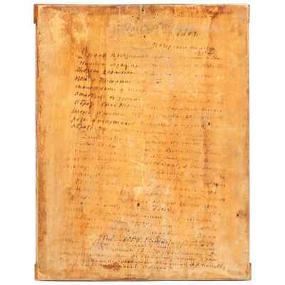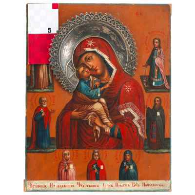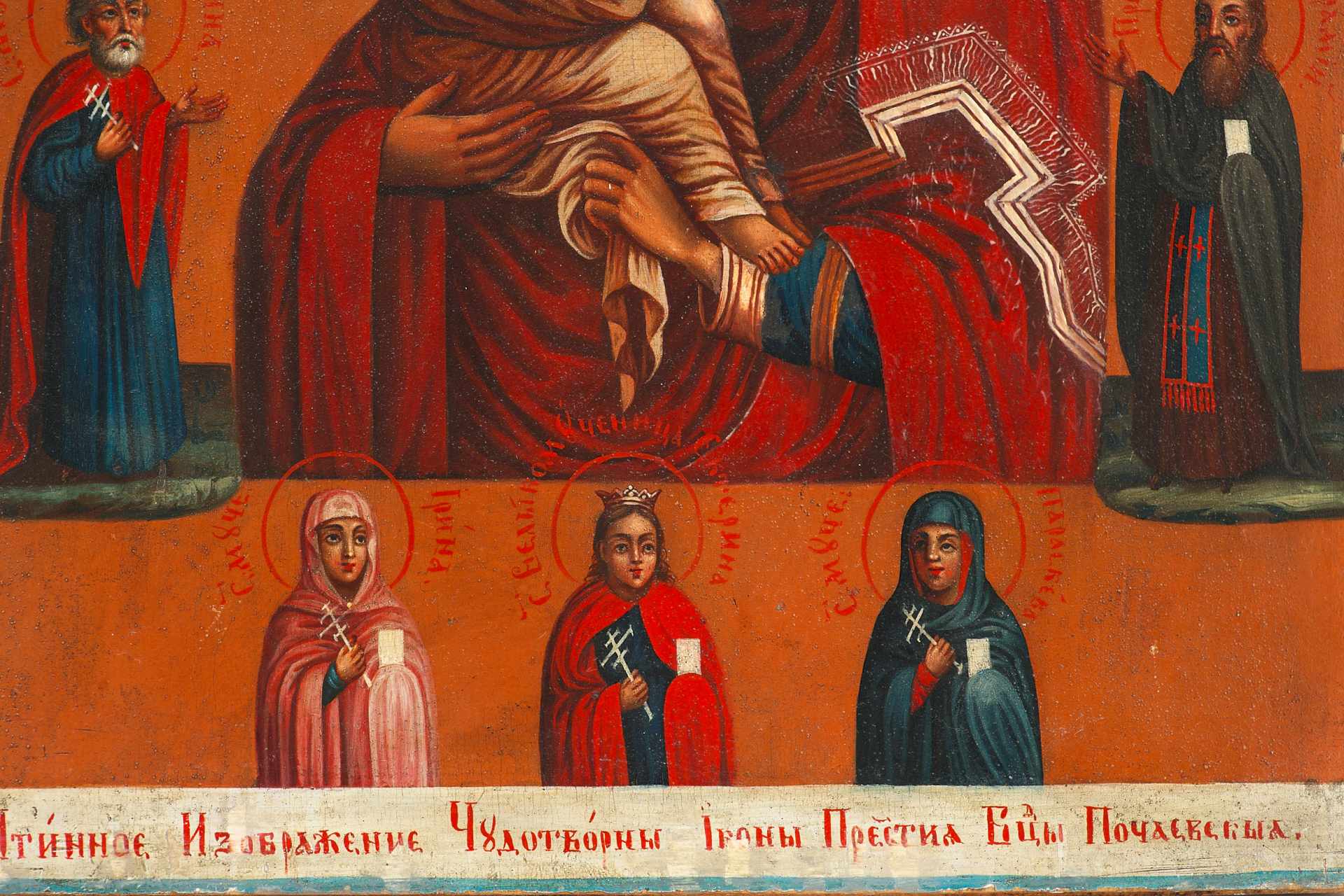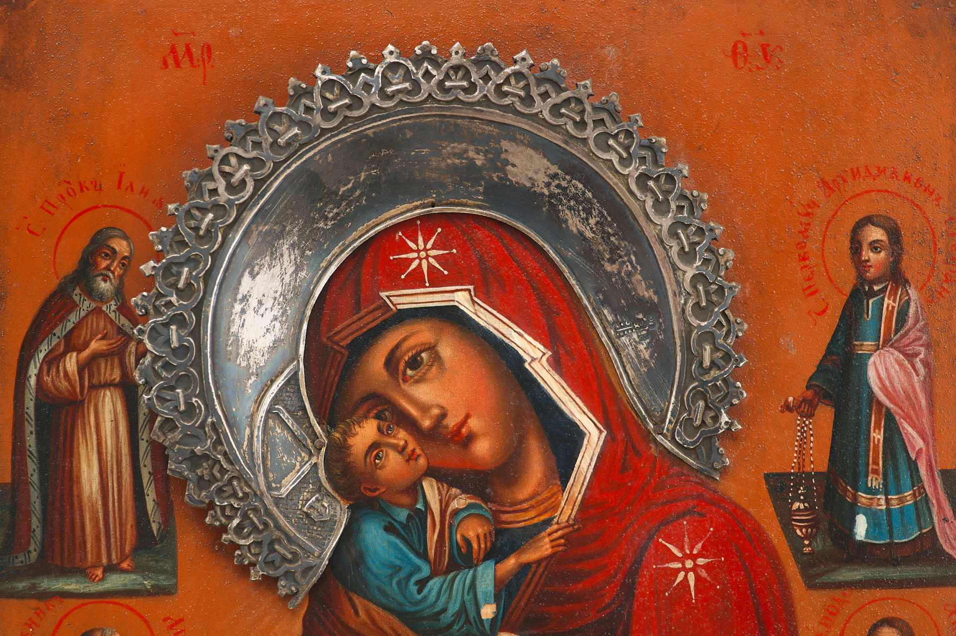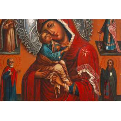 На полях иконы изображены святые покровители, вероятно, в честь членов семьи заказчика: пророк Илия, мученик Мина, архидиакон Стефан, преподобный Аврамий, мученицы Ирина, Екатерина и Параскева. Такая иконография указывает на индивидуальный заказ, распространённый в благочестивых семьях XIX века, когда создавались иконы с изображением семейных небесных заступников.
