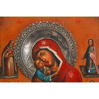 Центральное место занимает образ Богородицы с Младенцем, выполненный в иконографическом типе «Умиление». Младенец Иисус прижат к щеке Матери, жестами и выражением лица подчёркивается эмоциональная и духовная близость. Образ увенчан серебряным венцом, украшенным орнаментом, с клеймами мастера Орлова Дмитрия Ивановича, известного ювелира и владельца серебряной фабрики, а также пробирного мастера А. Свечина. Венец имеет пробу «84» и московский герб — Георгия Победоносца.