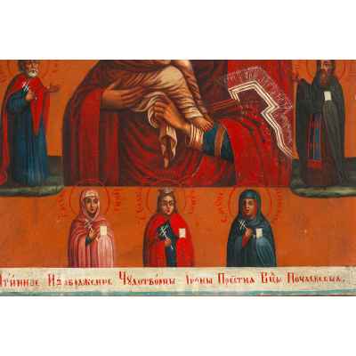 Икона «Богоматерь Почаевская» представляет собой пример русской иконописи второй половины XIX века, выполненной в технике темперной живописи по левкасу на деревянной доске с торцовыми шпонками. Образ Богоматери на иконе сопровождается пояснительной надписью: «Истинное изображение чудотворной иконы Престия Богоматери Почаевской», подчёркивая её статус как копии знаменитой чудотворной святыни. Размер иконы — 31,0 × 24,3 × 2,2 см.