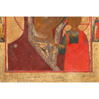 На полях избранные святые: слева - ангел-хранитель; справа - святая велико.мученица Екатерина. Судя по изображенным на полях святым, можно предположить, что икона написана на заказ.