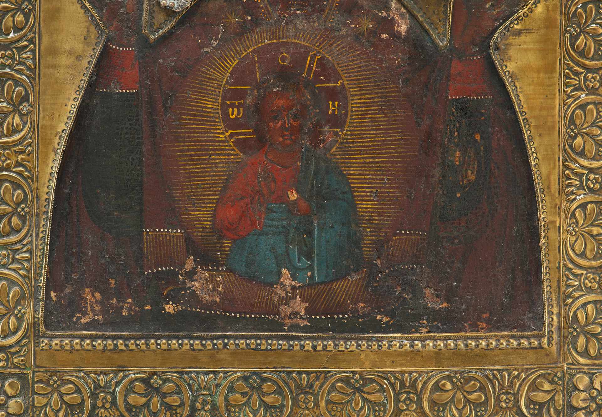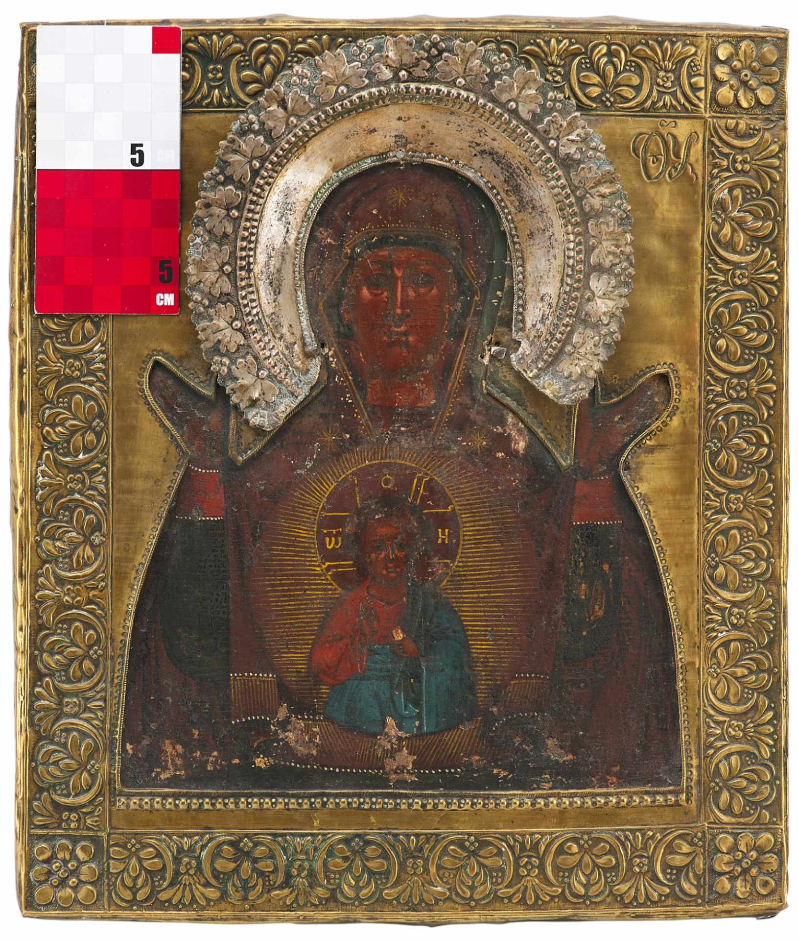 Икона в окладе Богоматерь Знамение темпера, латунь, 37x27x5 см. XVIII век