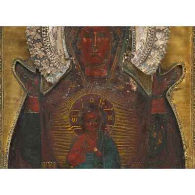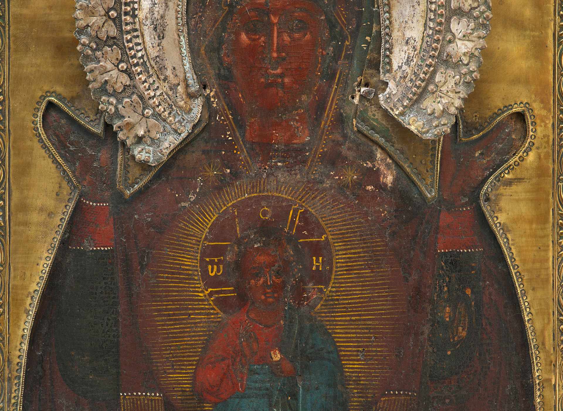 Это поясной вариант иконографического типа Великой Панагии. Тип изображения Богоматери основан на пророчестве Исайи, который предсказал воплощение Сына Божия в человеческом образе. На Руси появилась в XII веке, а именоваться так стала после чудесного знамения новгородской иконы.