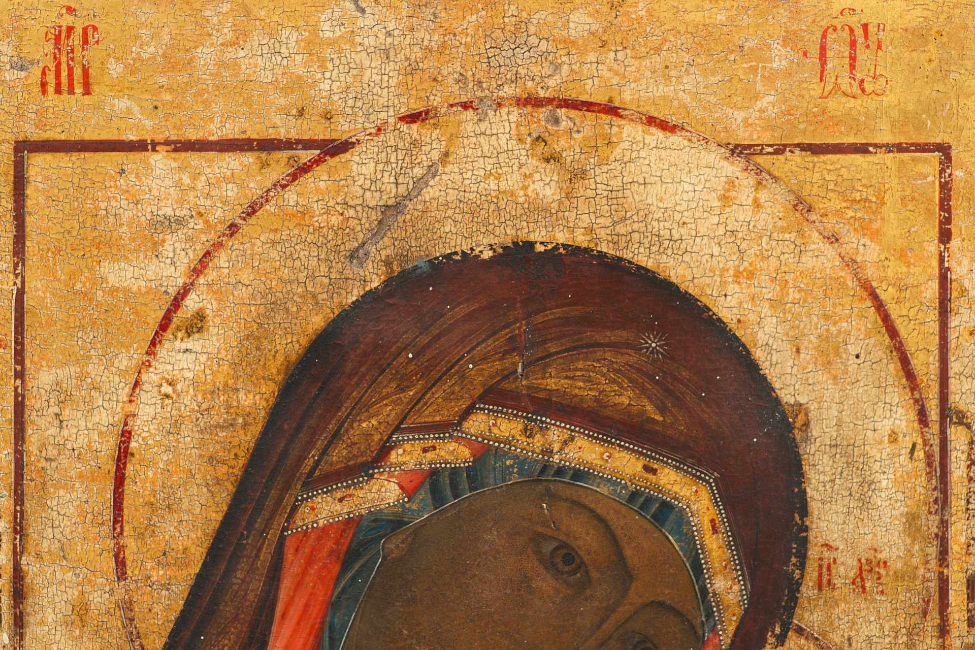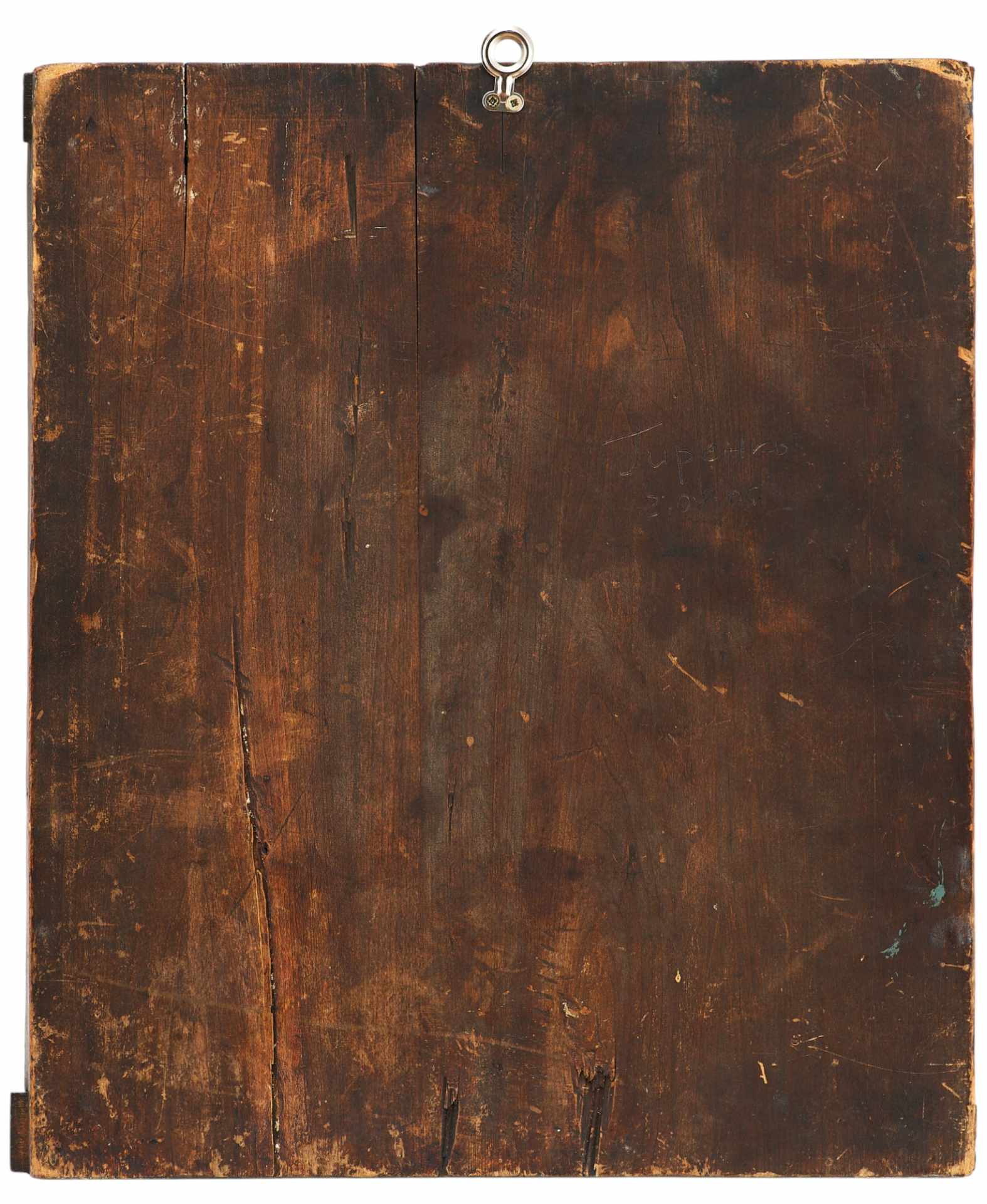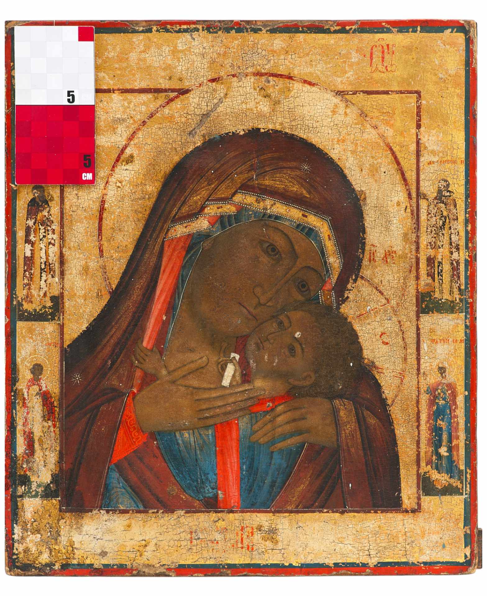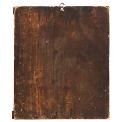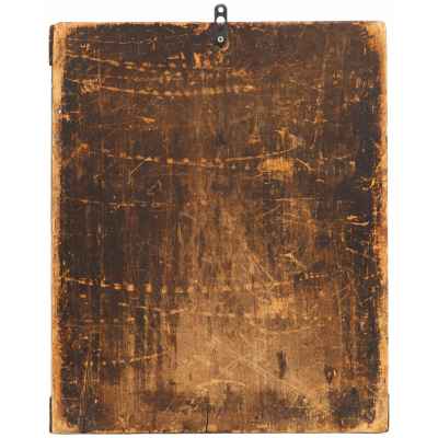 Доска составная тонированная, из двух частей с двумя врезными торцевыми шпонками. Фон полей и средника золотой. Лики коричневые, высветлены белым под глазами, над бровями, на подбородке.