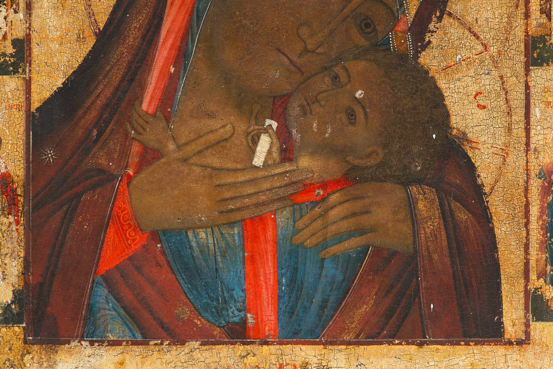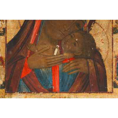 Композиция иконы сосредотачивает внимание зрителя на ликах и жестах Богоматери и Младенца. Выразительны жесты красивых рук с тонкими гибкими пальцами. Пальцы правой руки Младенца, сжимающей свиток, сложены в жесте, напоминающем именословное благословение, левой рукой он держит край мафория Богоматери. Руки Богоматери заключают Младенца в нежные объятья.