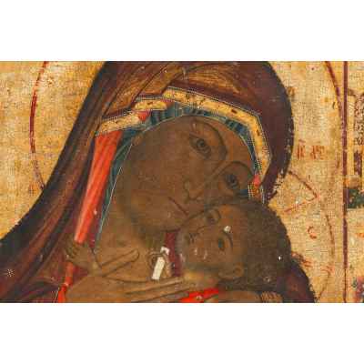 На иконе Дева Мария, склонив голову, прижимает к себе двумя руками Иисуса. Он, закинув лицо, прислонился к лицу Матери с лаской касается Ее подбородка.
