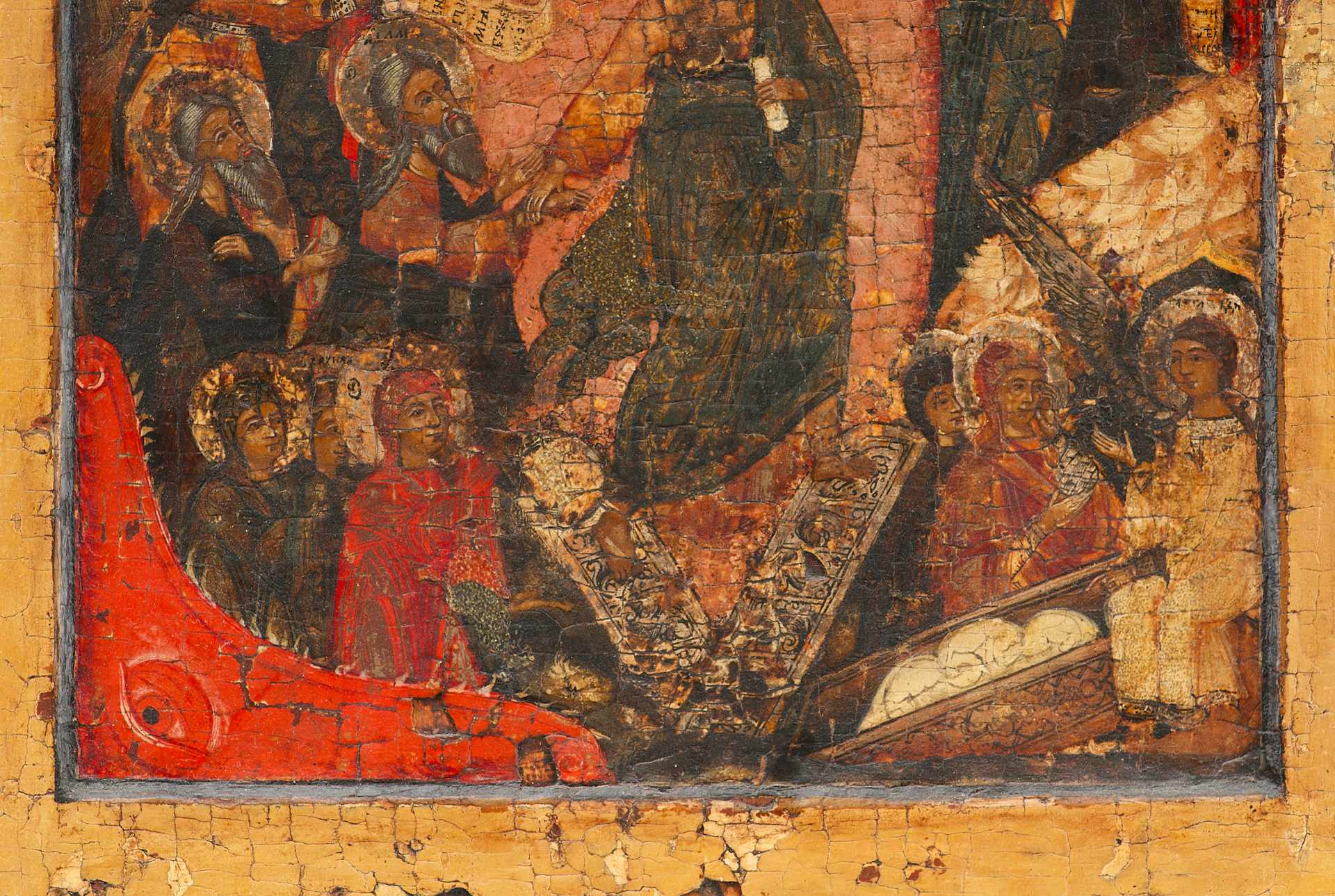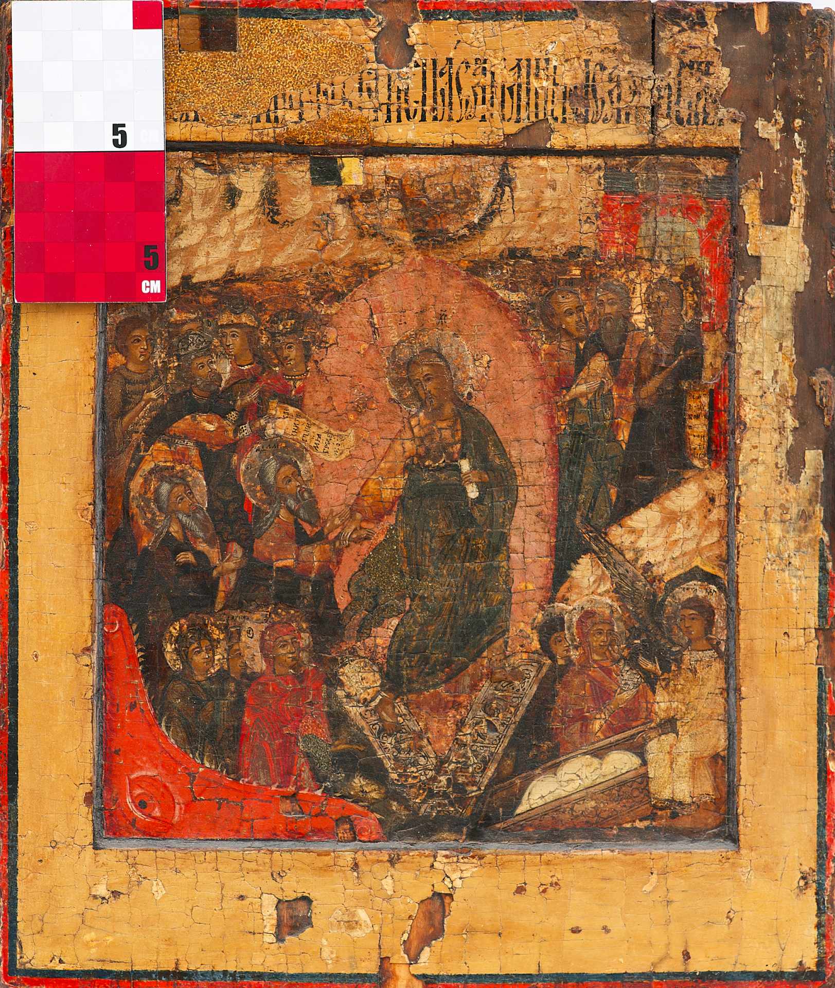 В композиции фигурируют изображения царей Давида и Соломона (предки Христа), Иоанна Предтечи, возвестившего в Аду о приходе Мессии. Створки, сокрушенных Иисусом ворот, сложены под ступенями его в подобии креста Андреевского типа. У ног Христа слева гигантский левиафан с открытой пастью, наполненной людьми.