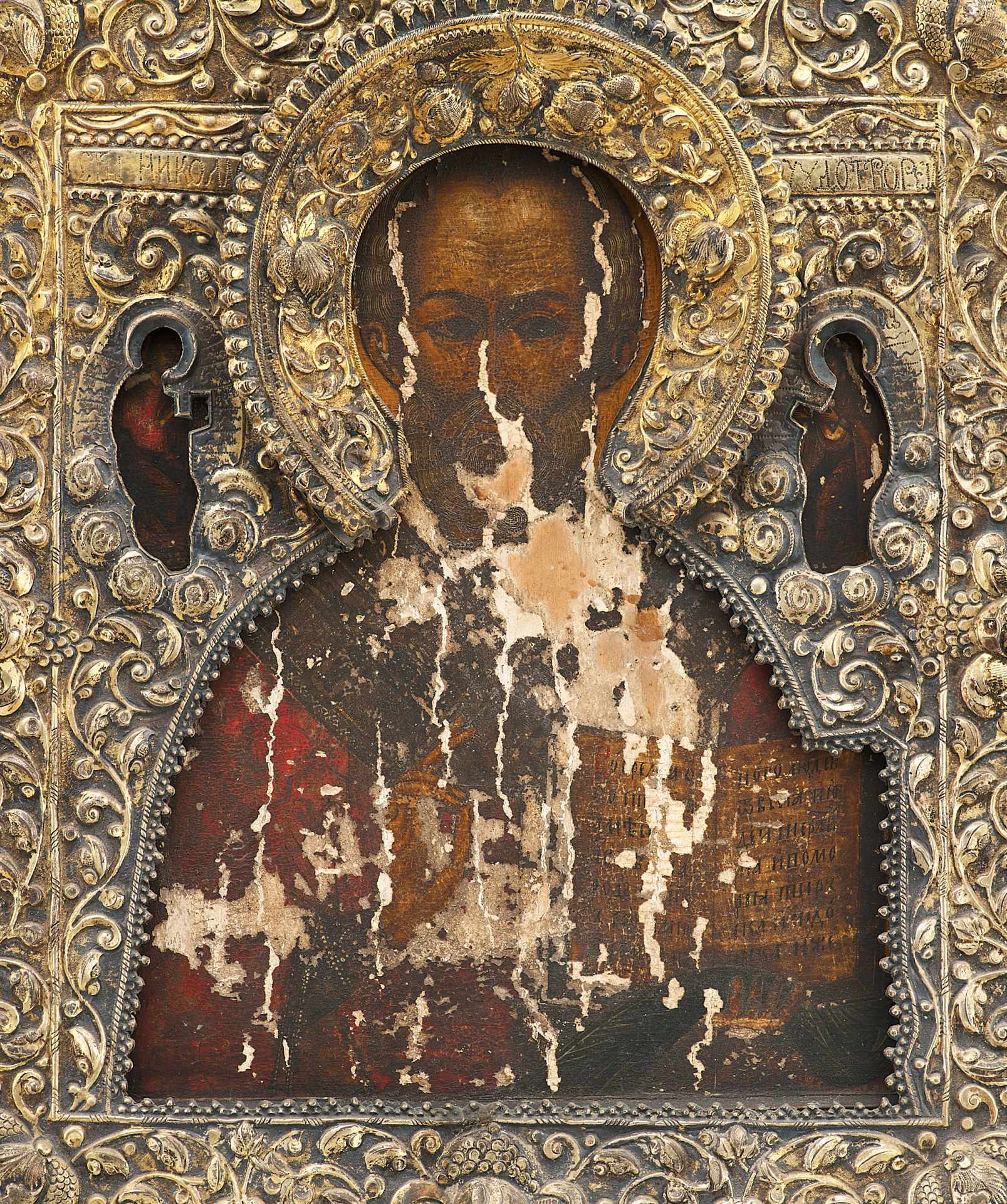 изображение Христа и Богоматери напоминают о событии Первого Вселенского Собора, на котором Николай высту пил с обличением Ария, за что был посажен в темницу и лишен епископского сана. Согласно легенде Богоматерь и Христос, явились в темницу, вернули Николаю Евангелие и омофор — знаки епископского достоинства.