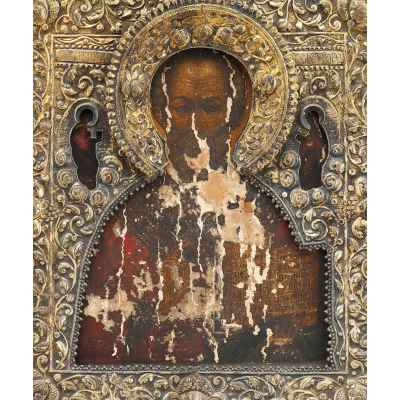 На иконе представлен Святитель Николай Чудотворец, с благословляющим жестом правой руки и Евангелием в левой руке. Николай одет в святительские одежды с широким омофором, на котором выделены два креста. По сторонам нимба —