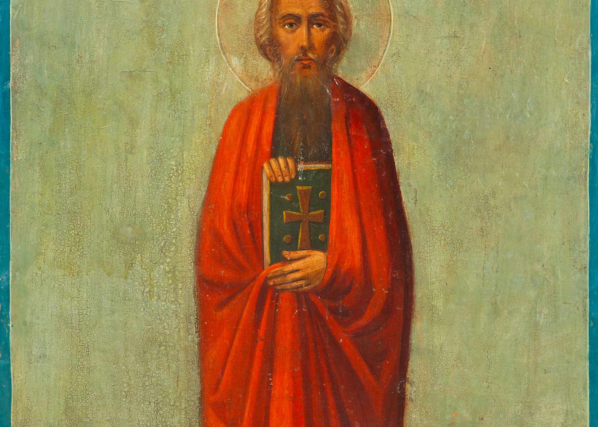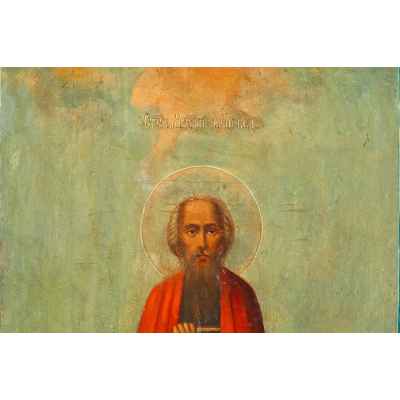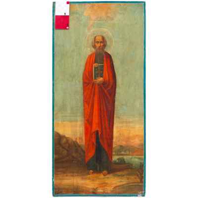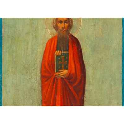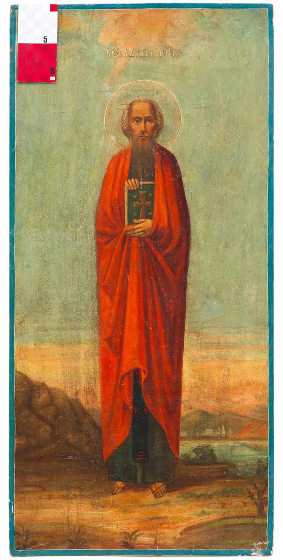 На иконе представлен святой, изображенный в полный рост на фоне пейзажного пространства, в руках которого евангелие.