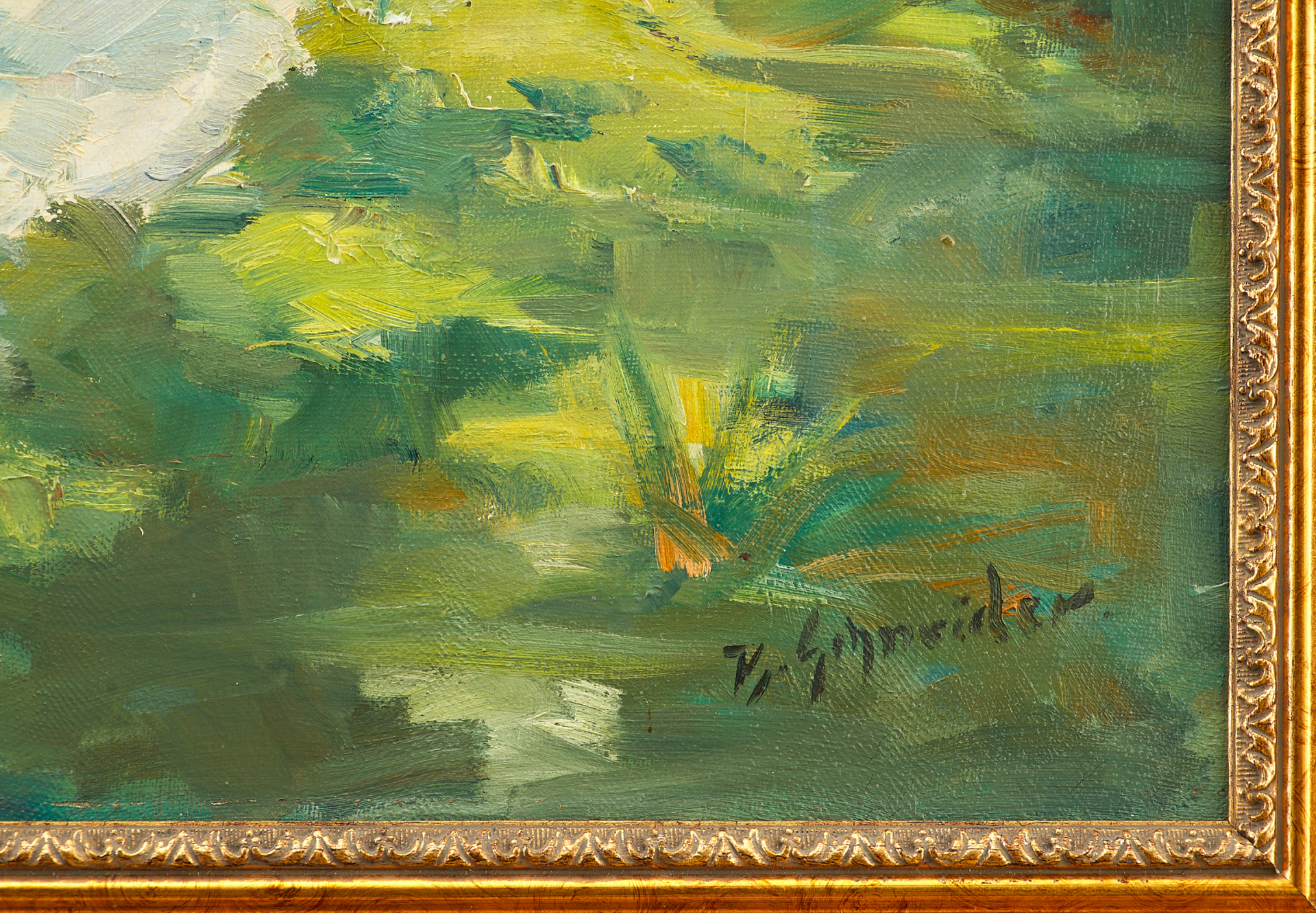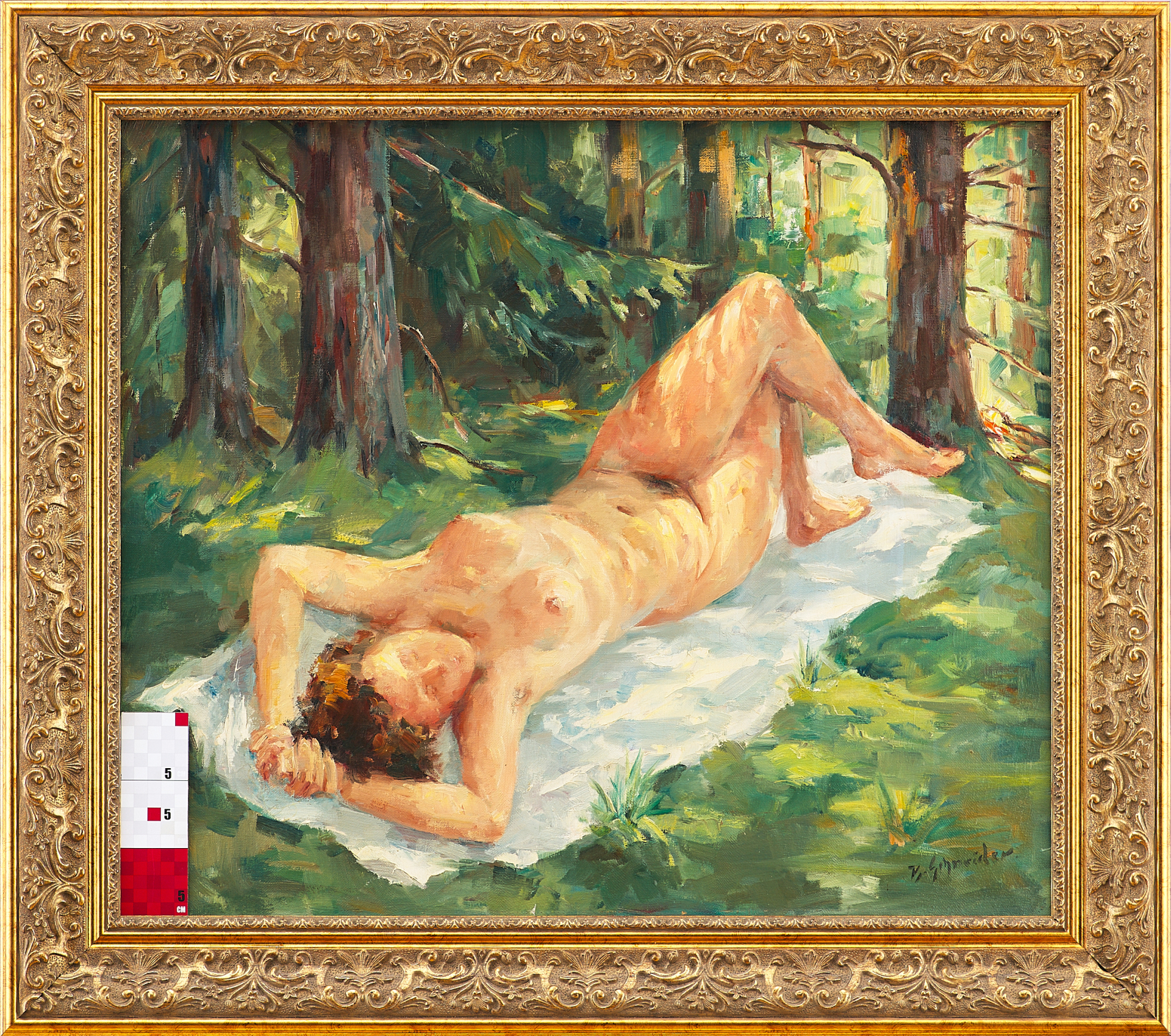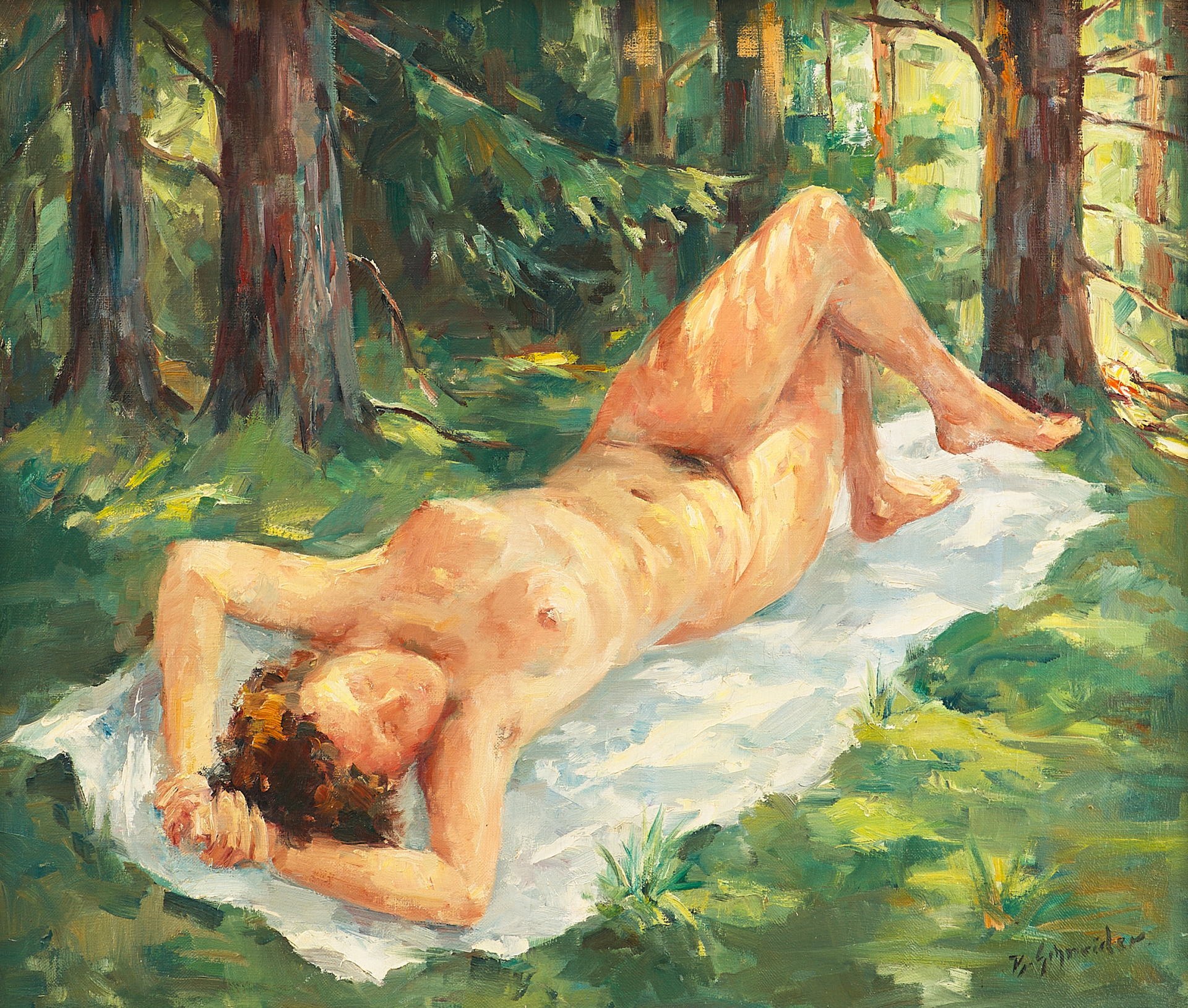 Картина «Обнажённая натурщица» кисти В. Шнайдера, выполненная в первой половине XX века, представляет собой образец жанра ню, который имеет устойчивую традицию в европейской живописи. На полотне изображена обнажённая молодая женщина, отдыхающая на белом покрывале в окружении лесного пейзажа. Её поза свободна и естественна, фигура гармонично вписана в светлый и живописно трактованный фон, пронизанный солнечными бликами и полутонами зелёных оттенков.