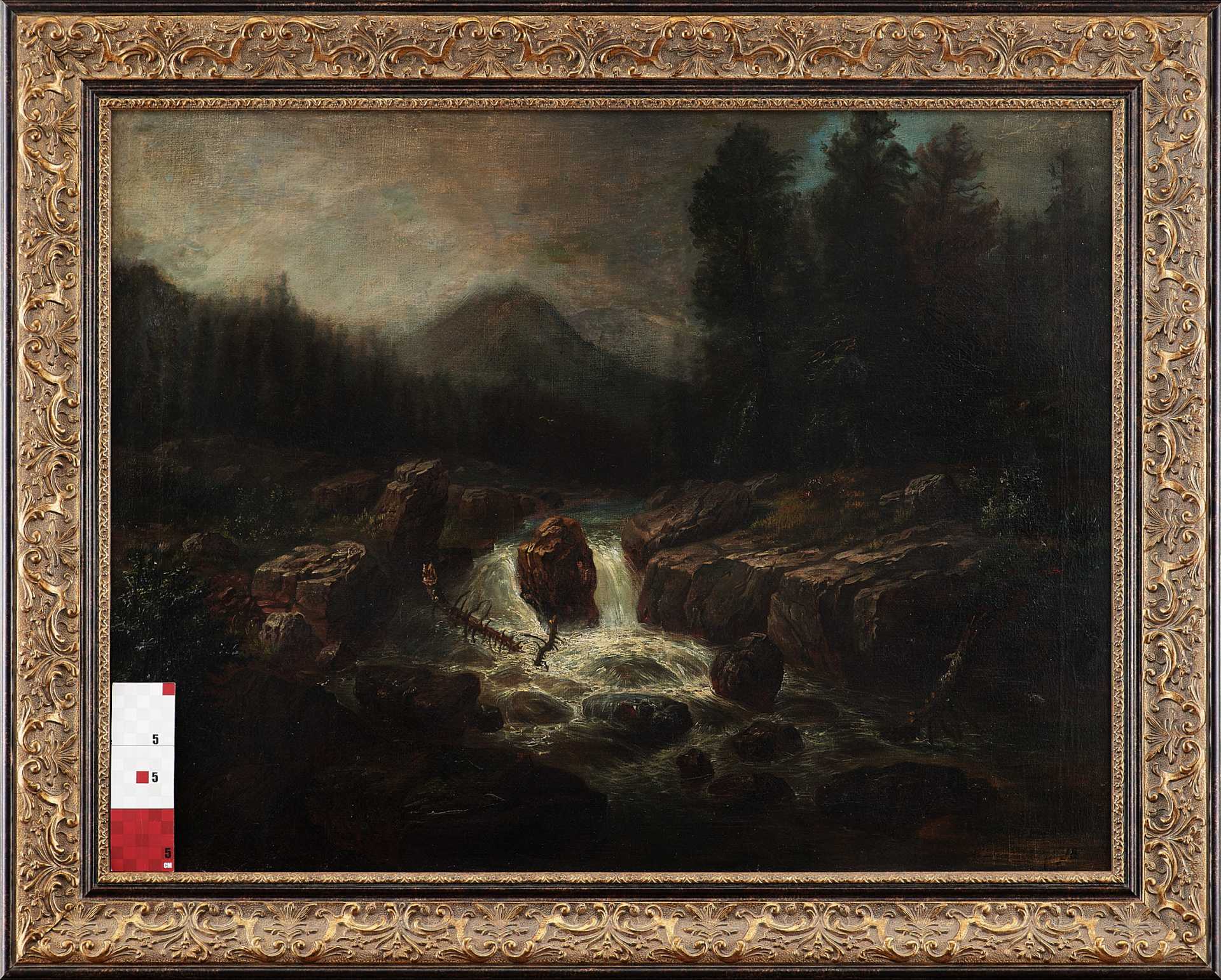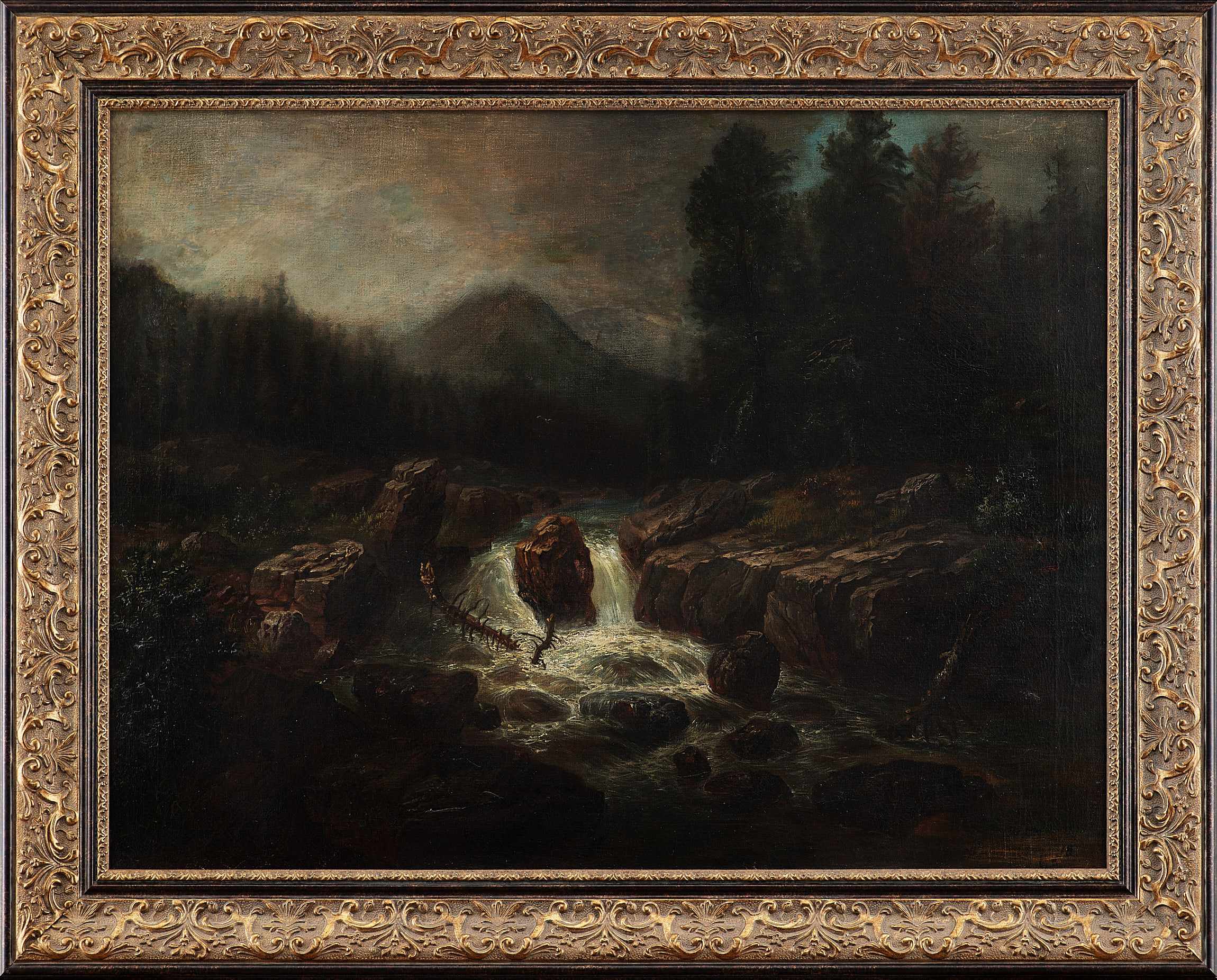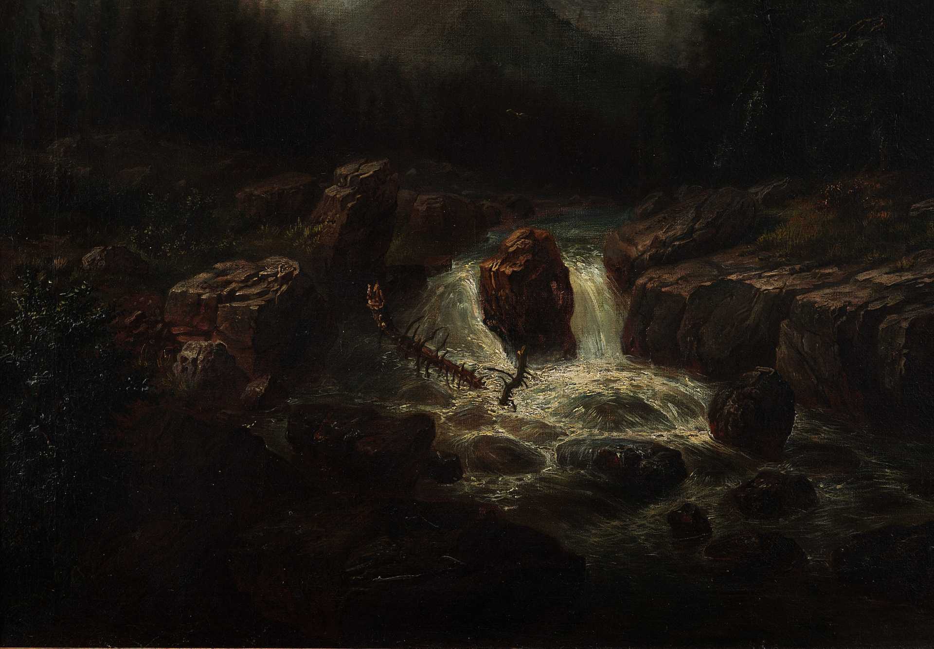 Представлен пейзаж с видом на широкое каменистое ущелье. Среди камней на зрителя несет свои воды бурная река. Быстрые воды несут обломки поваленных деревьев, и словно готовы сдвинуть камни. Освещенное таинственным светом бушу ющее русло притягивает к себе внимание, отвлекая взгляд от сумеречной горной цепи на заднем плане и застывших по обеим сторонам грозных деревьев.