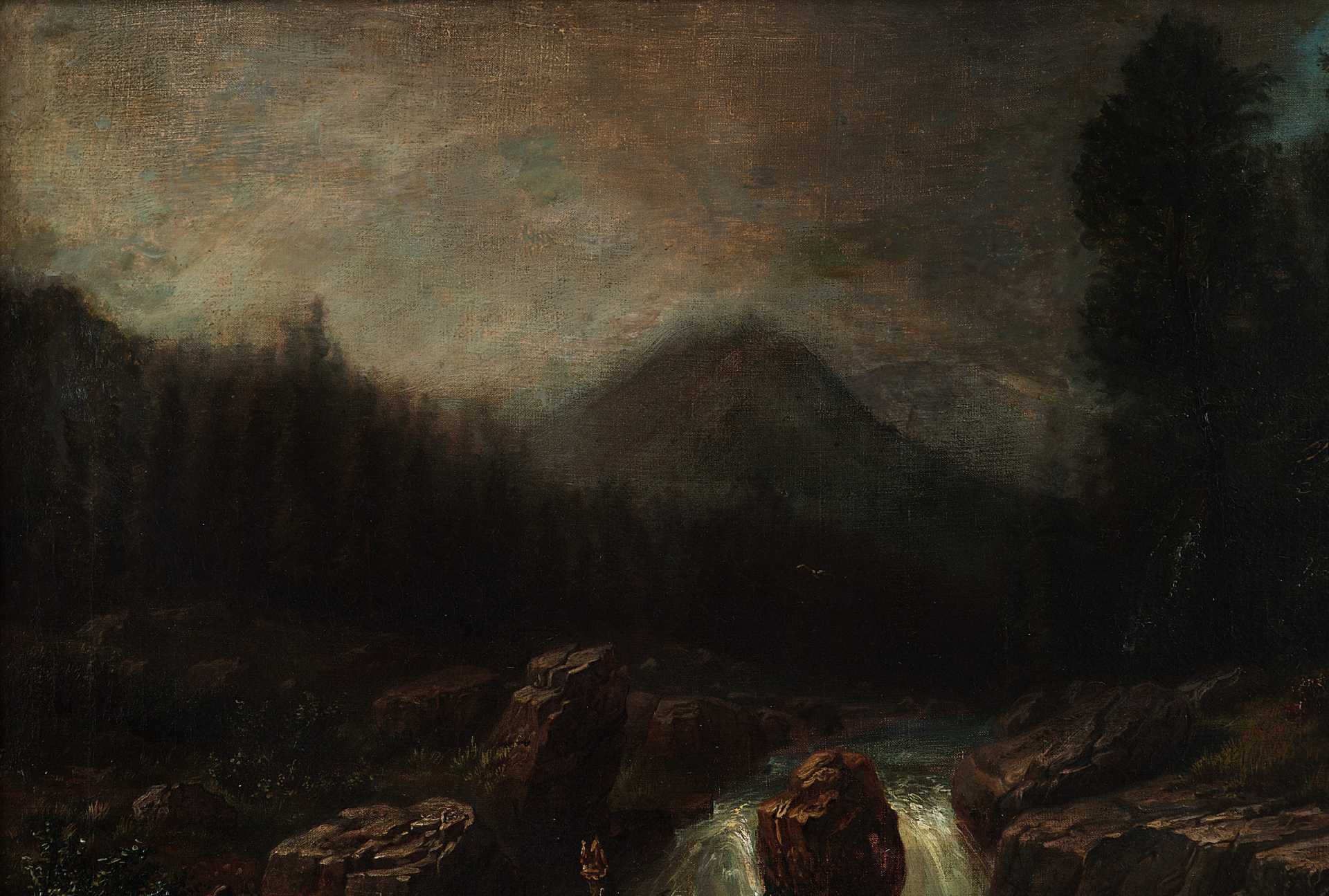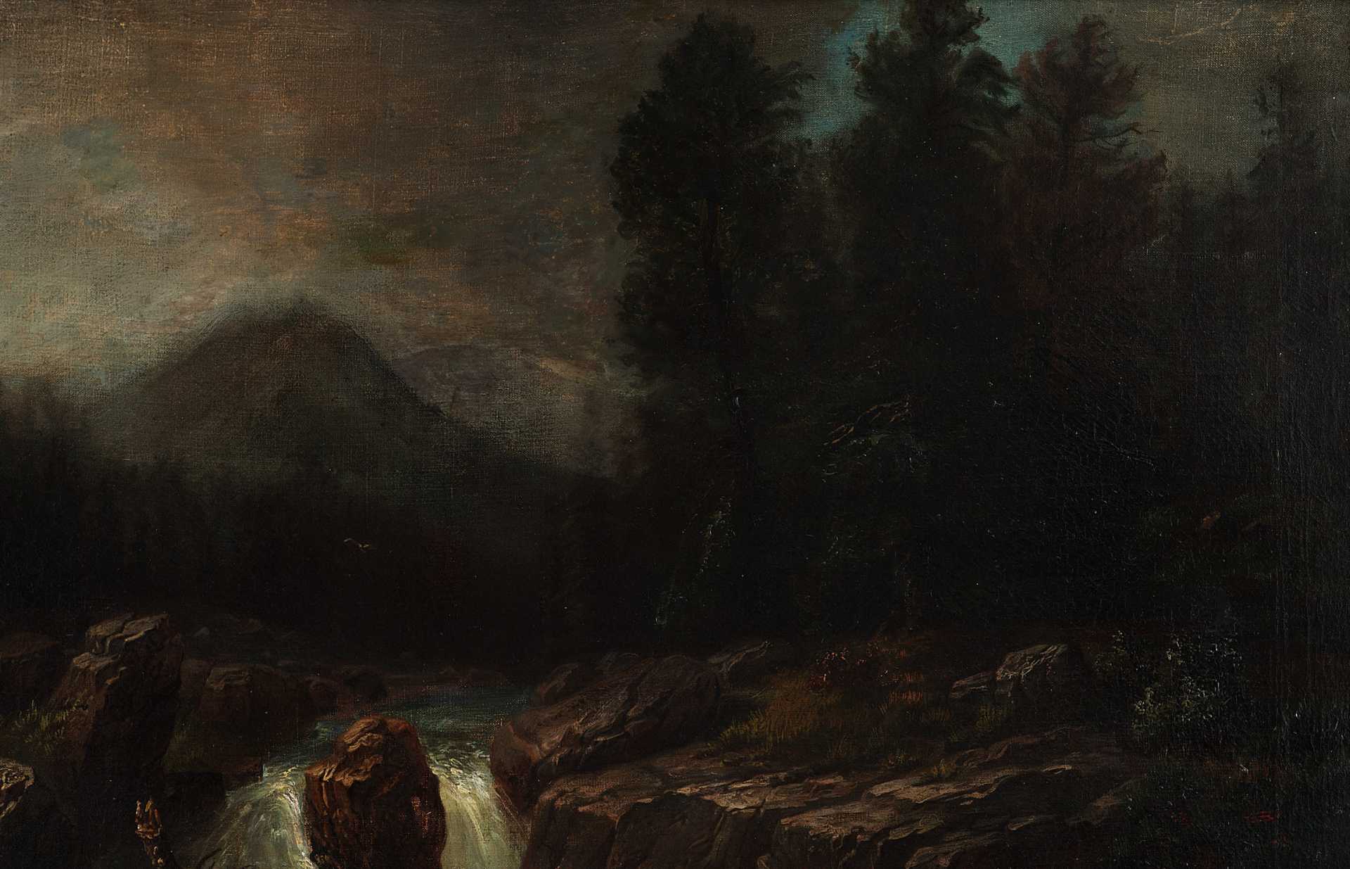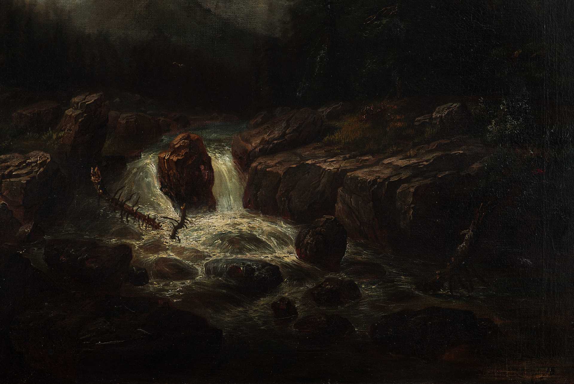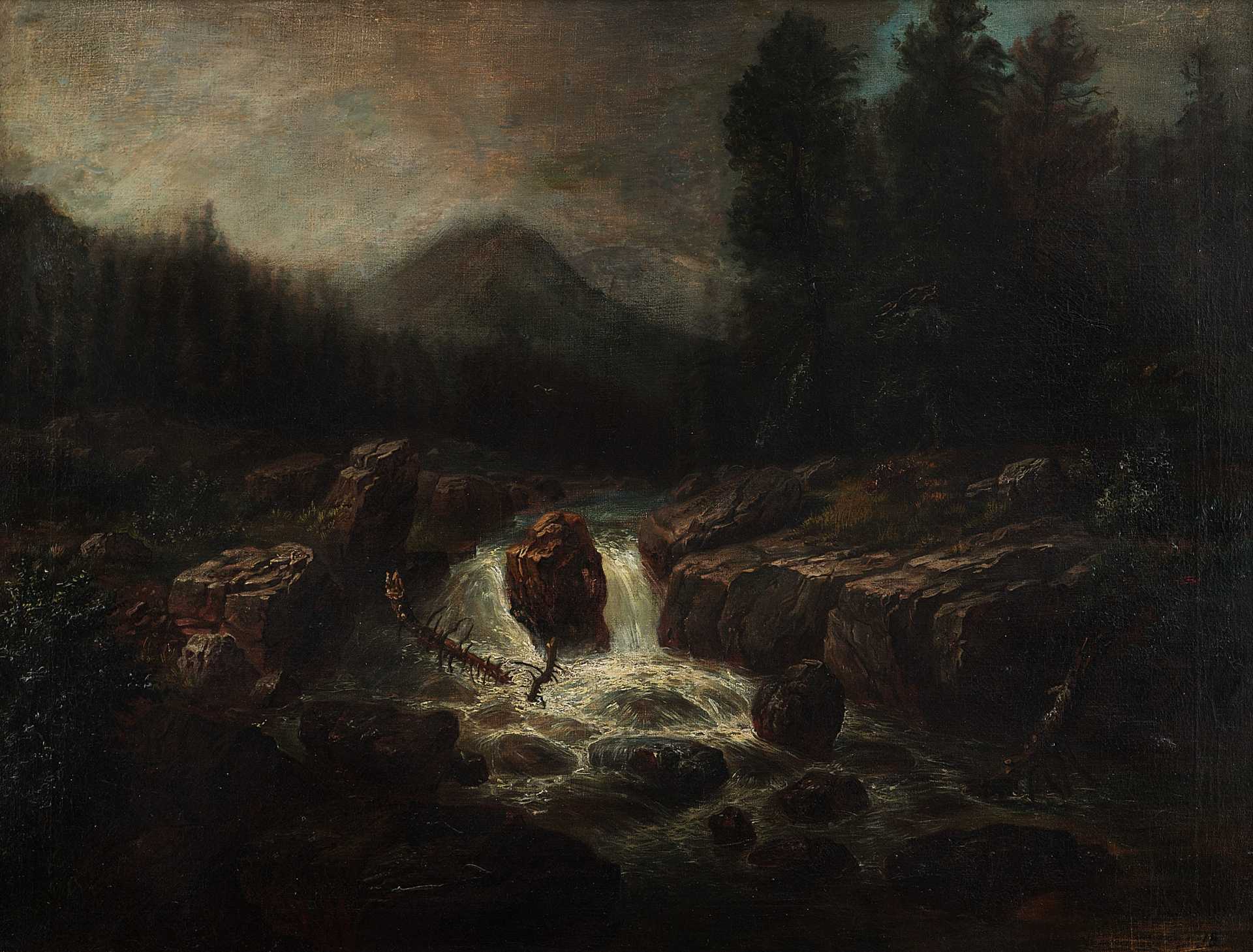 Представлен пейзаж с видом на широкое каменистое ущелье. Среди камней на зрителя несет свои воды бурная река. Быстрые воды несут обломки поваленных деревьев, и словно готовы сдвинуть камни. Освещенное таинственным светом бушу ющее русло притягивает к себе внимание, отвлекая взгляд от сумеречной горной цепи на заднем плане и застывших по обеим сторонам грозных деревьев.