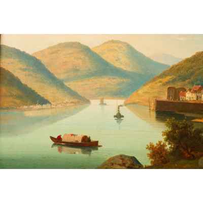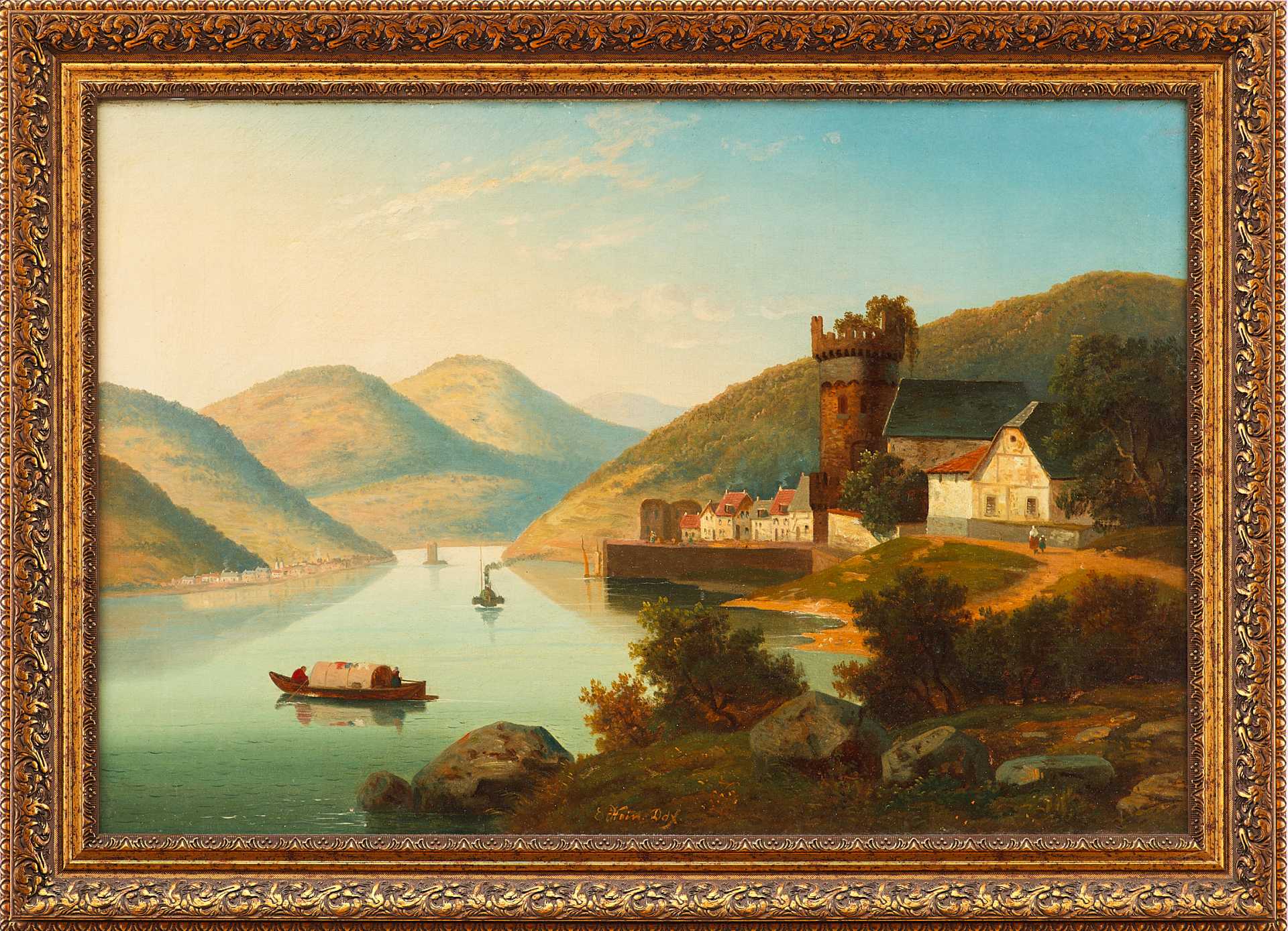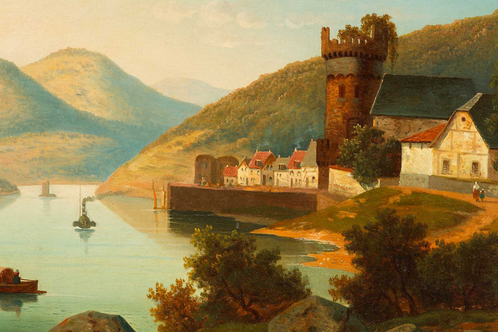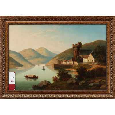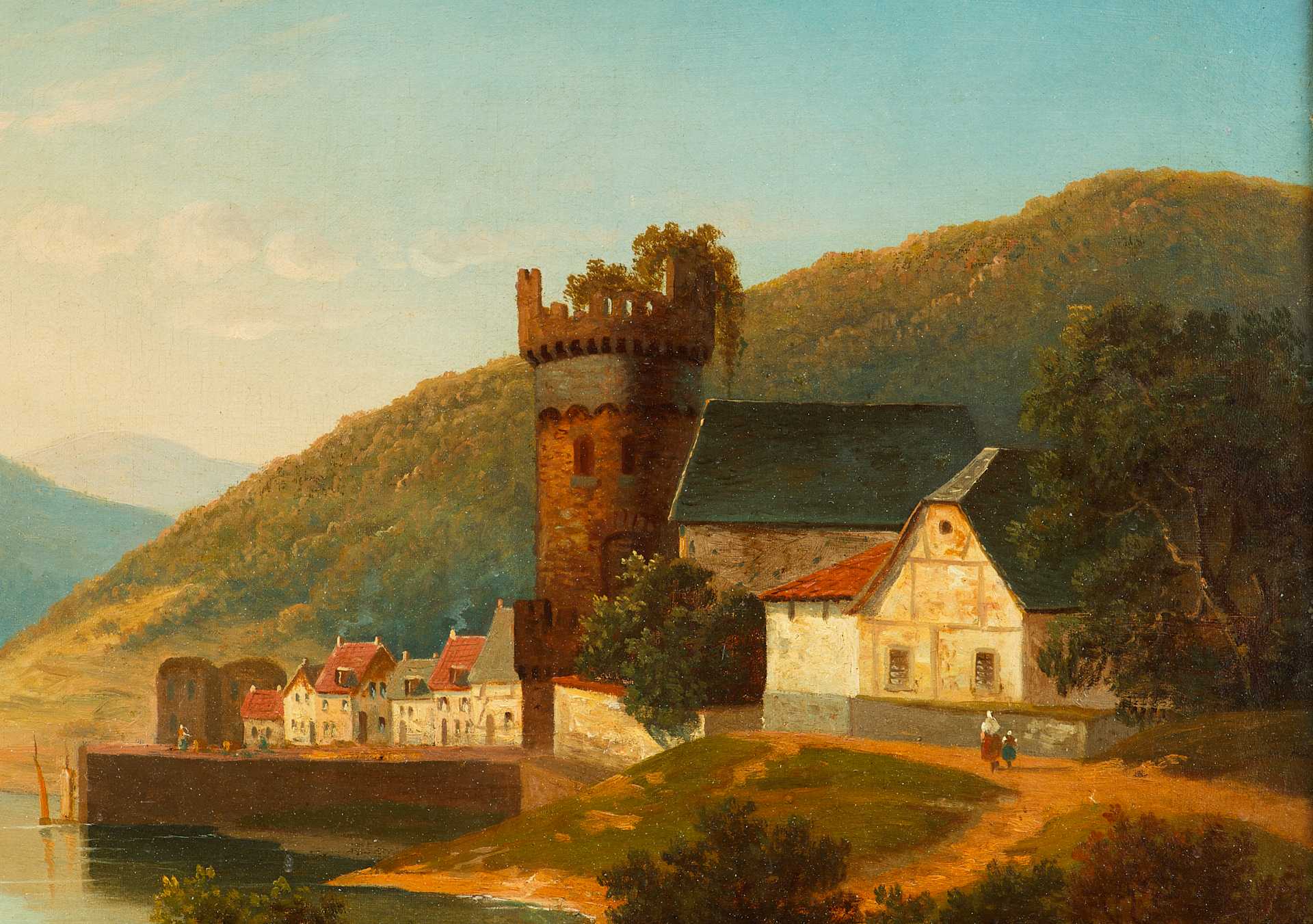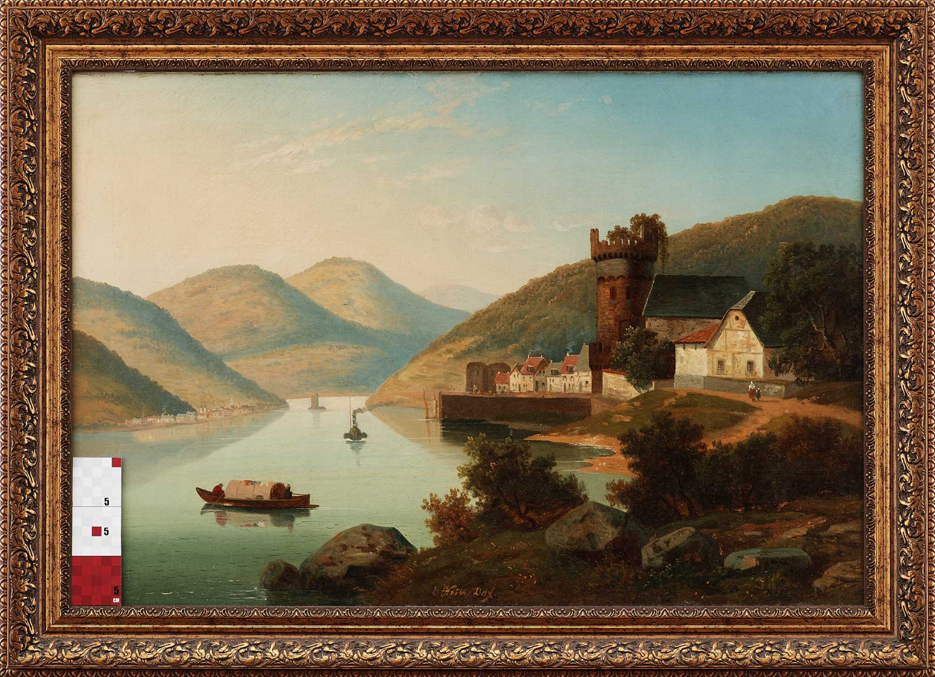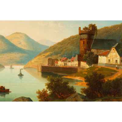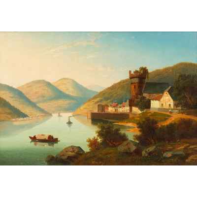 На картине изображён живописный вид долины реки Рейн, одного из важнейших культурных и исторических ландшафтов Европы. На переднем плане — спокойная водная гладь с двумя судами: парусником и крытой баржей. По правому берегу возвышается сторожевая башня, к которой примыкают дома с яркими крышами, а на заднем плане разворачивается панорама холмов, утопающих в мягком солнечном свете. Отражение гор и зданий в воде усиливает чувство глубины и умиротворённости.