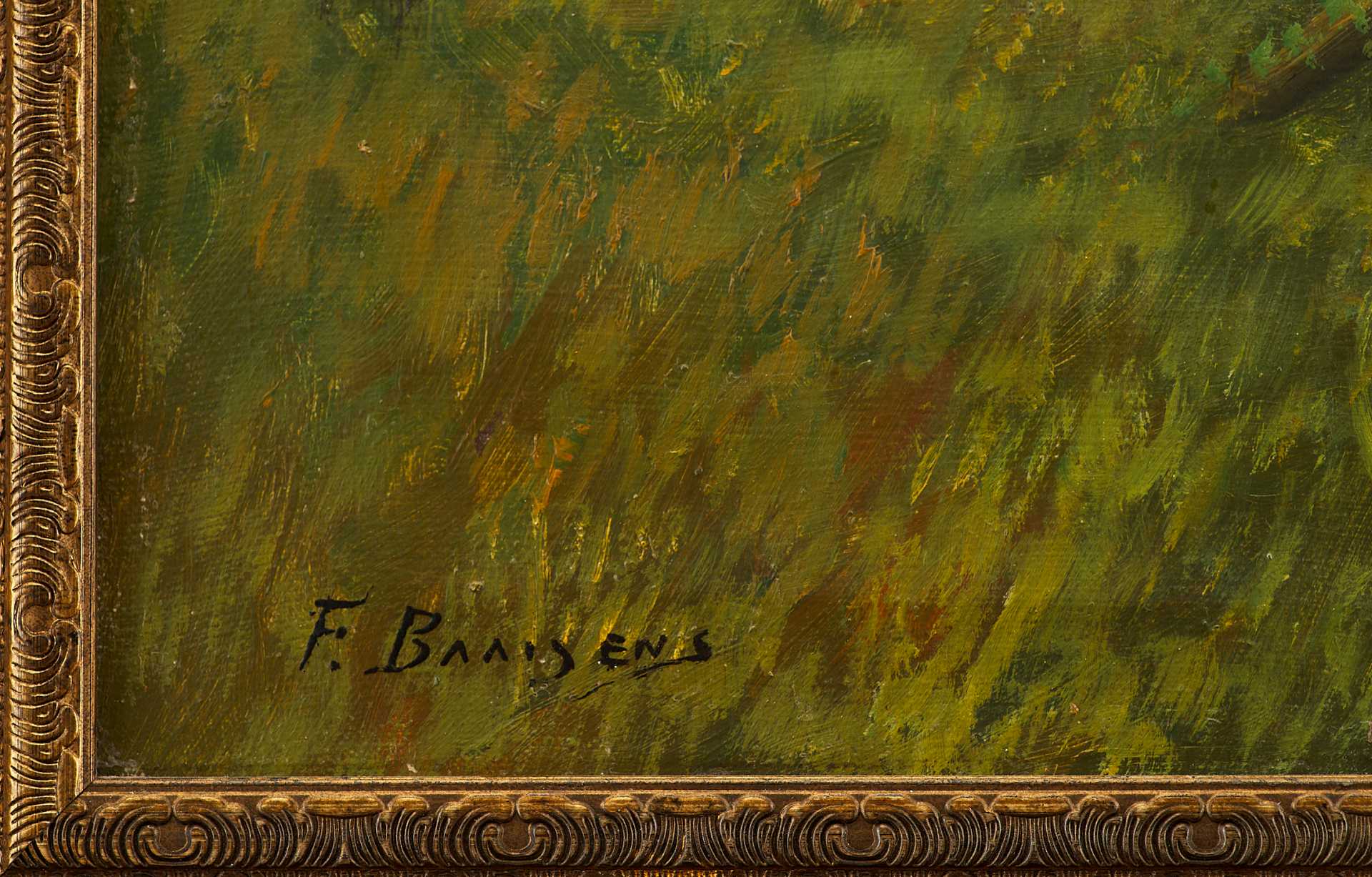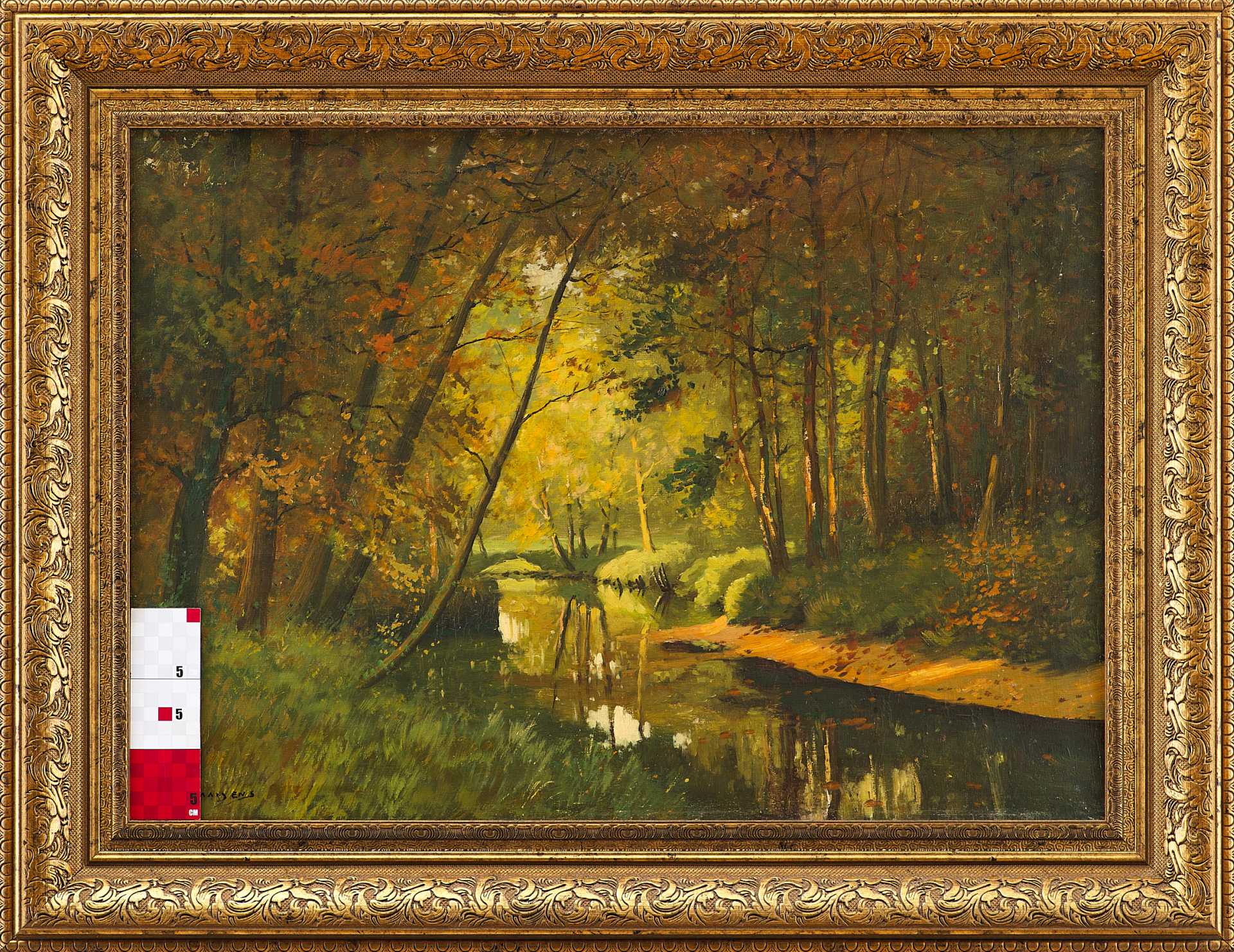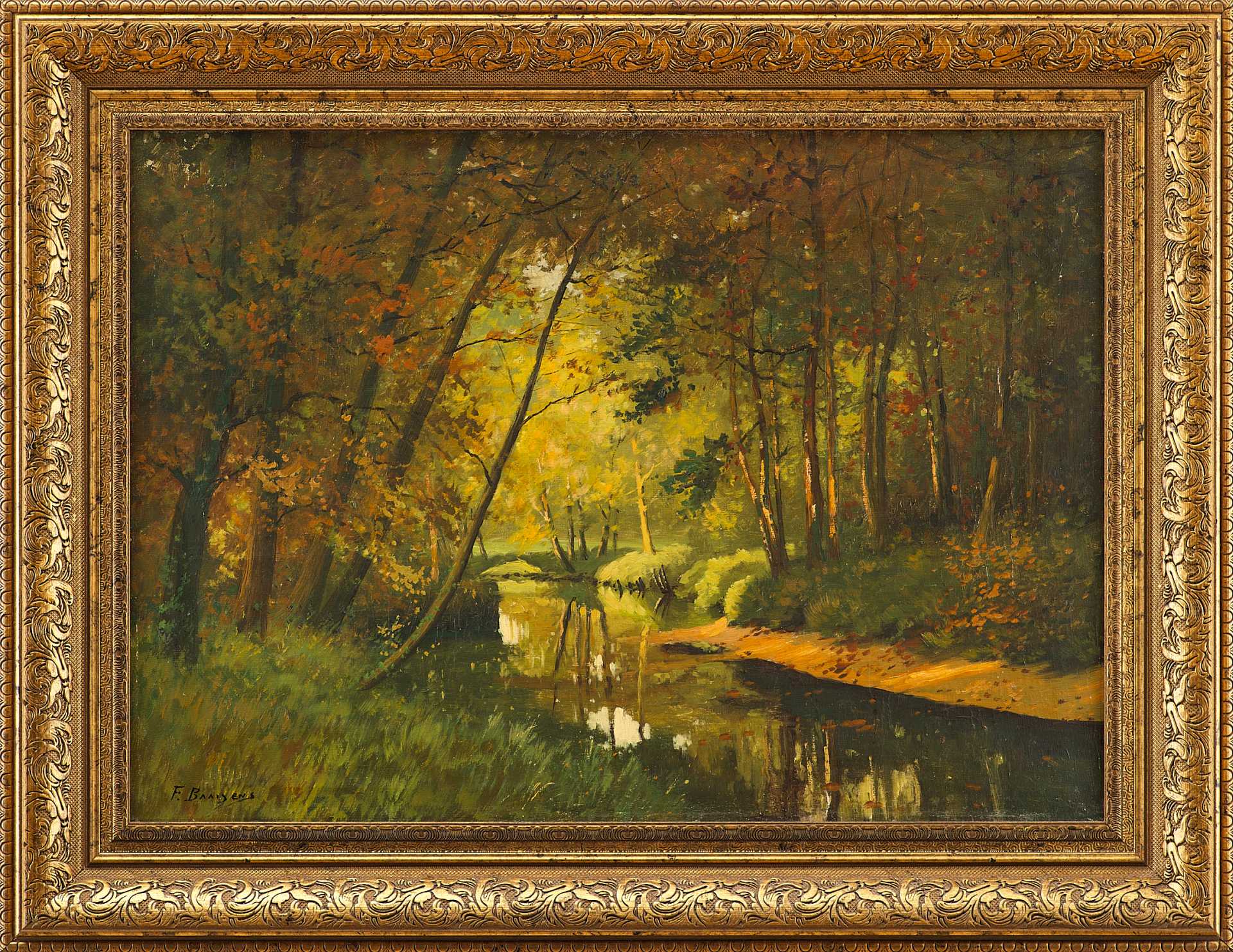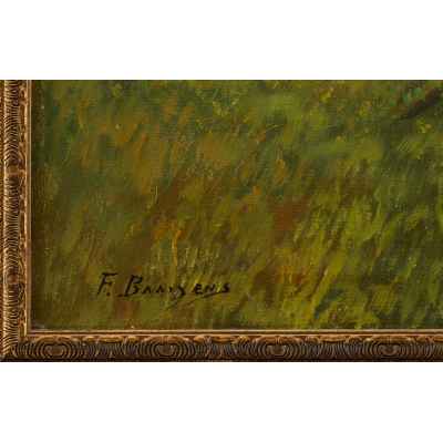 Картина «Пейзаж с речкой в лесу» принадлежит кисти Franciscus Baaijens — голландского живописца, активно работавшего в второй трети XX века. Полотно выполнено в технике масляной живописи по холсту и подписано художником в нижнем левом углу: «F. Baaijens», что подтверждено экспертной атрибуцией. Композиция представляет собой типичный для мастера лесной пейзаж, погружённый в мягкий вечерний свет с доминированием золотисто-зелёной гаммы.