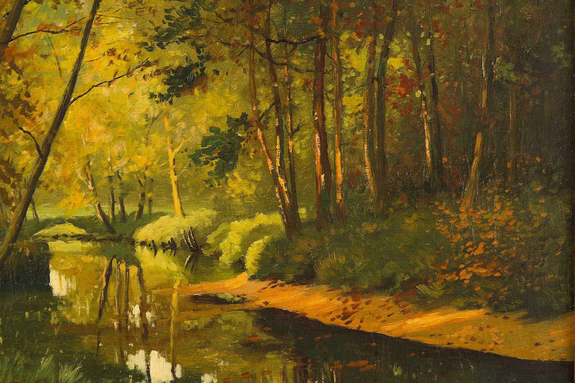 На картине изображена небольшая река, текущая сквозь осенний лес. Свет, пробивающийся сквозь листву, оживляет лиственные кроны и освещает береговую линию. Отражения деревьев в спокойной воде создают ощущение тишины и безмятежности. Автор передаёт переходное состояние природы, когда на зелёную траву уже ложатся первые жёлтые и красноватые листья — момент, наполненный задумчивостью и предощущением перемен.