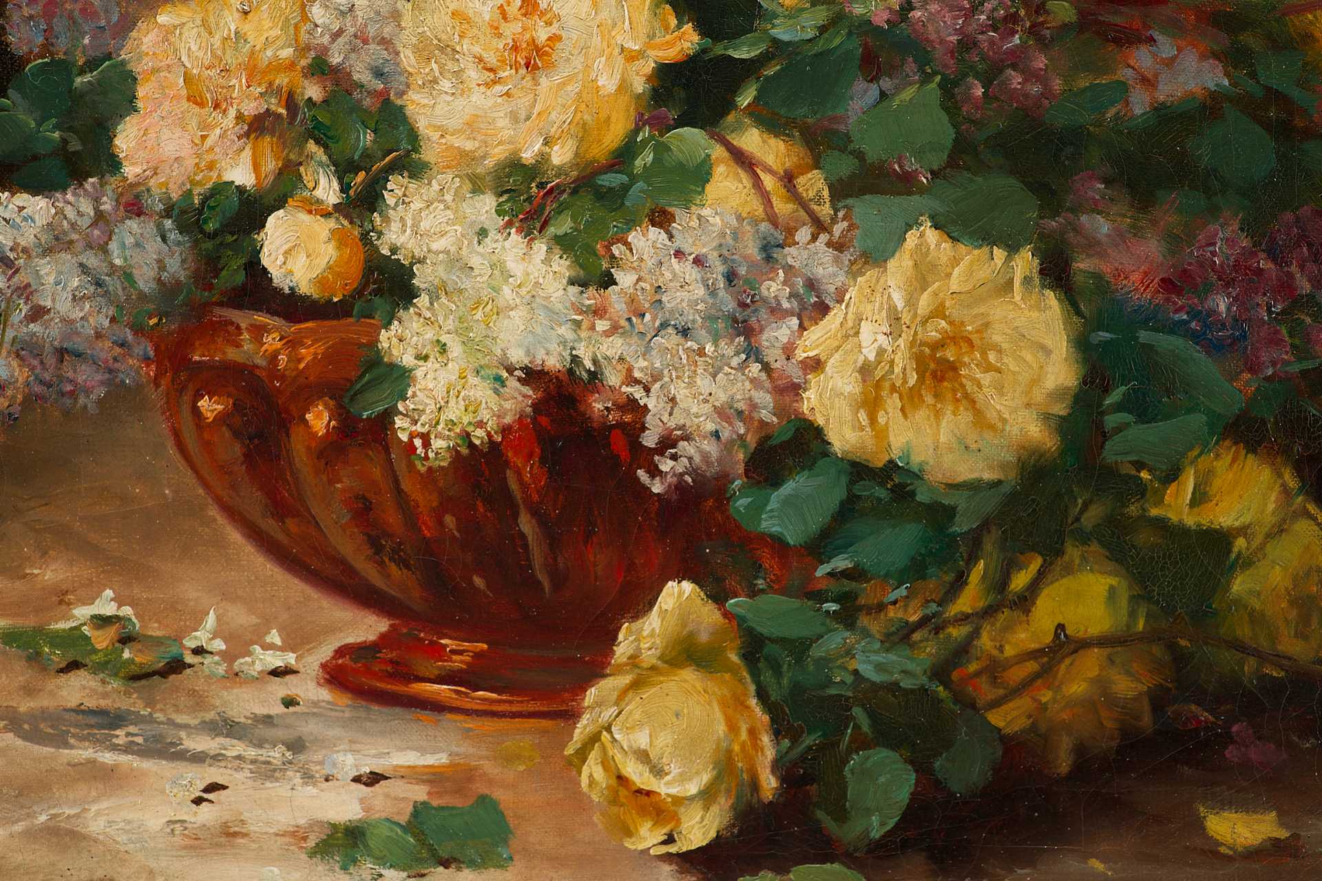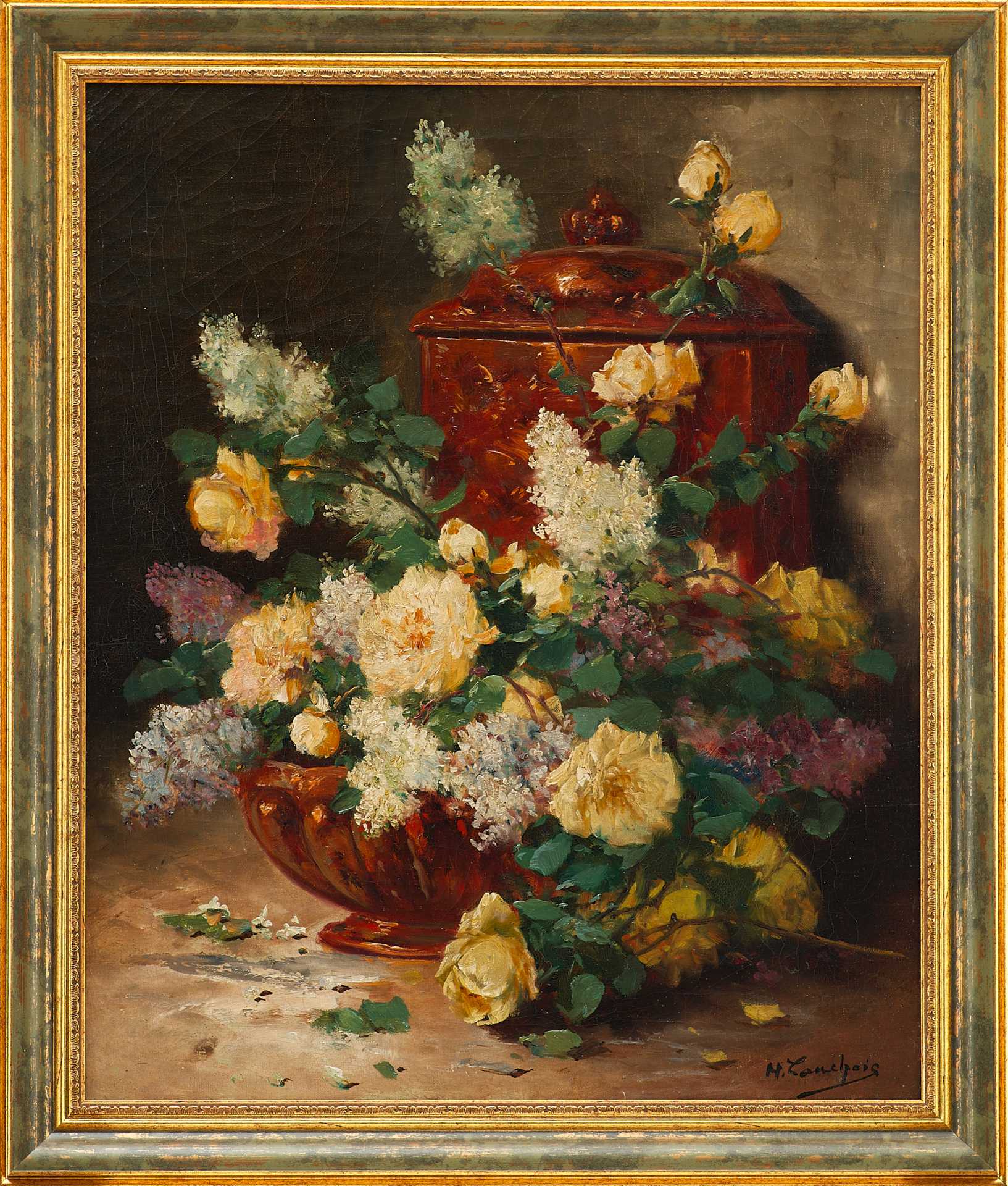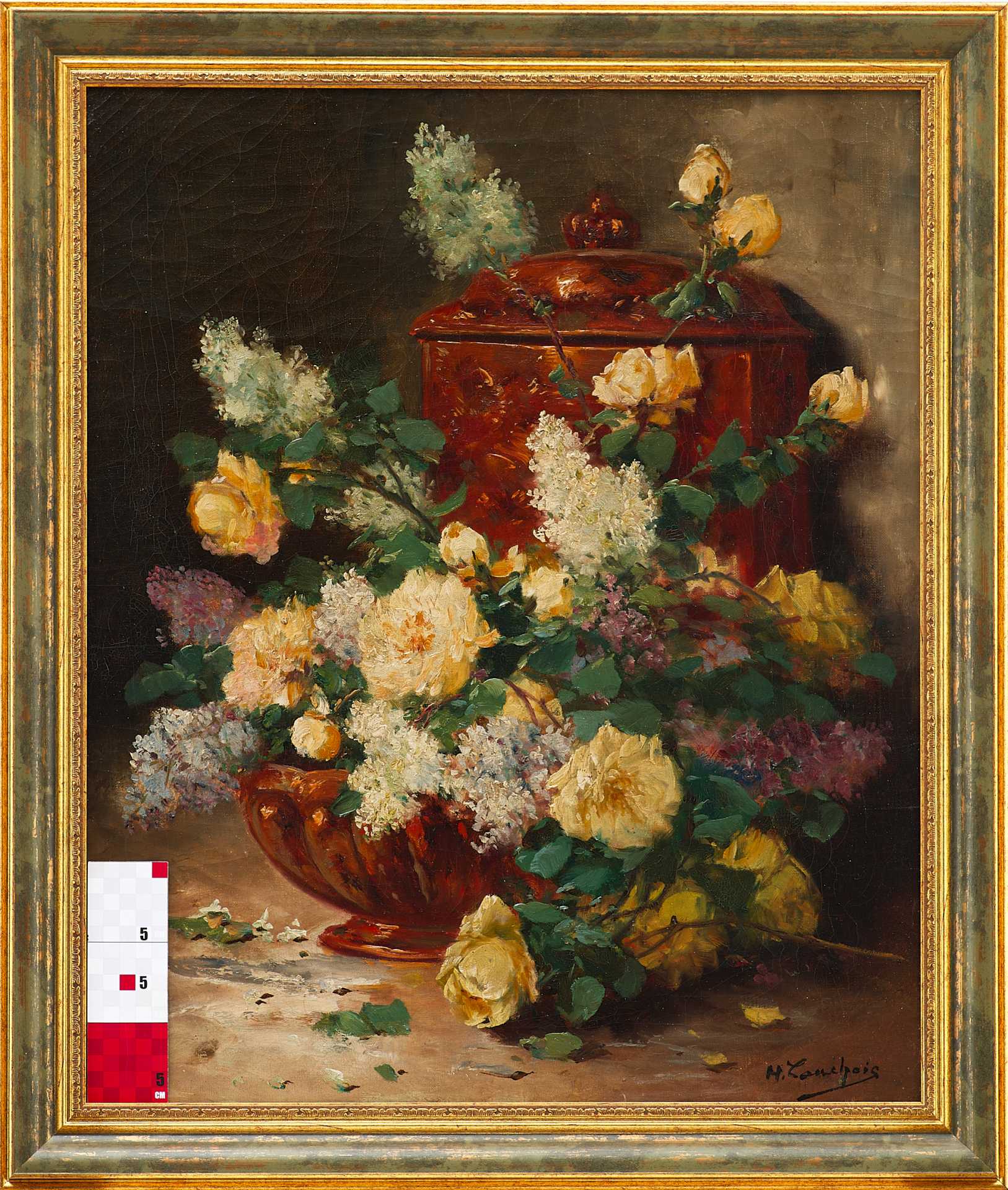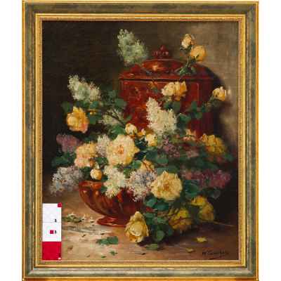 Картина «Розы и сирень» принадлежит кисти Henry Conchois, английского художника, специализировавшегося на жанре натюрморта. Работа была создана в последней четверти XIX века, в период, когда художник жил и работал в Лондоне, и отличается высоким профессиональным уровнем исполнения.