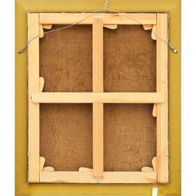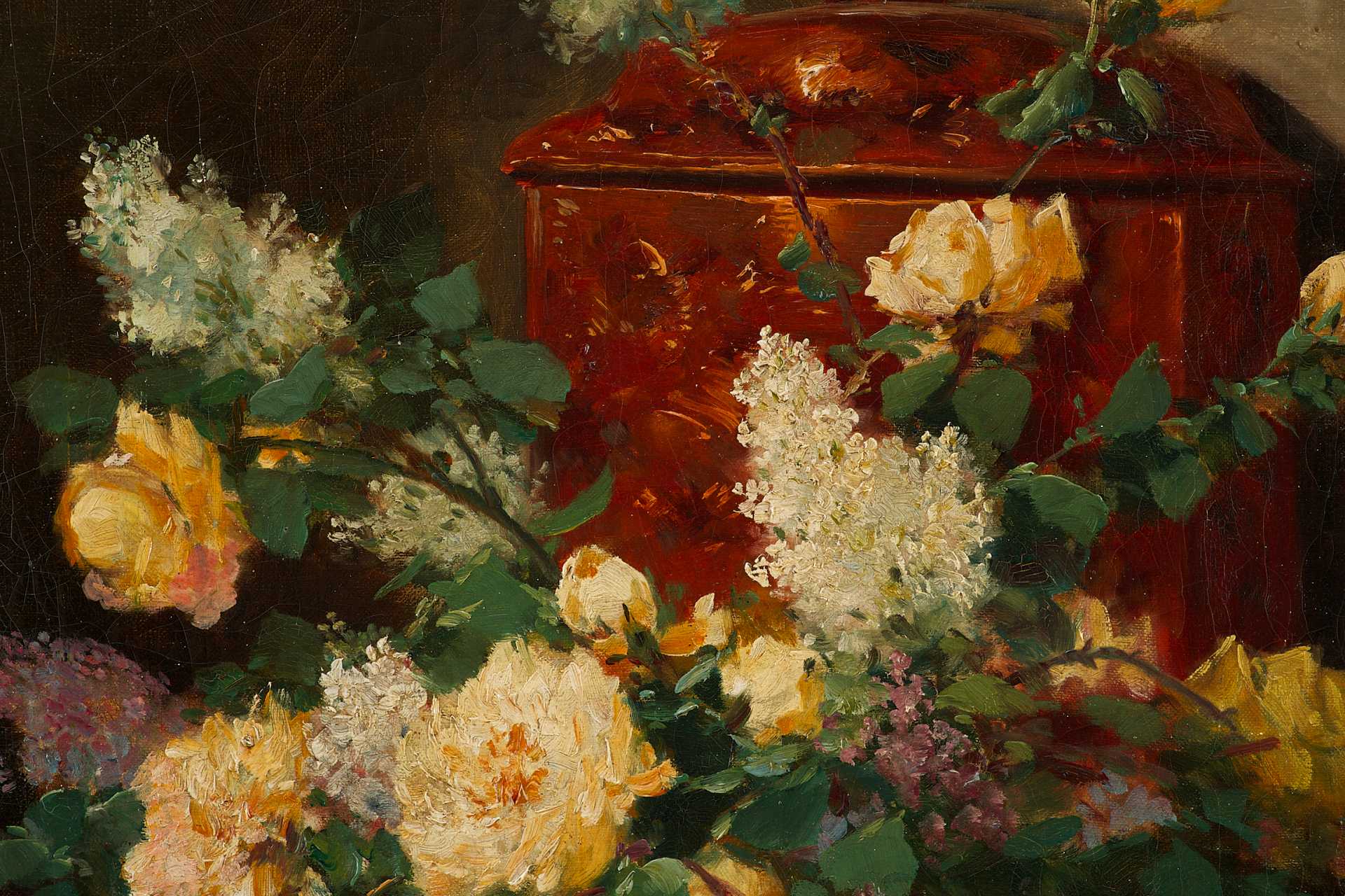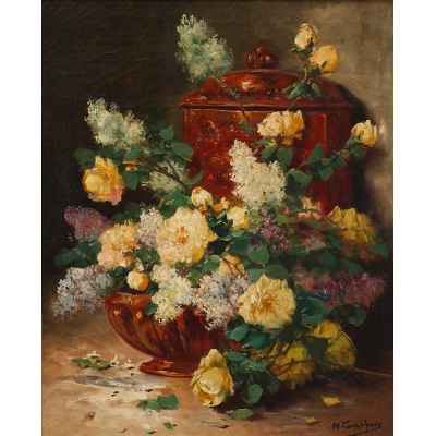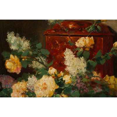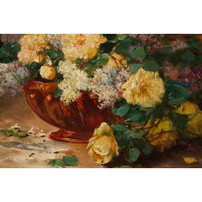 На полотне изображён изысканный натюрморт с ветвями жёлтых роз и соцветиями сирени, помещёнными в тяжёлую декоративную вазу насыщенного бордового цвета. Позади вазы расположен керамический сосуд с крышкой, придающий композиции ощущение глубины и объёма. Цветы выписаны с большой точностью и вниманием к деталям: сирень передана множеством мелких мазков, подчёркивающих её хрупкость, а розы — плотными лепестками с яркими оттенками и живописной текстурой.