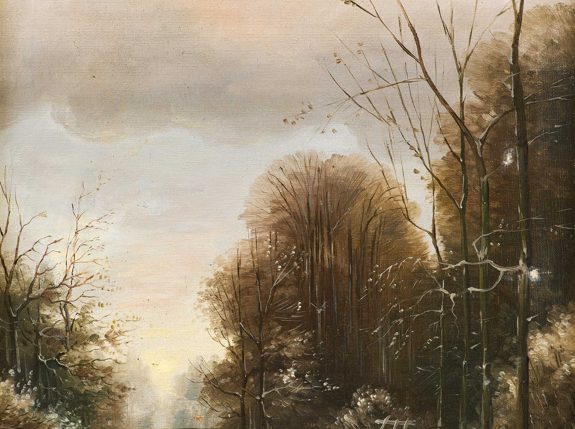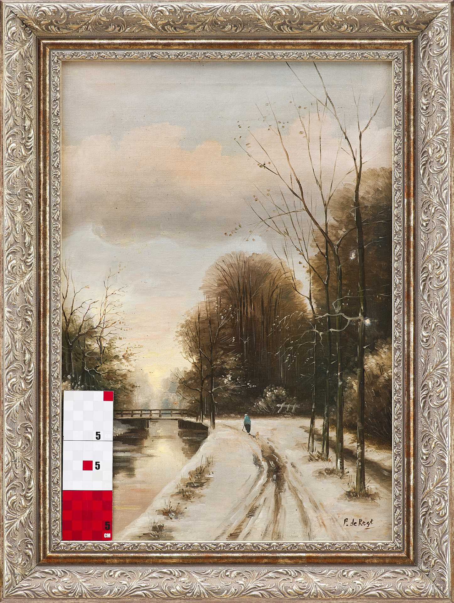 Перед нами картина «Зимний пейзаж», созданная художником Питером де Регтом (Pieter de Regt), представителем Гаагской школы. Полотно выполнено в 1920-х годах и отражает характерную для мастера тему зимней природы, уединения и спокойствия.