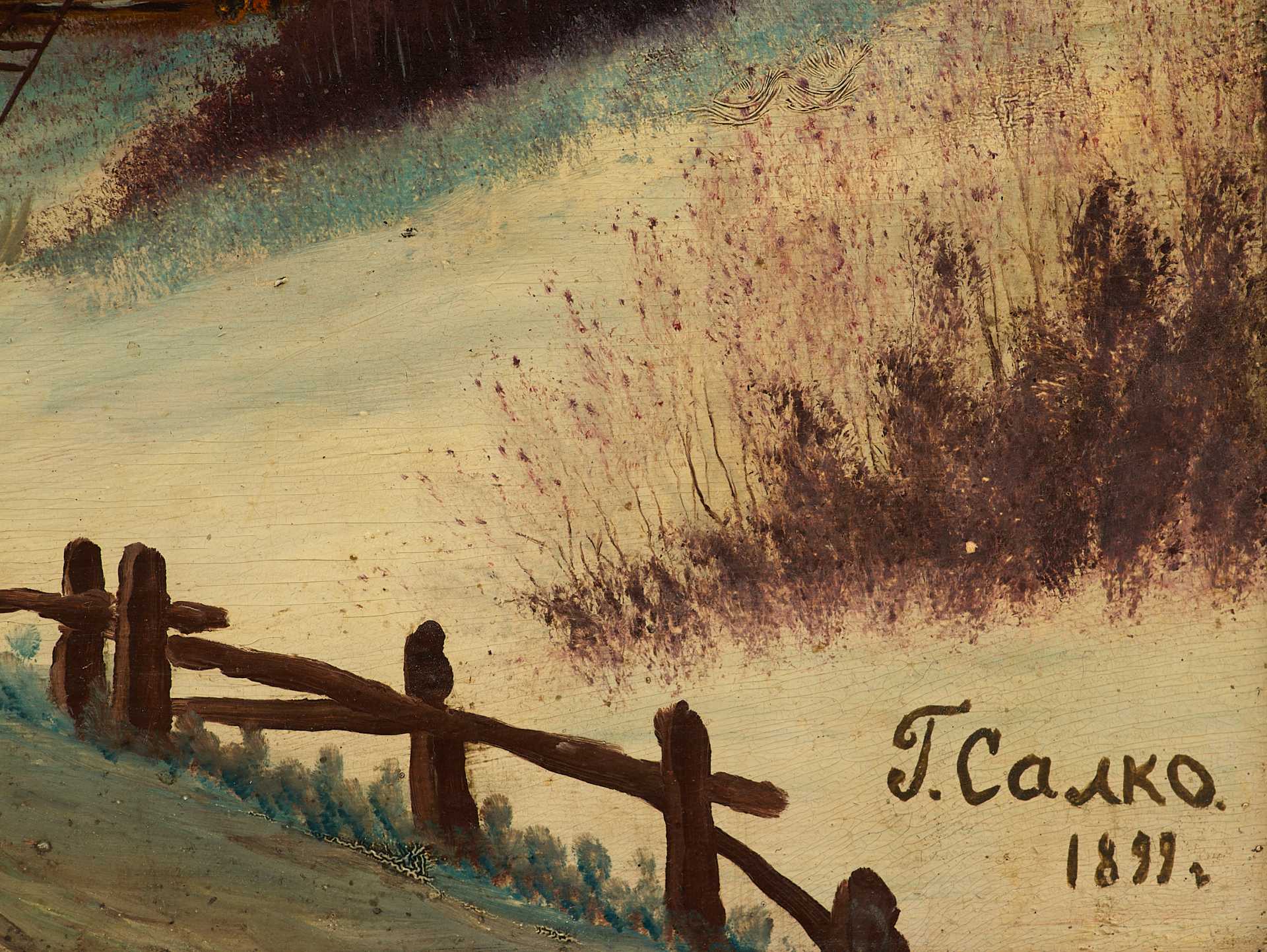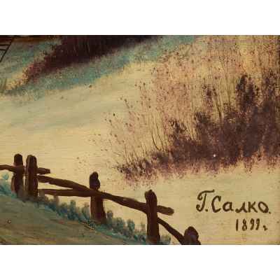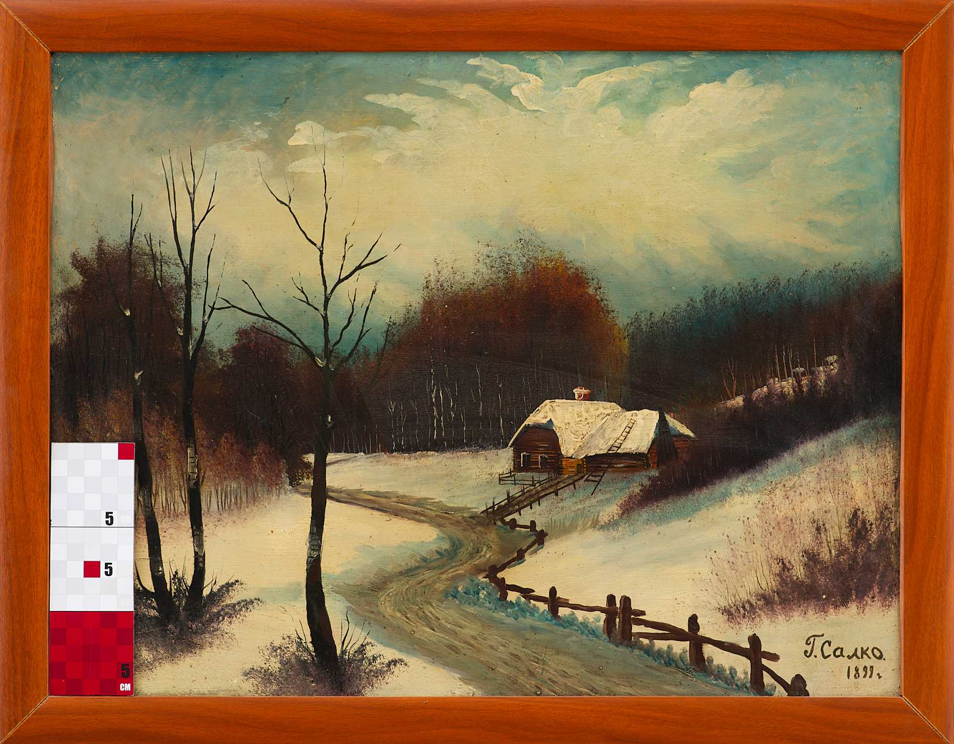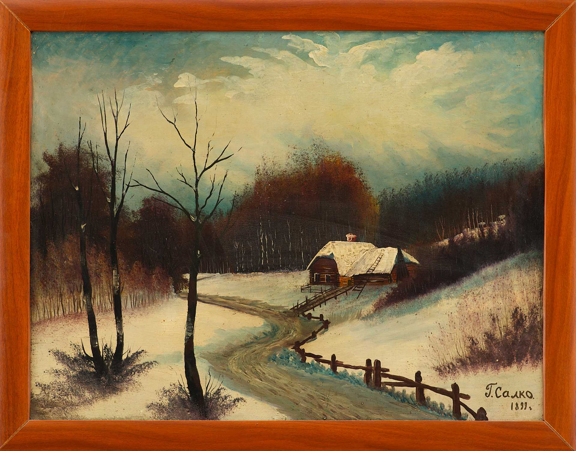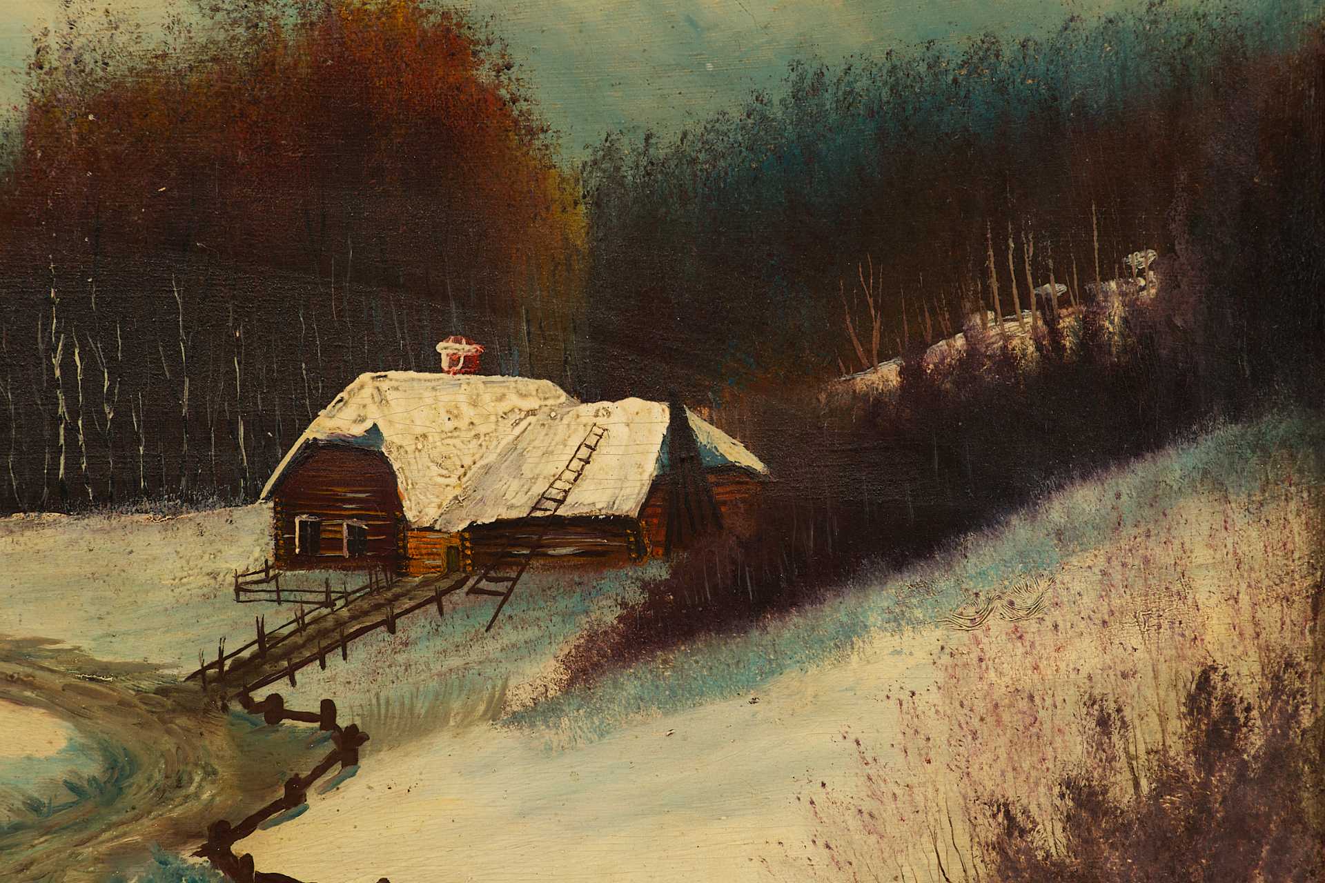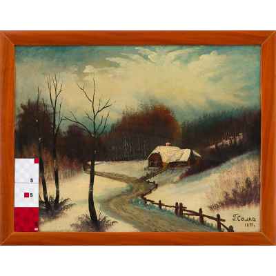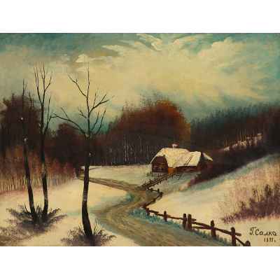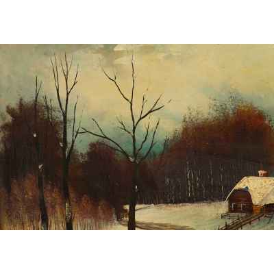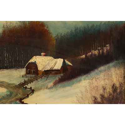 Композиция разворачивается вокруг извилистой заснеженной дороги, ведущей к одинокому сельскому дому с покатой крышей. Дом окружён лесом, деревья которого изображены в сдержанных, почти монохромных оттенках. Облачное небо и мягкий свет создают эффект глубины и приглушённой зимней тишины. Мастерски передано настроение предвечернего часа: свет в небе постепенно меркнет, подчёркивая уединённость и покой окружающей природы. На переднем плане — тонкая деревянная изгородь, добавляющая картине ощущение сельской аутентичности.