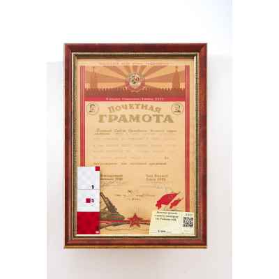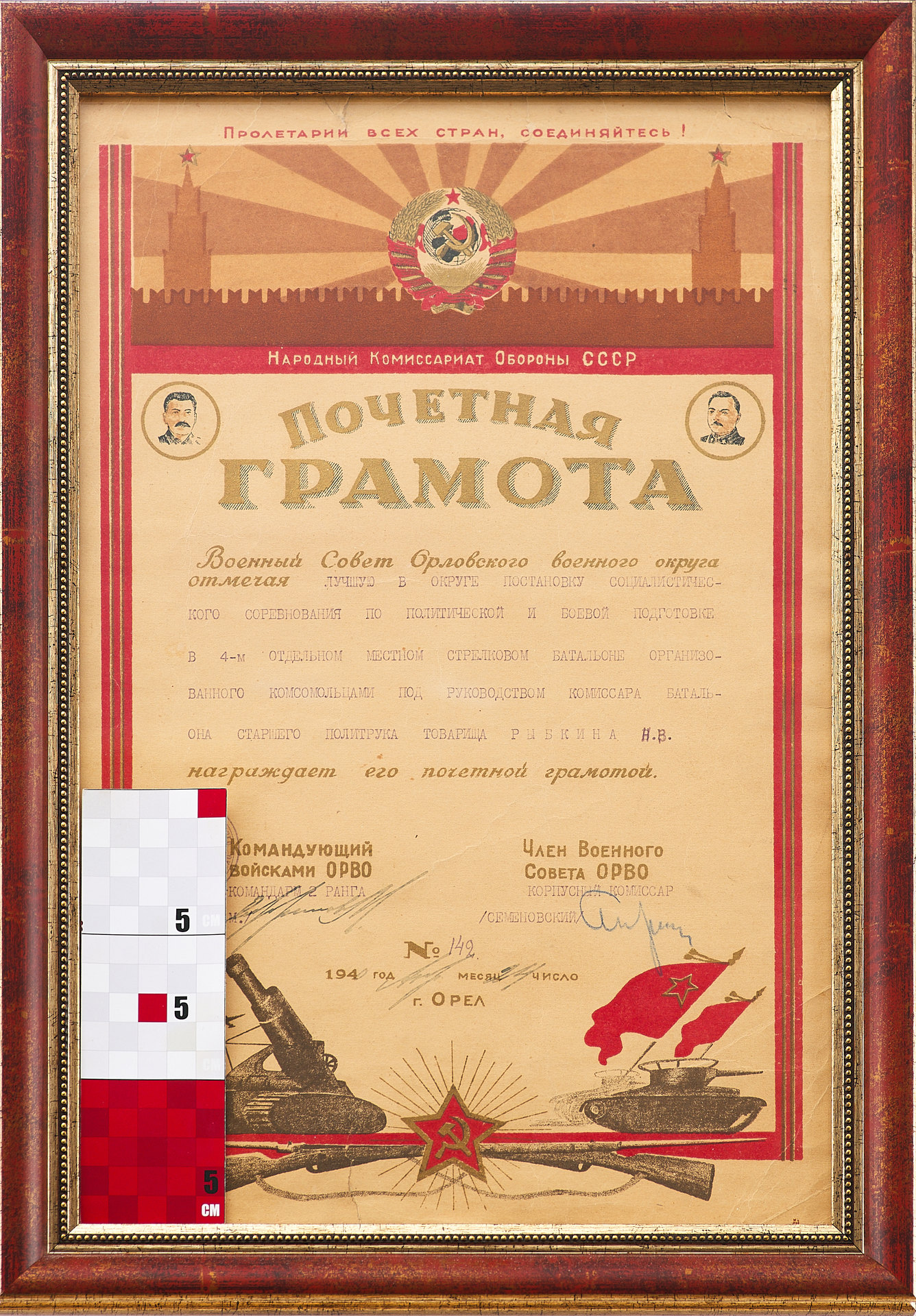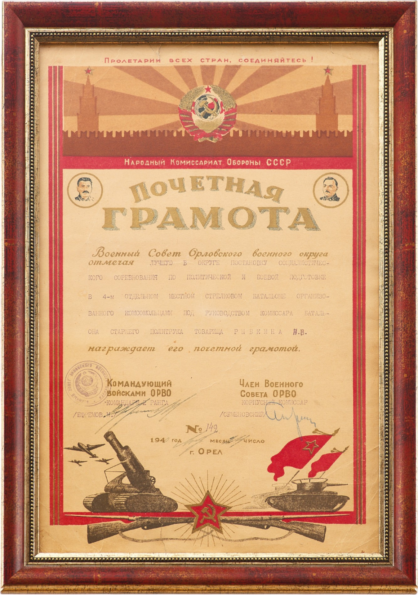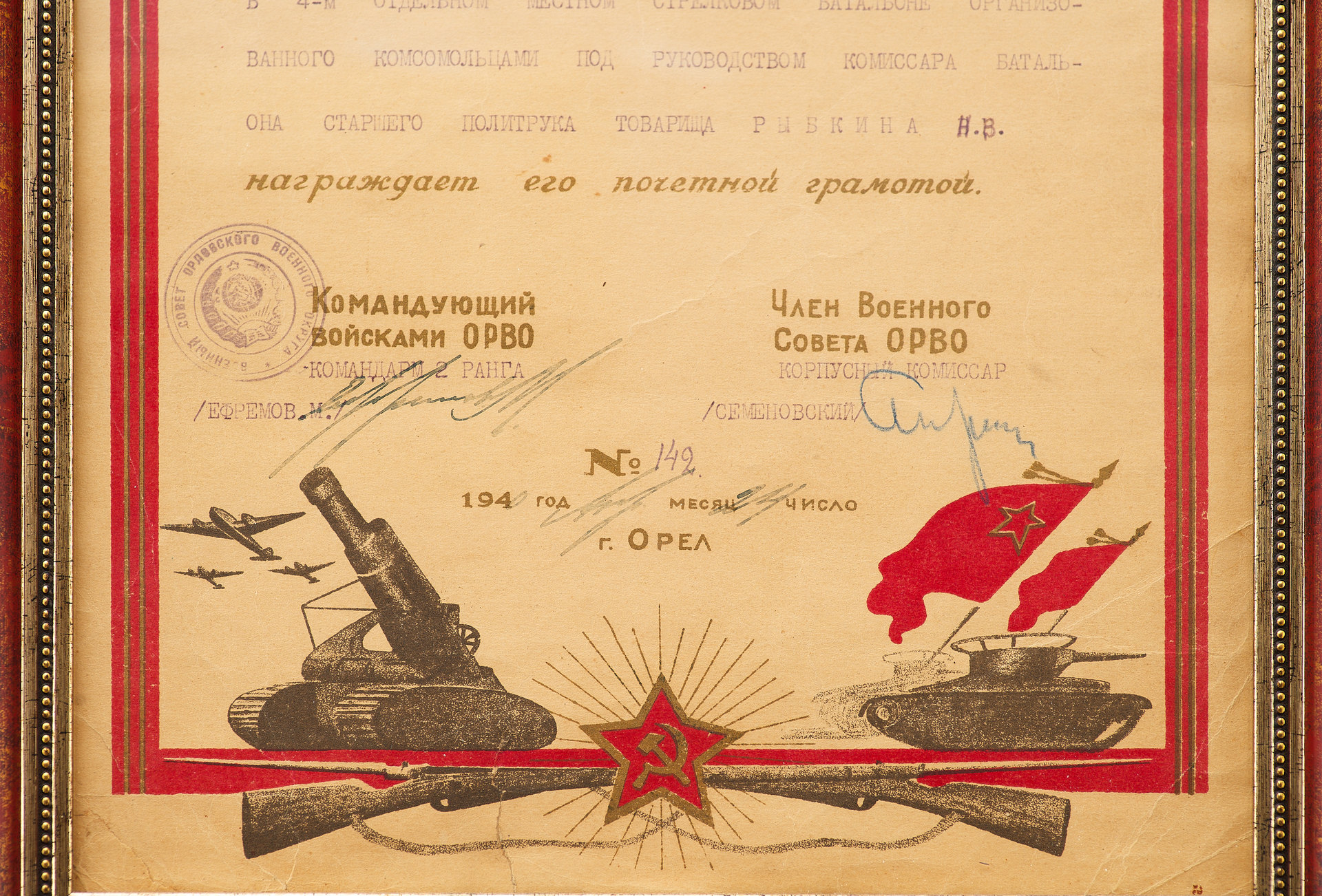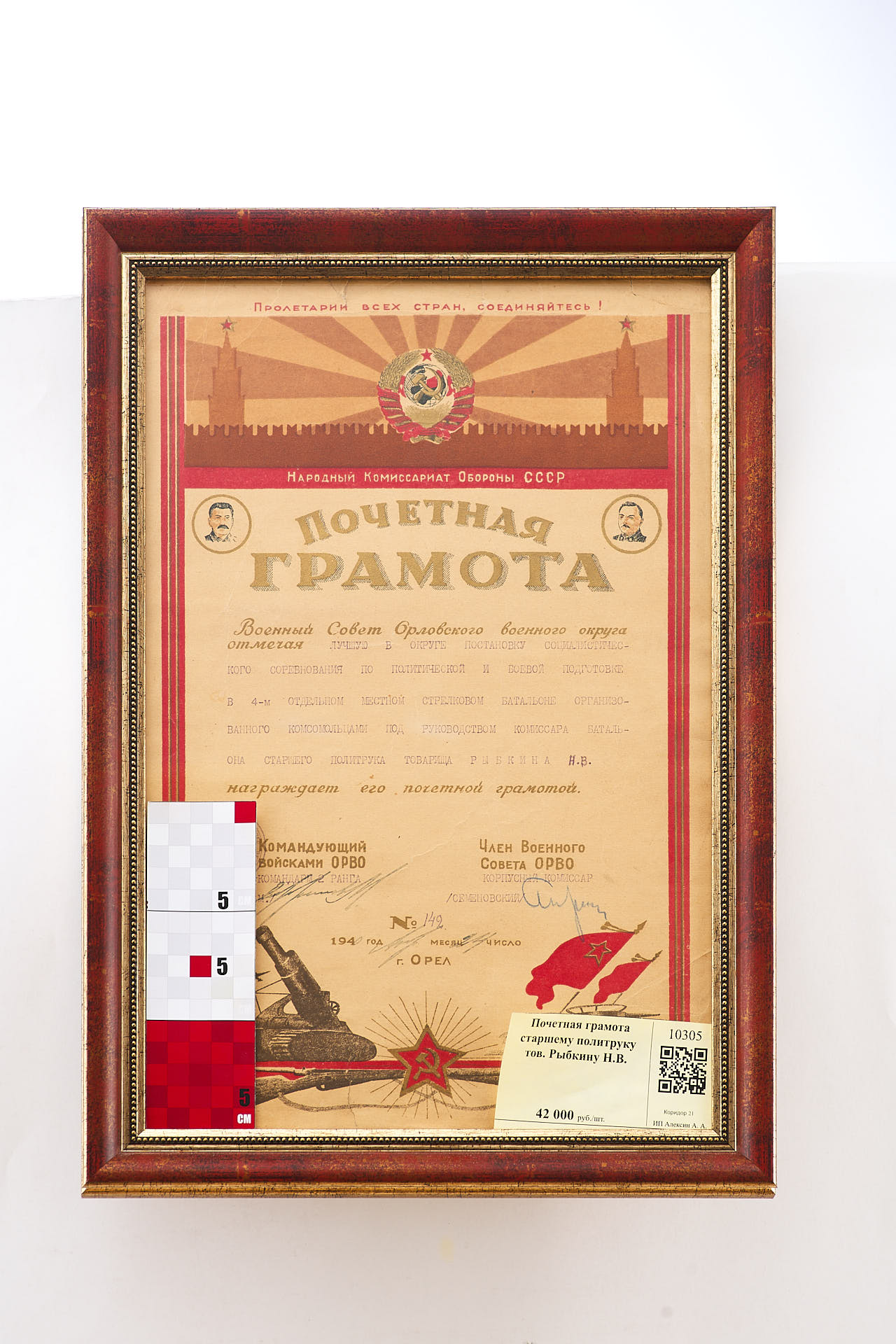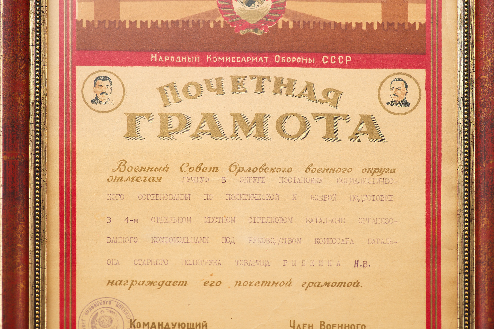 Представлена почетная грамота №142 , врученная старшему политруку тов.Рыбкину Н.В. Военным Советом Орловского военного округа «за лучшую в округе постановку социалистического соревнования по политической и боевой подготовке в 4-ом отдельном местном стрелковом батальоне, организованного комсомольцами под руководством комиссара батальона старшего политрука товарища Рыбкина Н.В.»