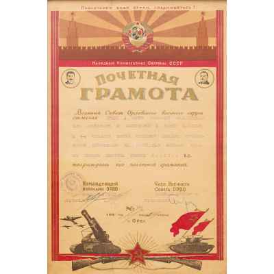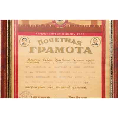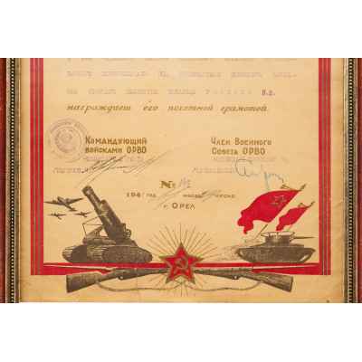 На грамоте присутствуют подписи Командующего войсками ОРВО, командарма 2-го ранга Ефремова М.Г. и Члена Военного Совета ОРВО, корпусного комиссара Семеновского Ф.А. Орловский военный округ (ОрВО) — оперативно-стратегическое