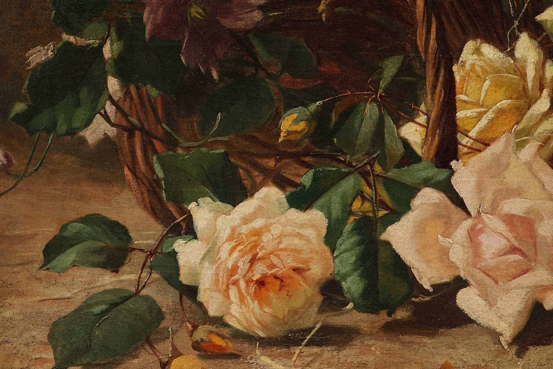 На картине «Дикие розы в корзине» изображена сцена, наполненная изысканной простотой: плетёная корзина опрокинута, и её содержимое — пышные розы разных оттенков — живописно рассыпано по каменному основанию. Цветы, написанные с большой тщательностью и натуралистической выразительностью, варьируются от нежно-розовых до насыщенно-жёлтых и глубоких пурпурных. Листва и стебли переплетаются в живом, слегка хаотичном порядке, придавая композиции лёгкое движение и естественность.