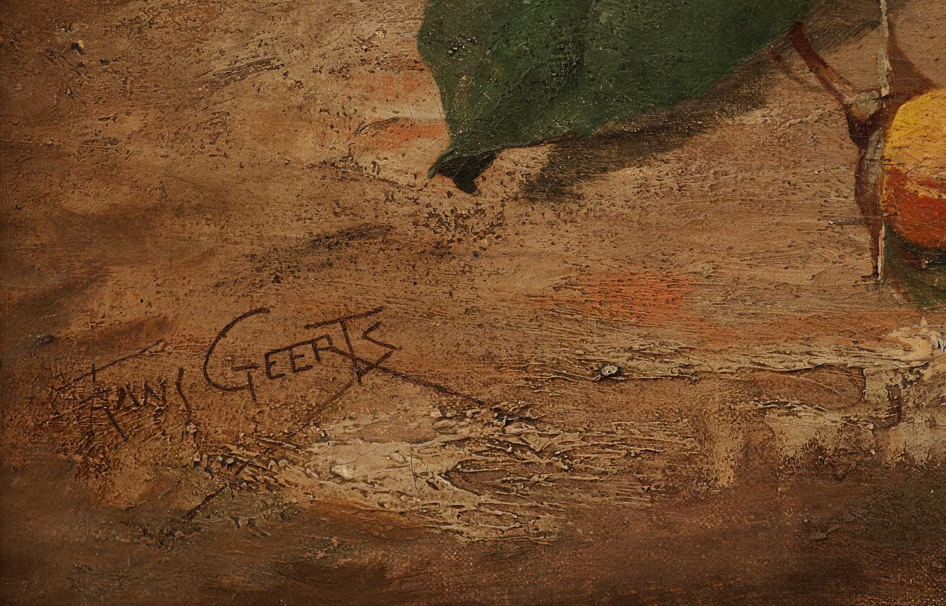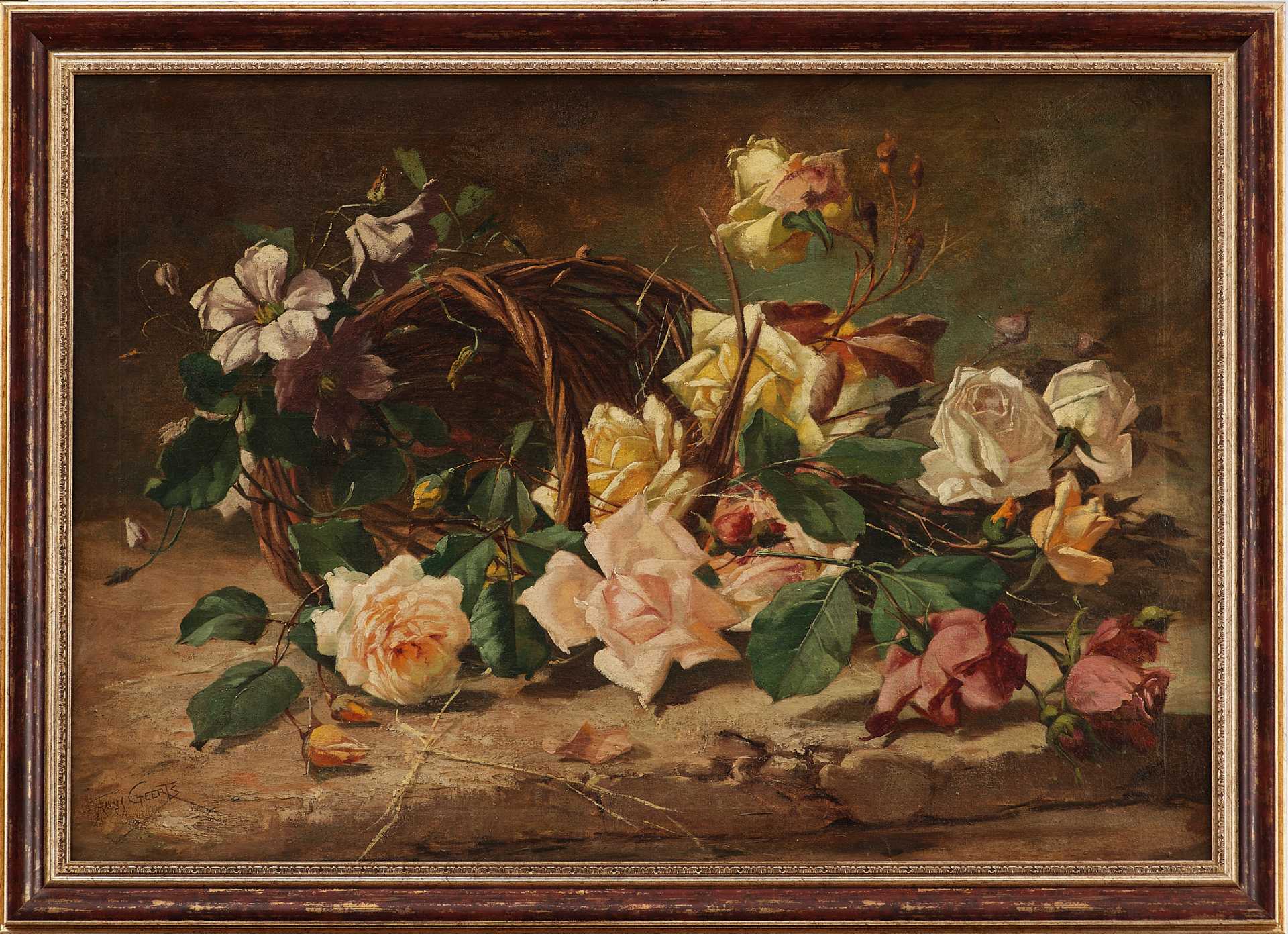 Картина написана в конце XIX века, в Антверпене или Боржехоуте, где художник Франц Франсуа Гиртц (Franz Francois Geerts, 1869–1957) жил и работал. Он учился в Антверпенской академии и испытал влияние барочной школы, в особенности Питера Пауля Рубенса и Антониса ван Дейка. В его творчестве заметна склонность к классическим композициям с богатыми колористическими решениями. Гиртц писал портреты, пейзажи и натюрморты, работал в технике масла, акварели и даже создавал гобелены. Представленная работа отражает его интерес к декоративным и гармоничным образам природы.