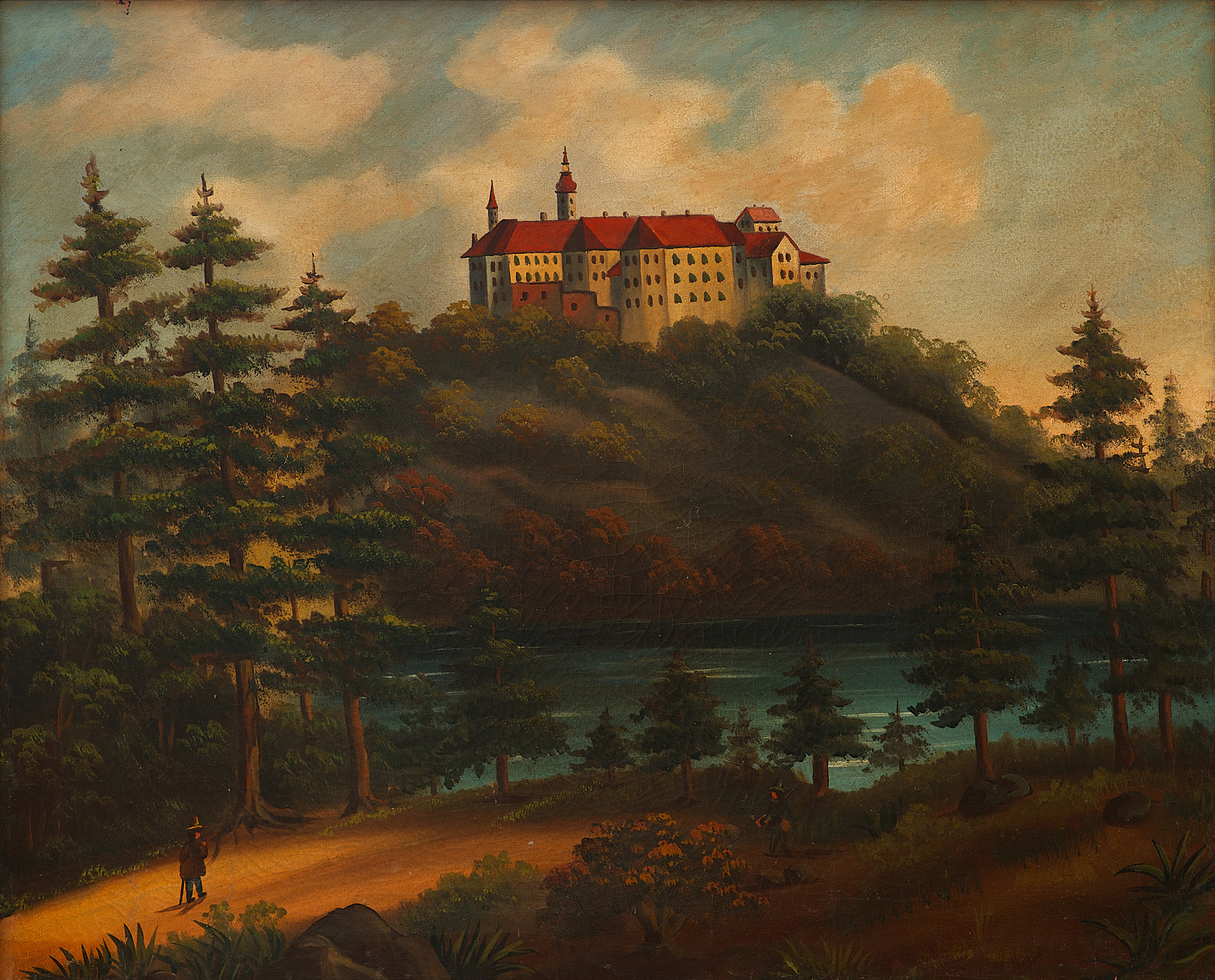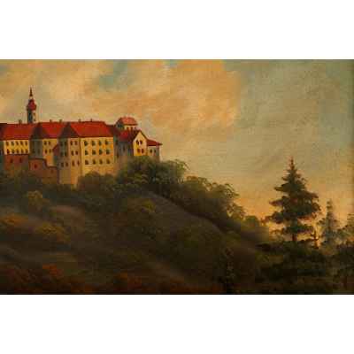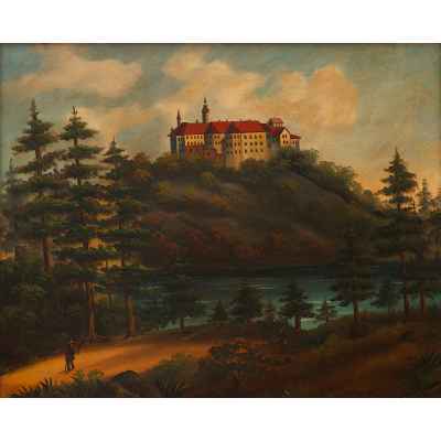 На картине «Пейзаж с замком» изображён романтизированный вид на возвышающийся над лесистым склоном средневековый замок, окружённый густыми деревьями и водоёмом на переднем плане. По дороге внизу картины прогуливается фигура в шляпе с посохом — вероятно, путник, что усиливает ощущение спокойствия и идилличности. Композиция построена с симметричным балансом между природной средой и архитектурным акцентом, а мягкий свет и проработанное небо придают сцене возвышенно-романтический характер.