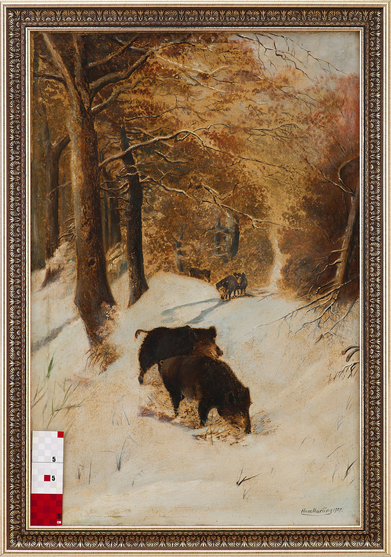 Сегодня работа «Кабаны в зимнем лесу» представляет интерес как антикварное произведение, выполненное на высоком профессиональном уровне. Картина обладает коллекционной ценностью, особенно среди ценителей европейской анималистики начала XX века.