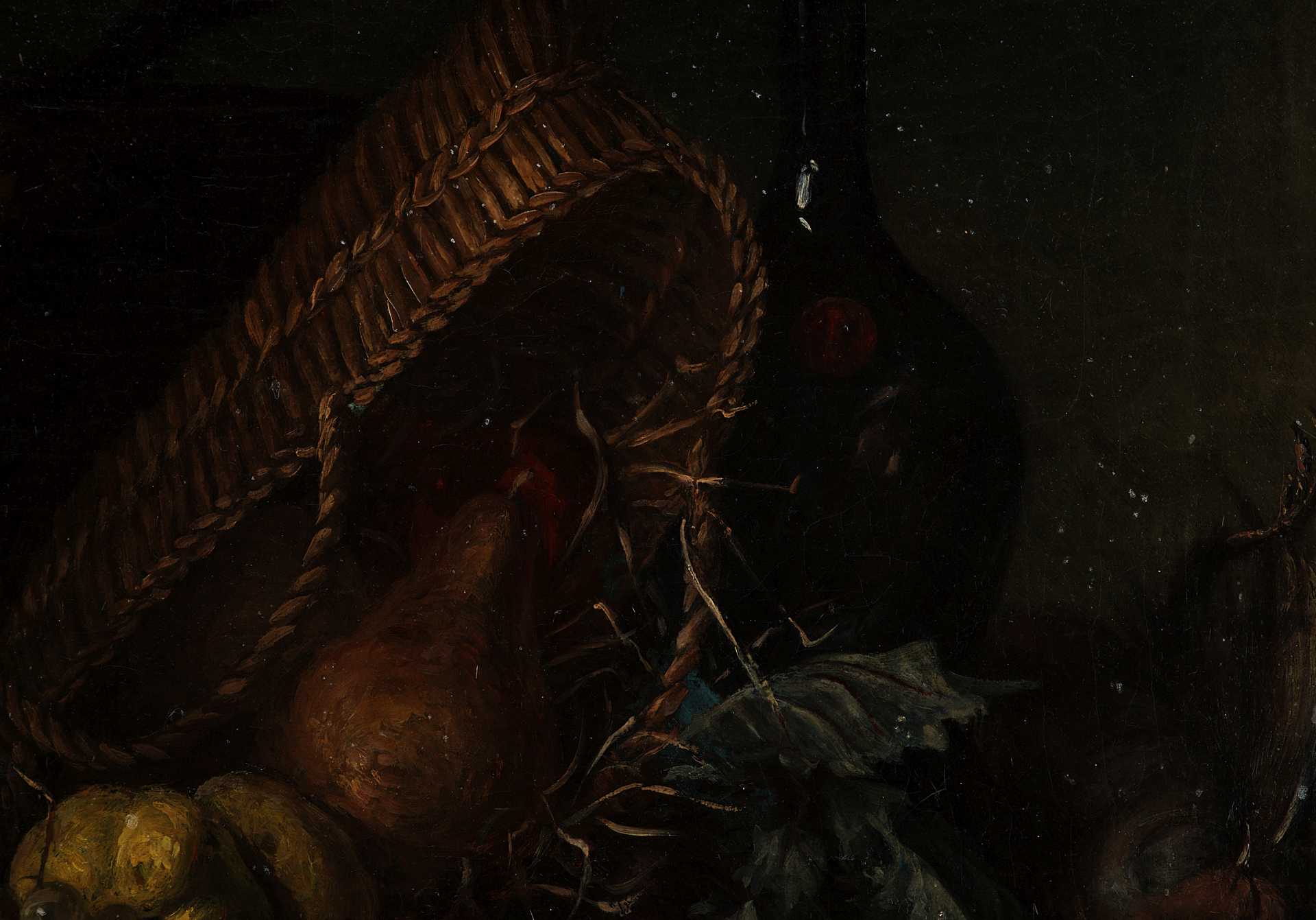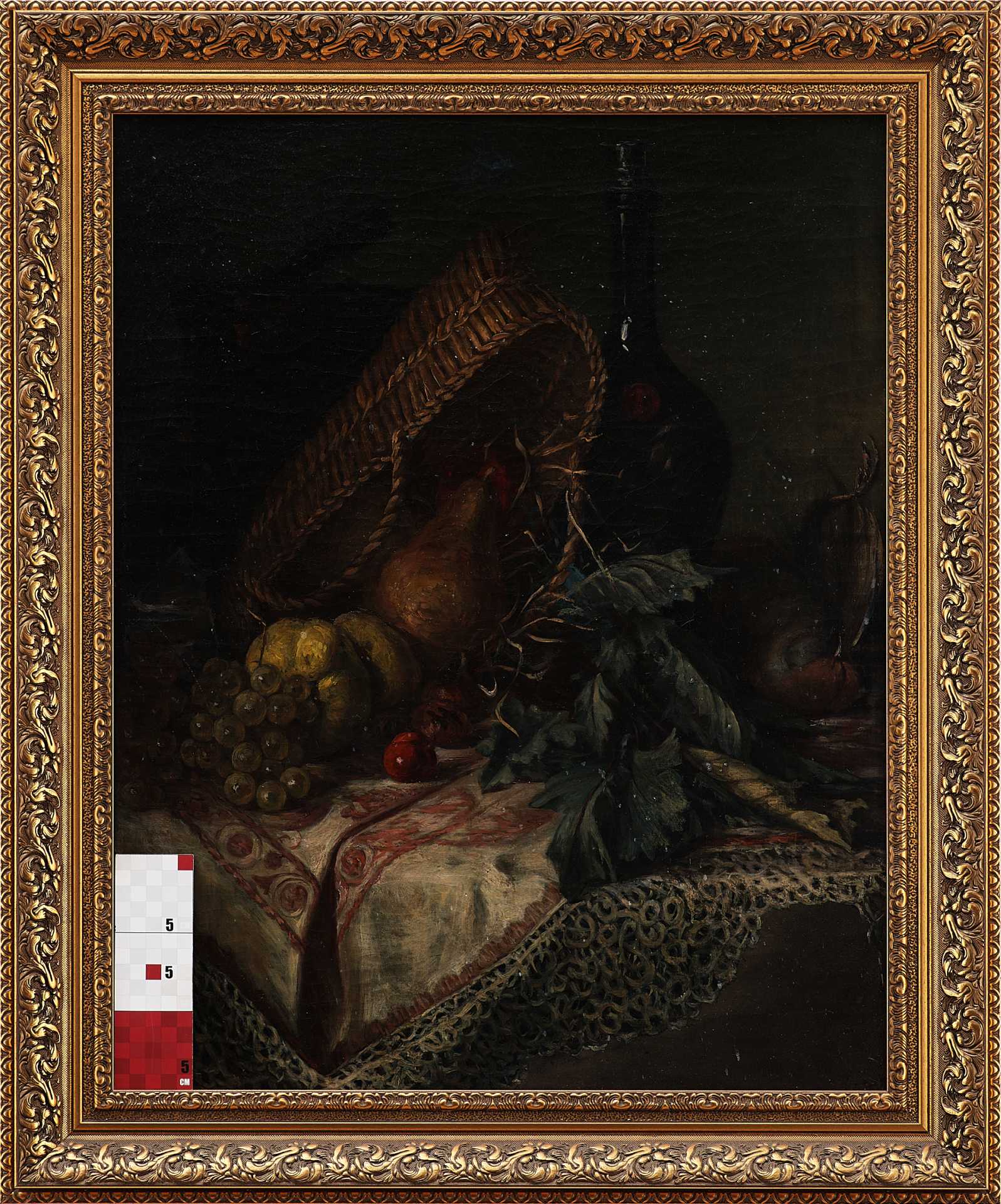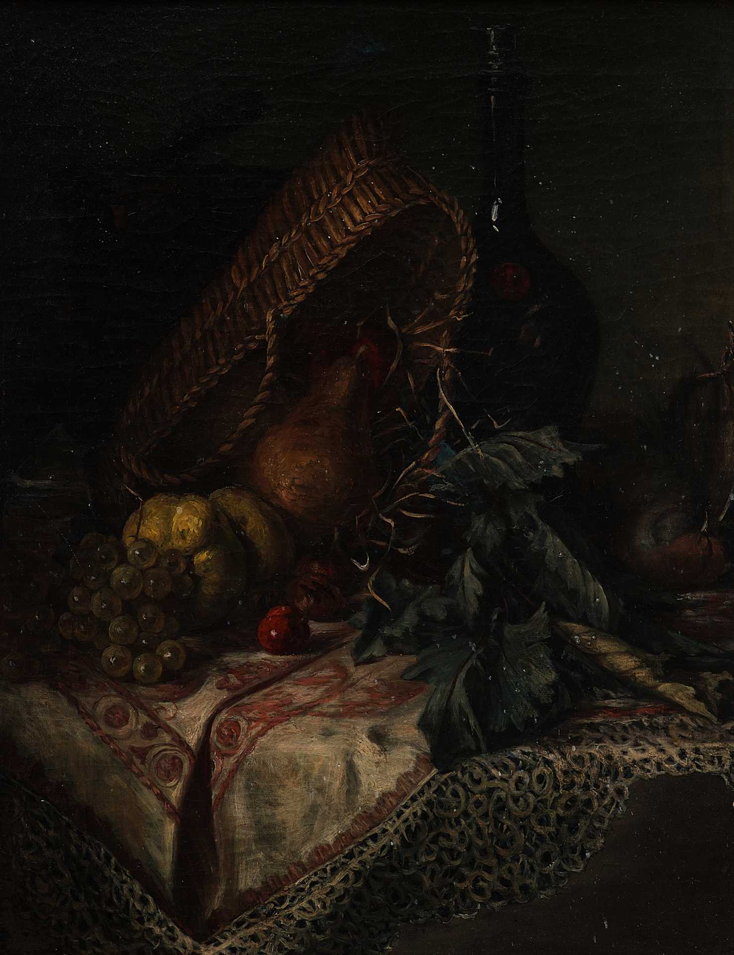 Картина представляет собой натюрморт с богатой и сдержанной композицией. На покрытом кружевной салфеткой столе изображены разнообразные предметы: перевёрнутая корзина с фруктами — грушей, виноградом, черешней и патиссонами, глиняный кувшин, тёмная бутылка и зелень. Среди даров природы особенно выделяется битая дичь — птица, лежащая на спине, что придаёт сцене драматический акцент. Фоном служит глухая тёмно-зелёная стена, усиливающая ощущение глубины и камерности.