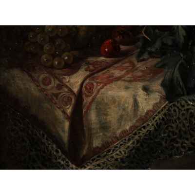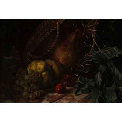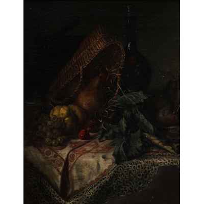 Работа относится к жанру натюрморта, распространённому в западноевропейской живописи второй половины XIX века. В композиции прослеживаются черты, характерные для стиля академической реалистической школы, в том числе использование сложной светотени, тщательная детализация и сбалансированная колористика. Натюрморт рассматривается здесь как средство демонстрации художественного мастерства и вкуса, а не только как отражение бытовой сцены.