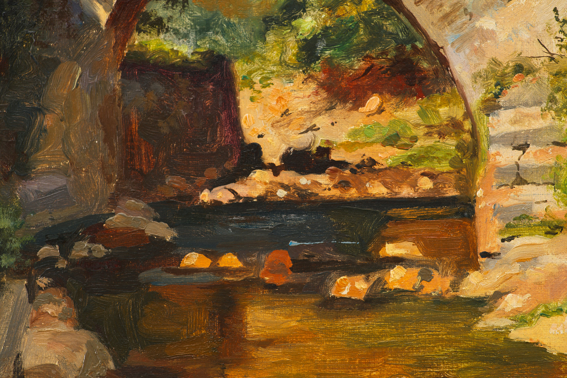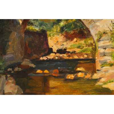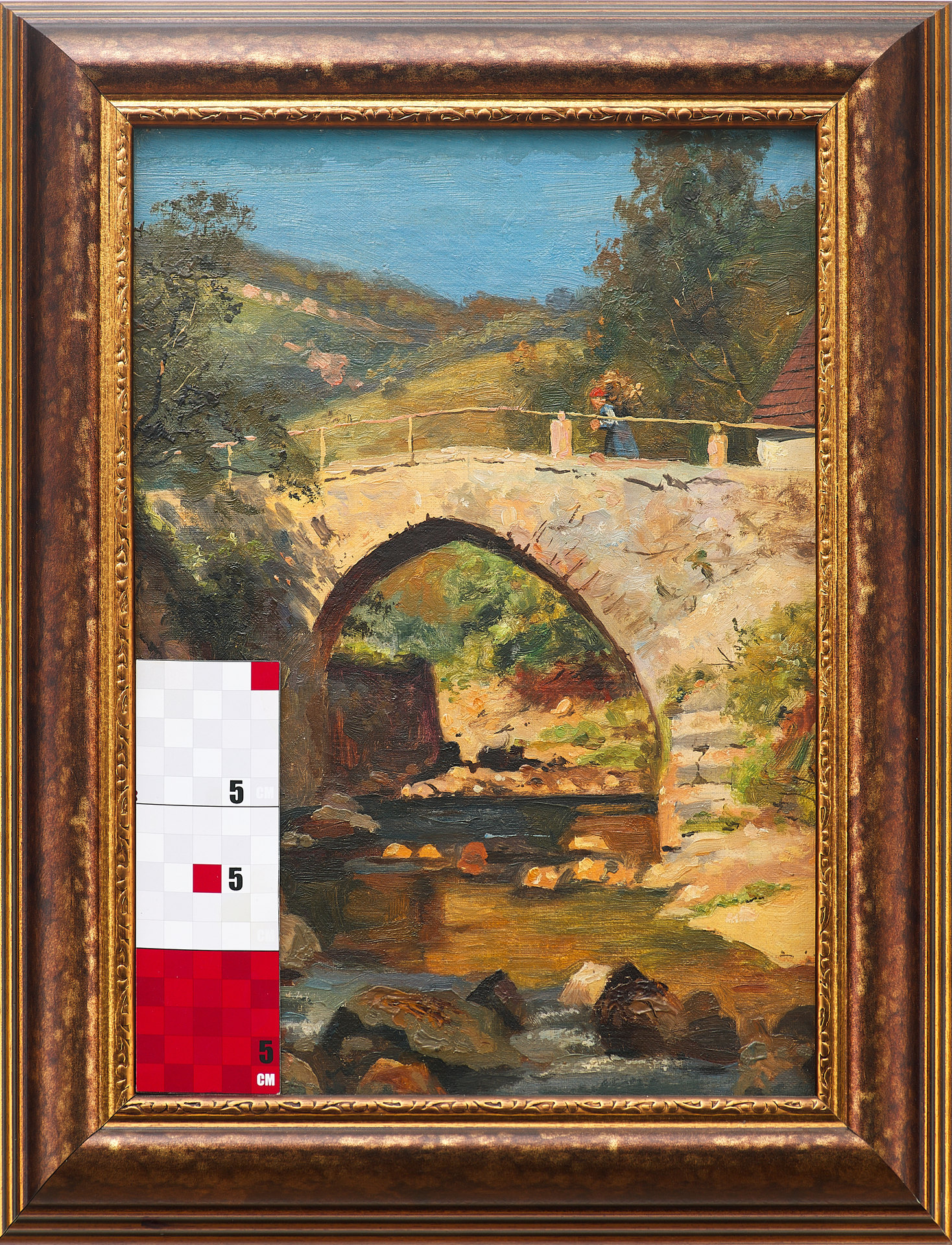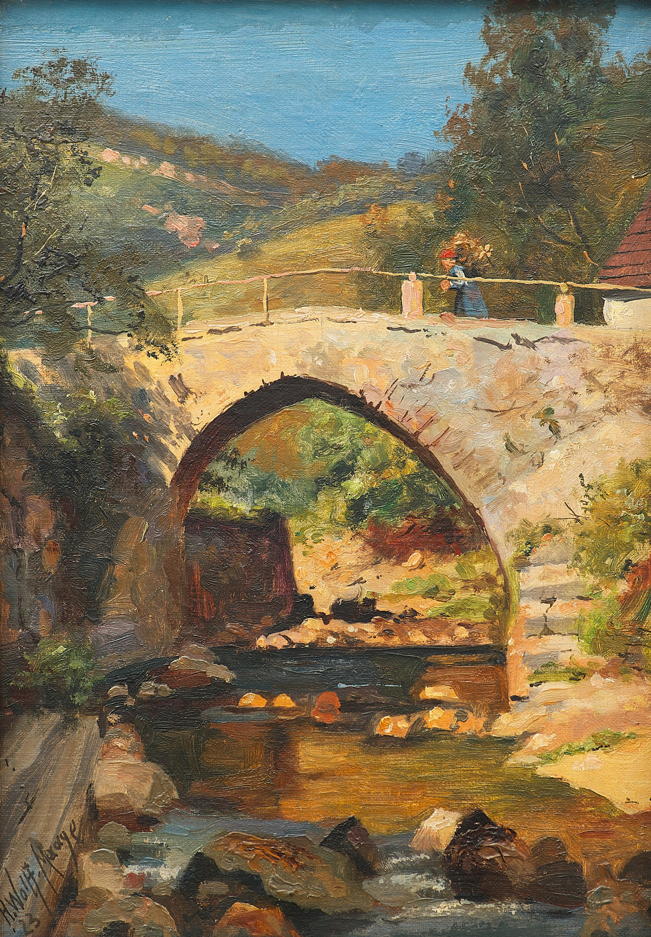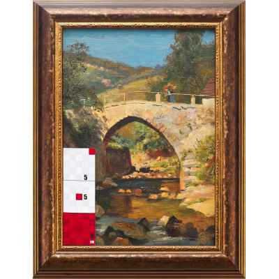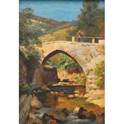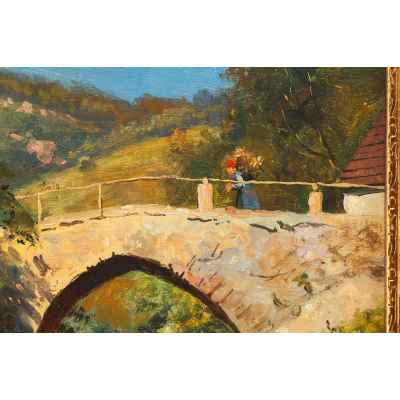 На картине изображён живописный сельский пейзаж: арочный каменный мост перекинут через неглубокую речку, текущую среди камней. По мосту идёт женщина-крестьянка, несущая вязанку хвороста. Вся сцена залита тёплым дневным светом, подчёркивающим яркость зелёных склонов холмов и насыщенность неба. Композиция отличается сбалансированной симметрией, в которой архитектурный элемент моста служит центральной осью.