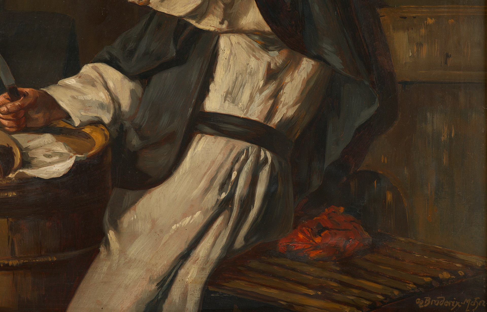 Автор картины — Georg Broderix, художник, работавший в Мюнхене. Его подпись расположена в правом нижнем углу («Ge. Broderix. Mchn»). Использованная техника — масло на картоне — типична для студийных работ того времени. Формат картины (47 × 38 см) и живописная манера соответствуют традициям немецкой академической школы.