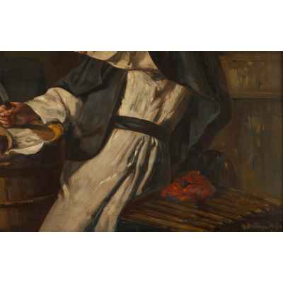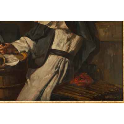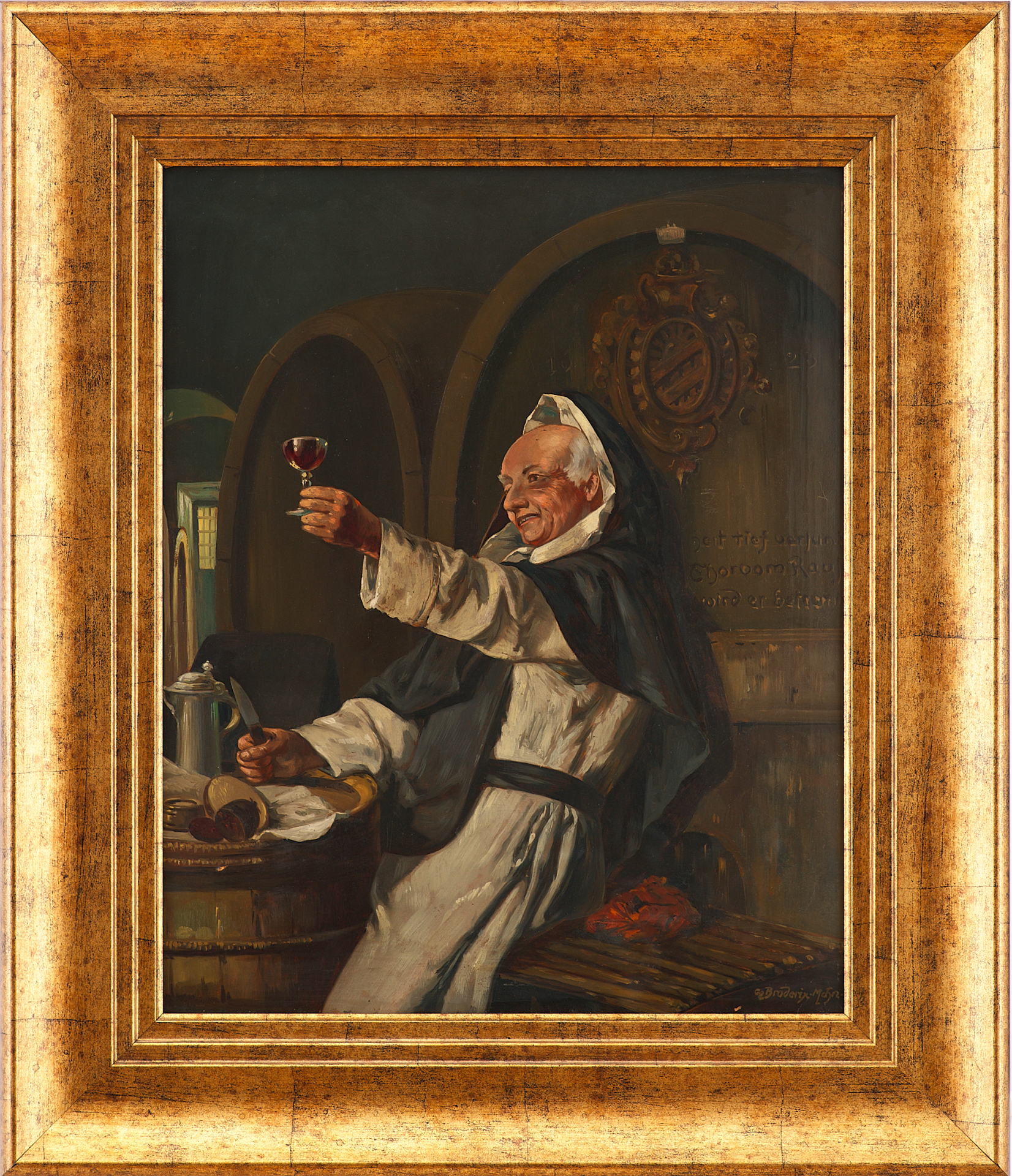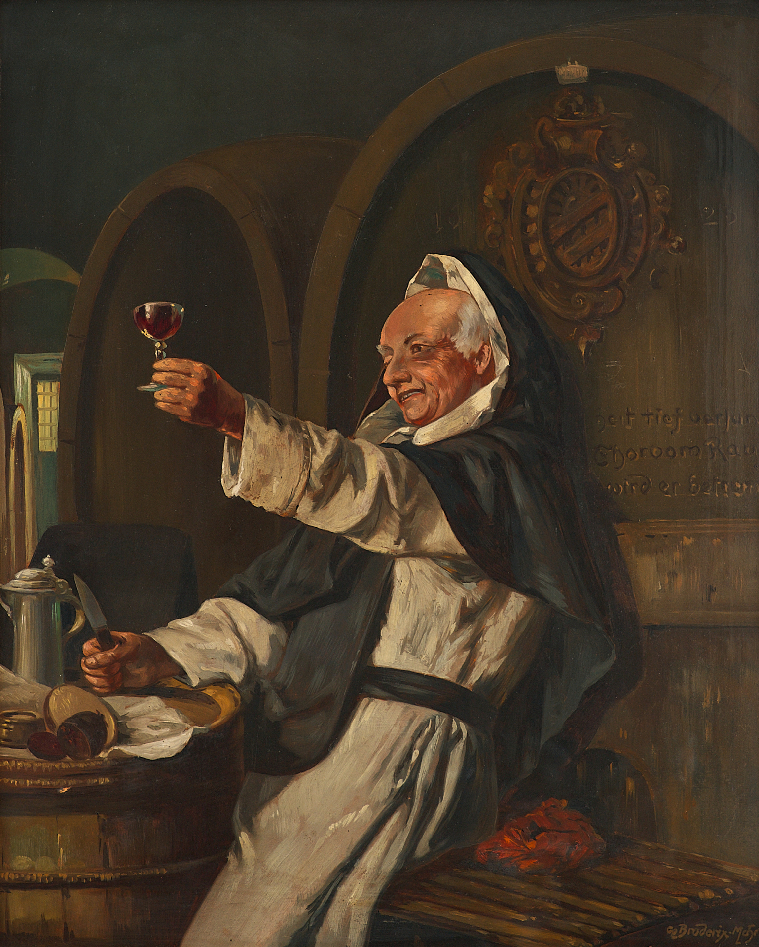 Картина написана в жанровом стиле, характерном для немецкого бидермейера, с его стремлением к уюту, детализации быта и одухотворённости простых сцен. Работа относится к бытовому жанру, активно развивавшемуся в конце XIX — начале XX века, в том числе в рамках мюнхенской школы живописи. Мотивы весёлых монахов, застигнутых за трапезой или пивом, были особенно популярны в Германии и Австрии этого периода, что делает композицию типичной, но тем не менее выразительной.