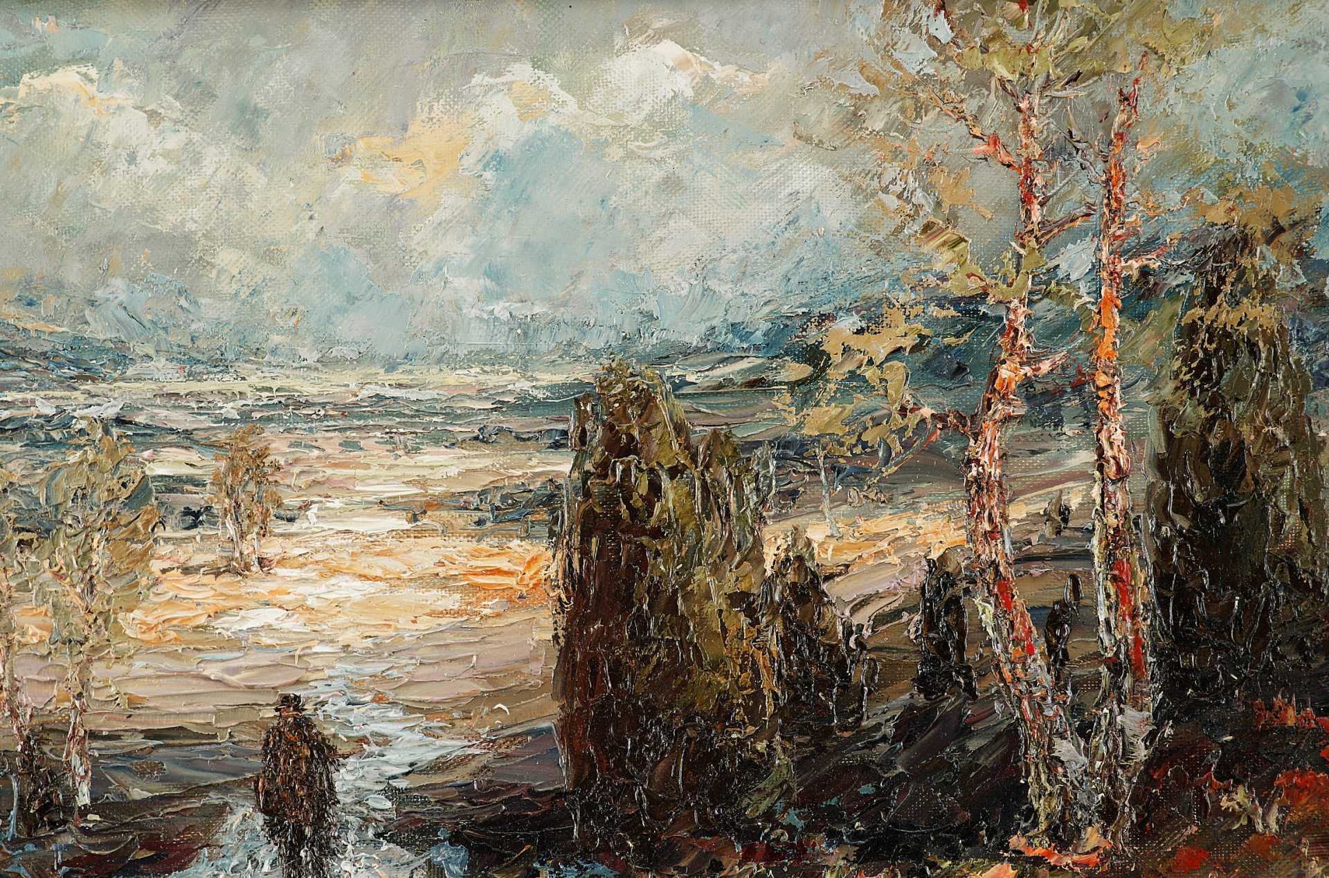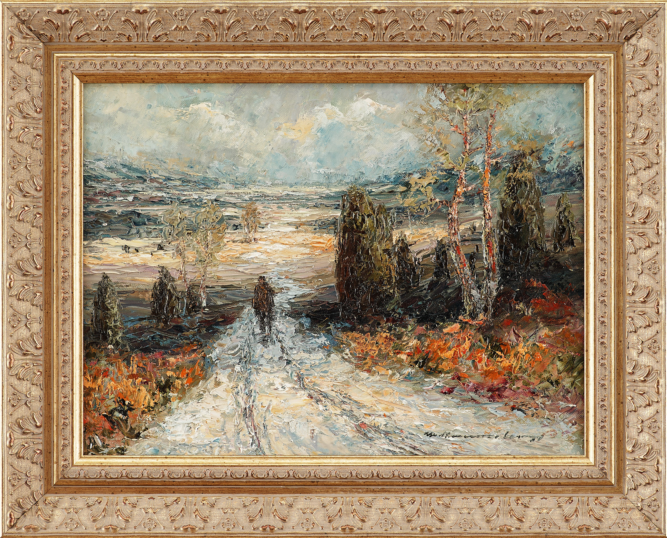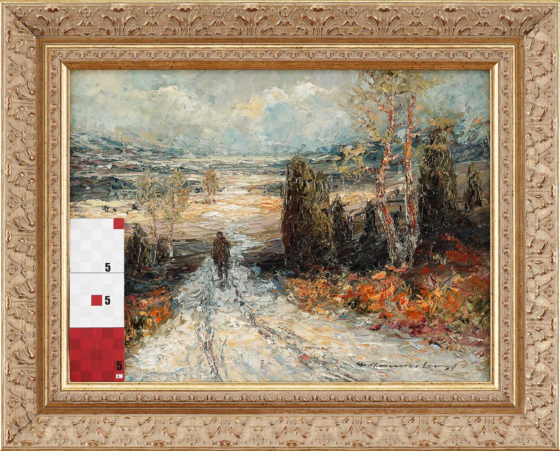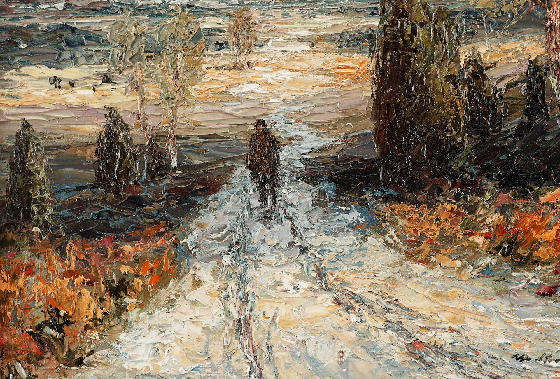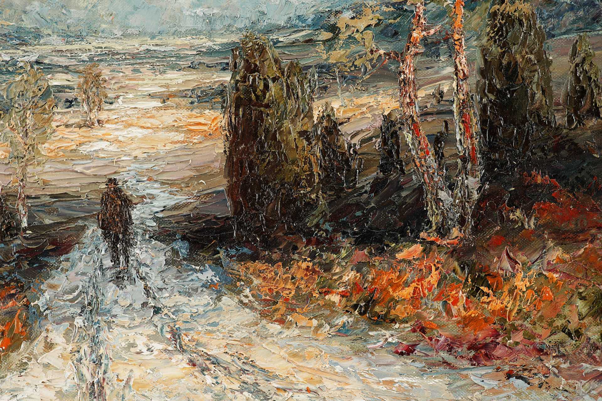 Изображена поздняя осень. В центре заснеженная дорога, уходящая вдаль. По ней идёт путник. По обеим сторонам дороги редкий лес, почва под которым покрыта ярким ковром опавших листьев. Над горизонтом полоска неба с густыми барашками облаков.