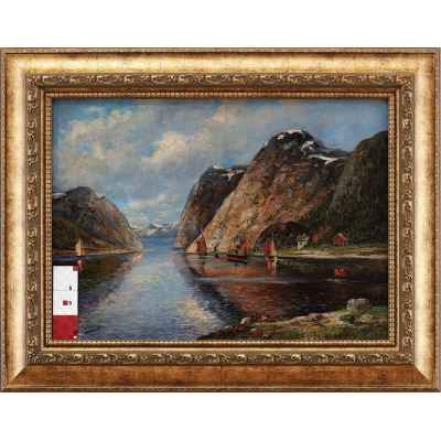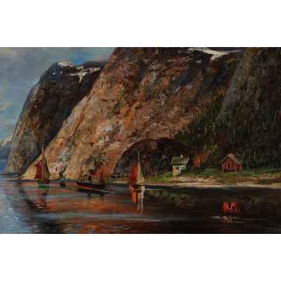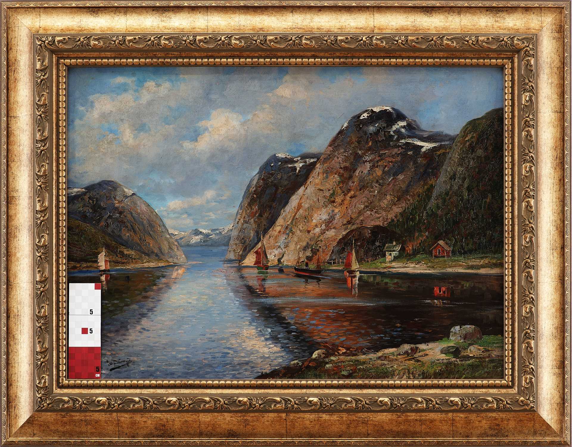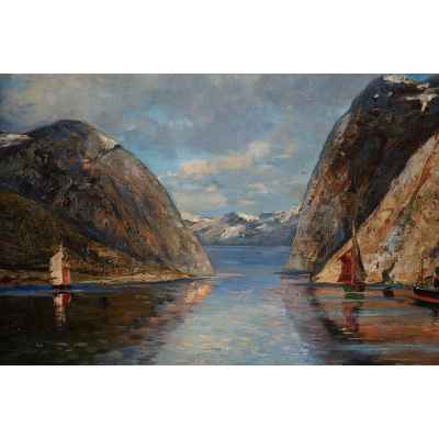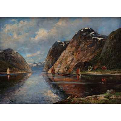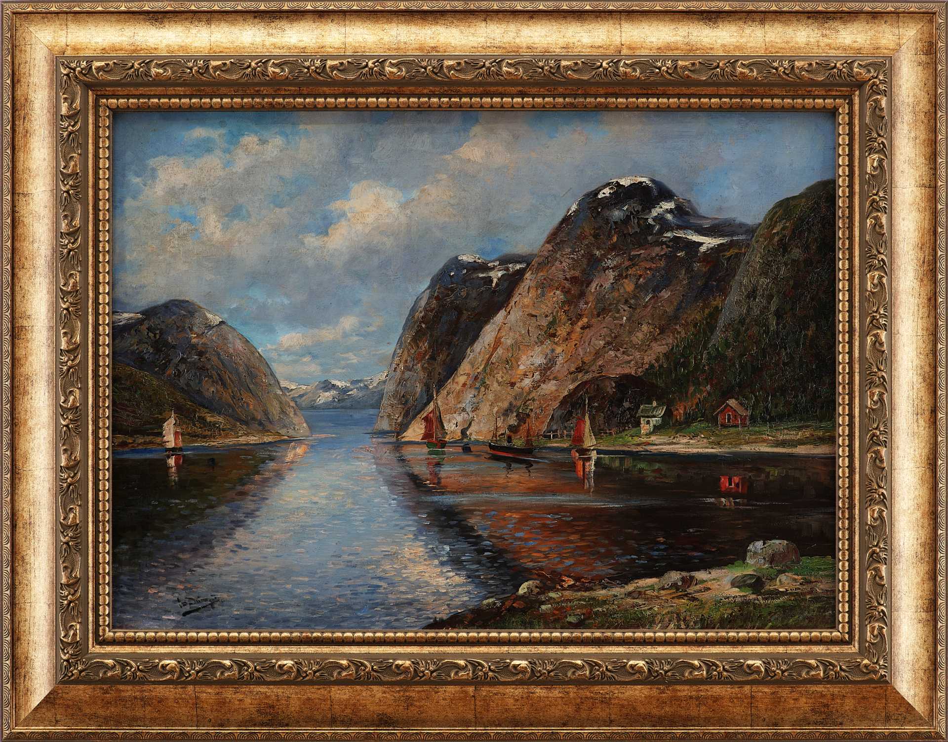 На картине изображён прибрежный норвежский фьорд, обрамлённый величественными горными склонами, отражающимися в спокойной водной глади. Вдоль залива разбросаны небольшие лодки с яркими парусами, а у подножия скал расположились скромные постройки — красные деревянные домики, характерные для северной Скандинавии. Светлое небо с лёгкими облаками дополняет умиротворённую атмосферу пейзажа.