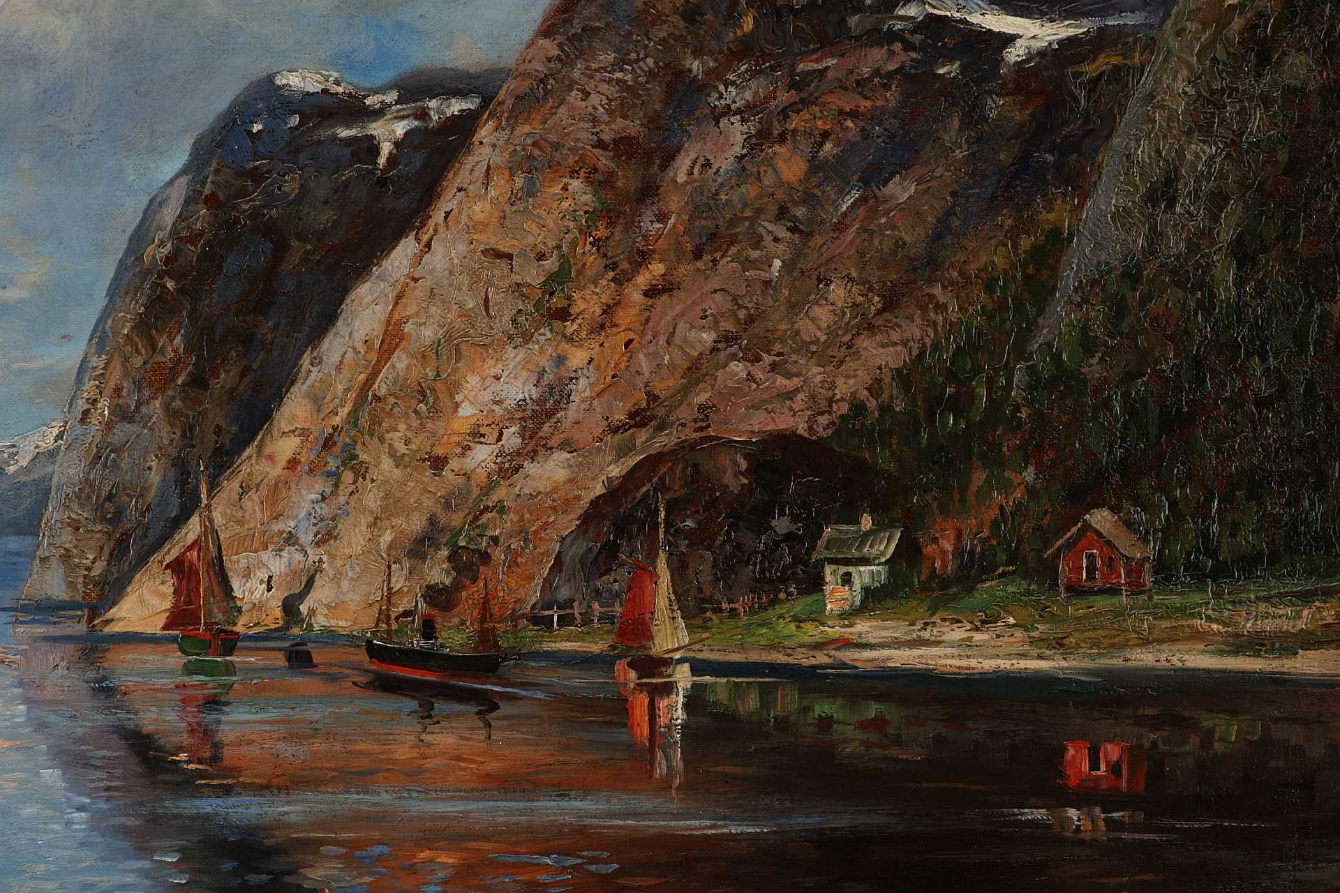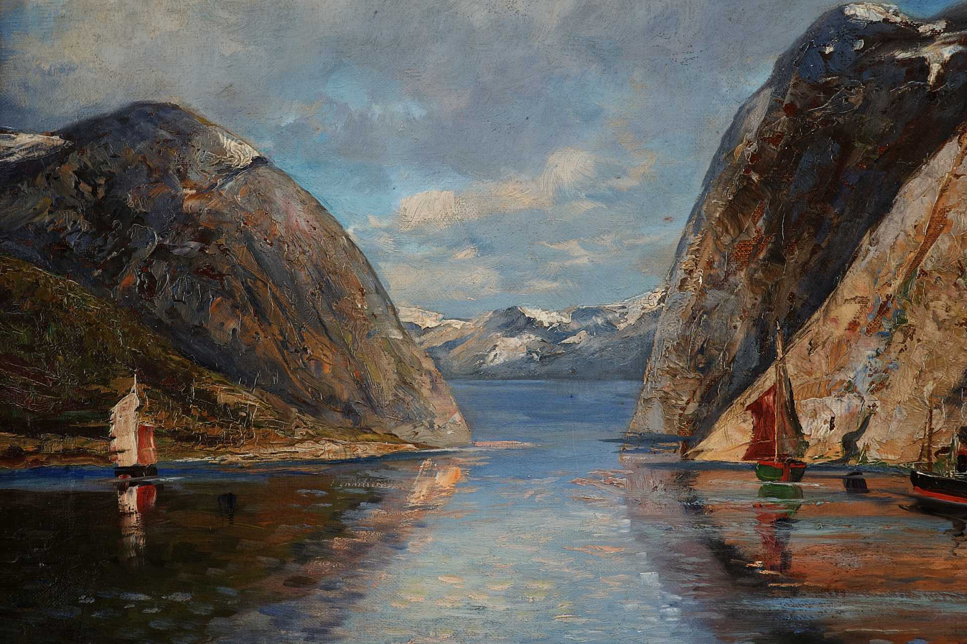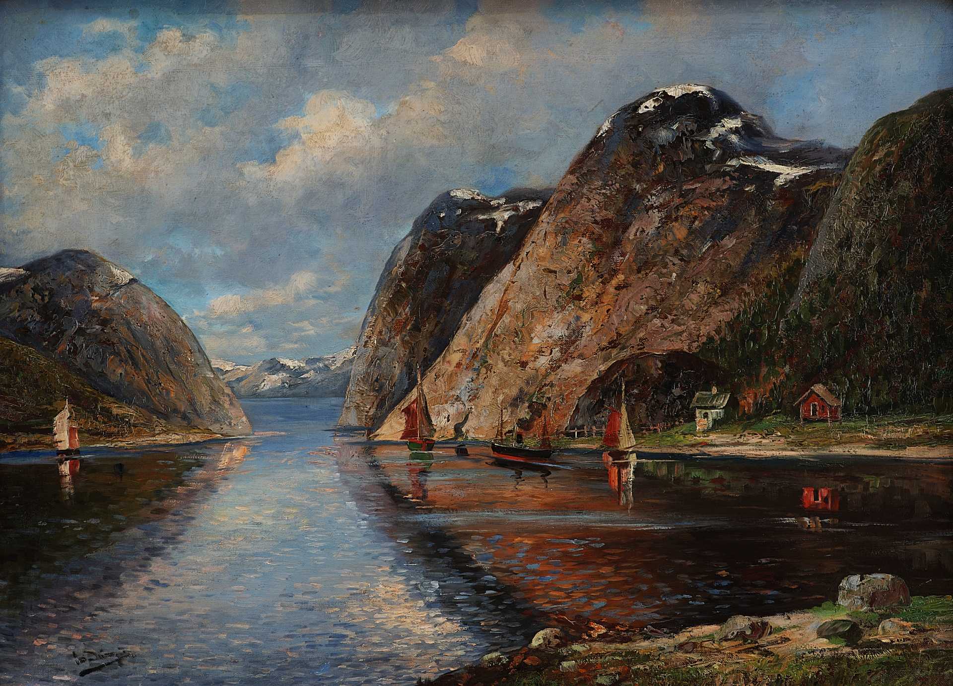 На картине изображён прибрежный норвежский фьорд, обрамлённый величественными горными склонами, отражающимися в спокойной водной глади. Вдоль залива разбросаны небольшие лодки с яркими парусами, а у подножия скал расположились скромные постройки — красные деревянные домики, характерные для северной Скандинавии. Светлое небо с лёгкими облаками дополняет умиротворённую атмосферу пейзажа.