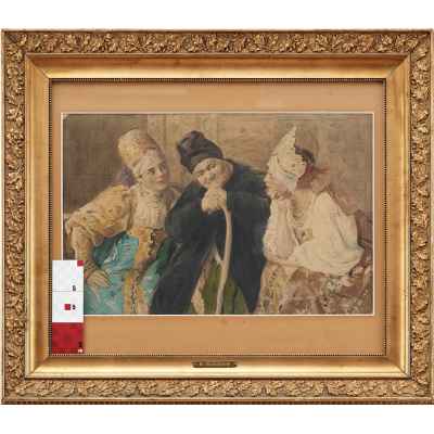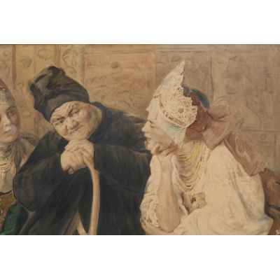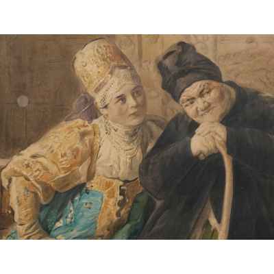 Картина выполнена в смешанной технике на картоне, что характерно для начала XX века, и является высокопрофессиональной копией с оригинала К.Е. Маковского, одного из наиболее известных русских художников второй половины XIX – начала XX века. Сам оригинал картины был создан около 1900-х годов. Представленная копия повторяет композиционную структуру и живописную манеру Маковского, отличающуюся насыщенной цветовой палитрой, вниманием к этнографическим деталям и выразительной характеристикой персонажей.