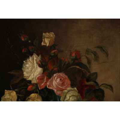 На картине «Букет роз и фрукты» изображён натюрморт, сочетающий пышный букет розовых, белых и кремовых роз в керамическом сосуде с лежащими у его основания фруктами — виноградом, яблоками, персиками и сливами. Композиция построена по классическим канонам: тёмный фон подчёркивает богатство формы и цвета, усиливая декоративную выразительность объектов. Лепестки цветов и глянцевая поверхность фруктов тщательно проработаны, передавая объём, текстуру и светотень.