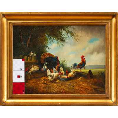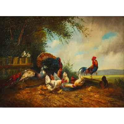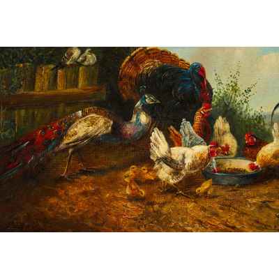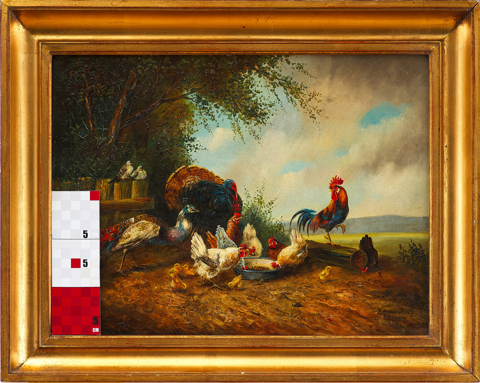 Автор произведения — Богдан Каудецкий (Bogdan Kaudetzky, 1898–1964), немецкий живописец, работавший в Мюнхене. Он специализировался на изображении птичьих дворов и сельских пейзажей, продолжая традиции немецкого жанрового реализма начала XX века. Картина выполнена в технике масла на холсте, датируется первой четвертью XX века, и подписана: “B. Kaudetzky München” в правом нижнем углу, что подтверждено экспертизой.