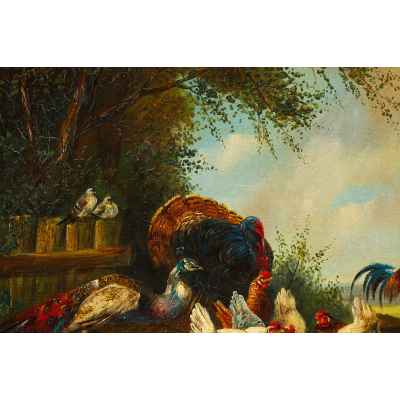 На картине «Птичий двор» изображён сельский летний пейзаж, наполненный жизнью и движением. На переднем плане у кормушки собрались разнообразные домашние птицы: индюк, петух, павлин, несколько кур с цыплятами. Сцена оживлена их взаимодействием — кто-то клюёт зерно, другие шагают, расправляя крылья. В левой части композиции под раскидистым деревом — деревенский забор, на котором сидят два голубя. Вдали — просторное поле, а над всем этим простирается светлое небо с мягкими облаками.