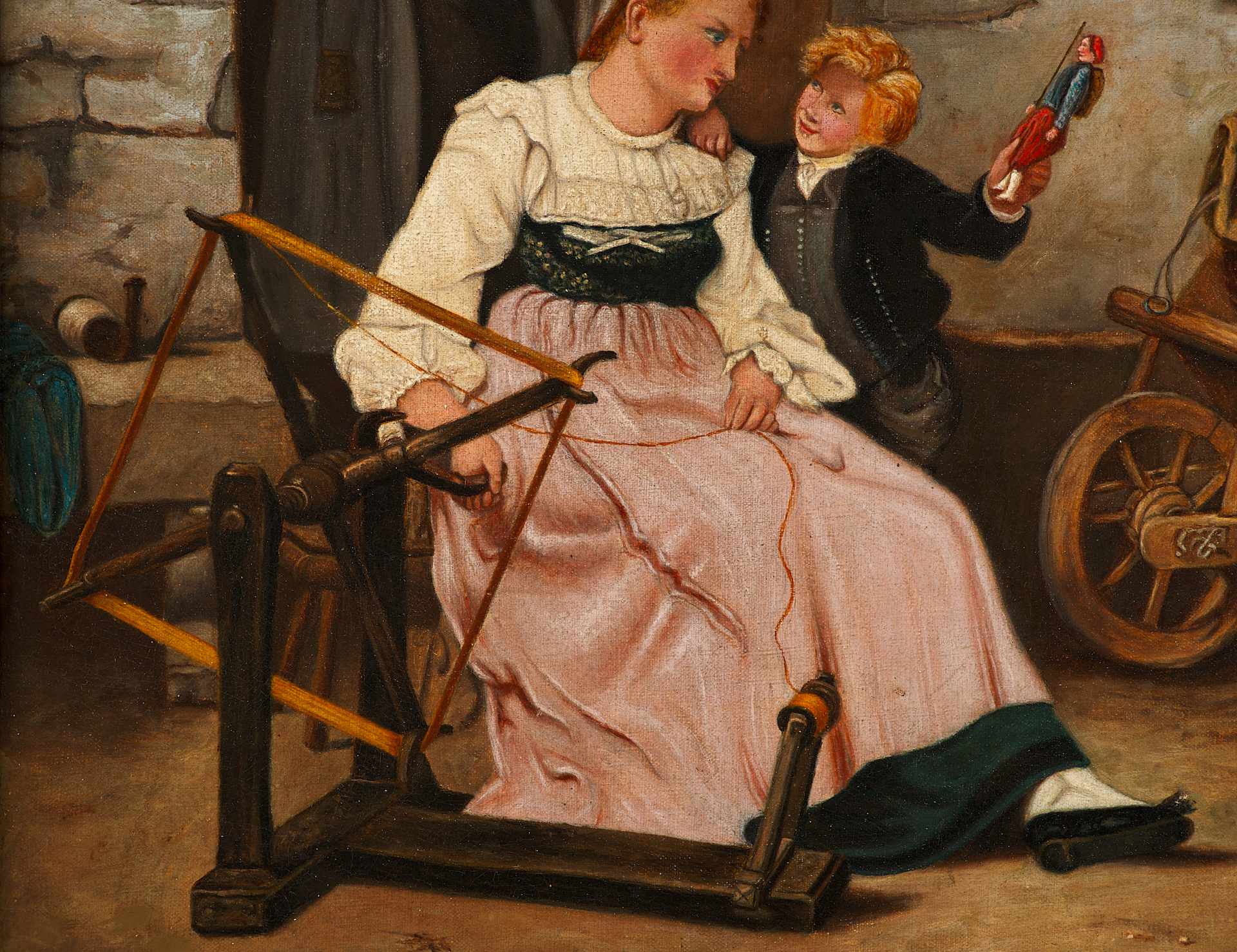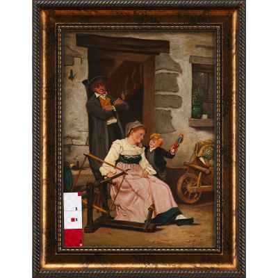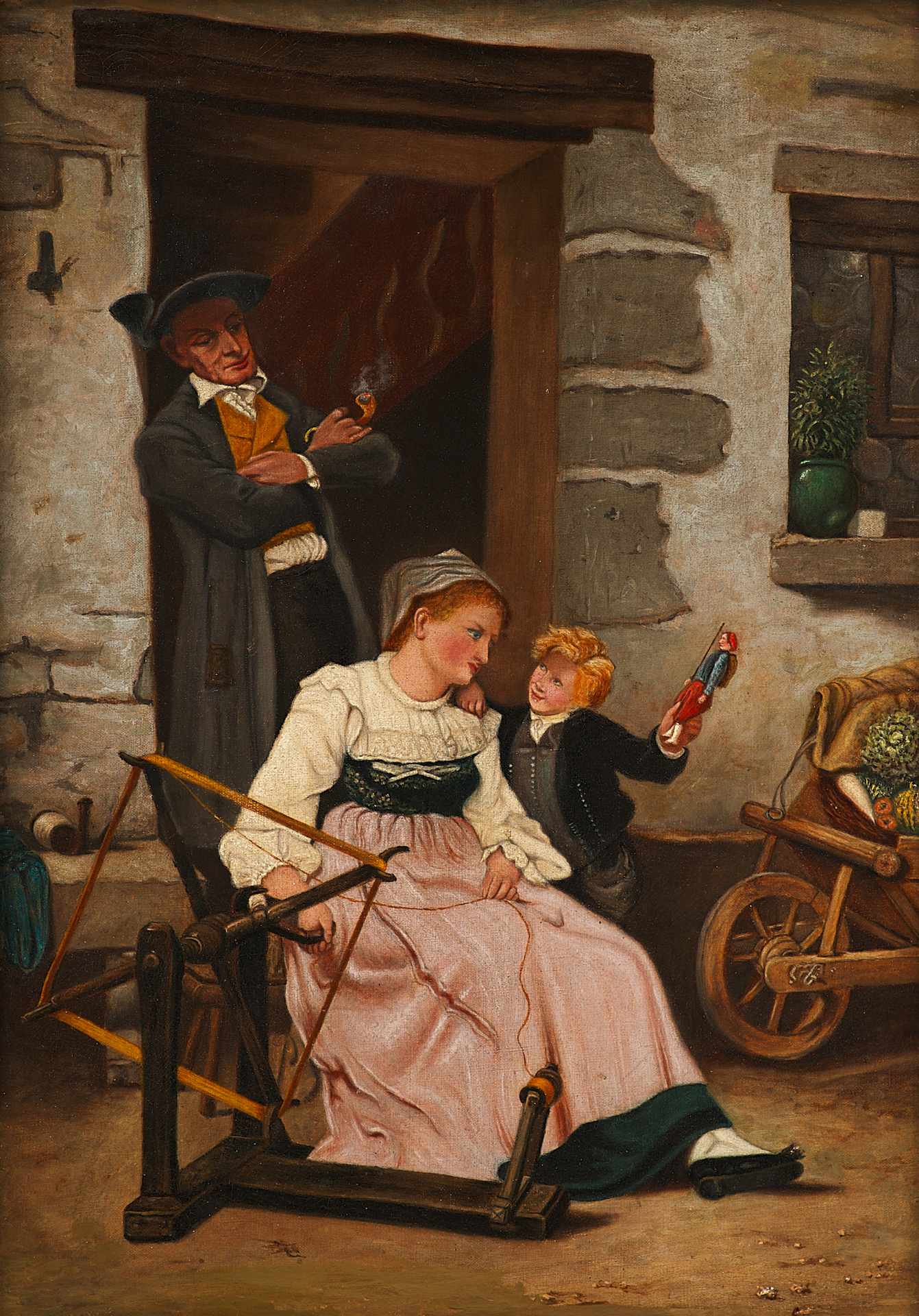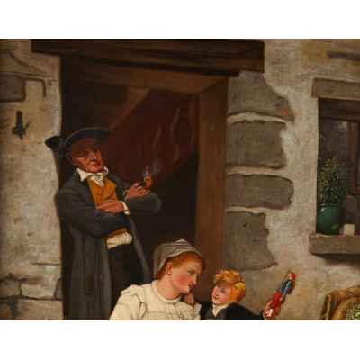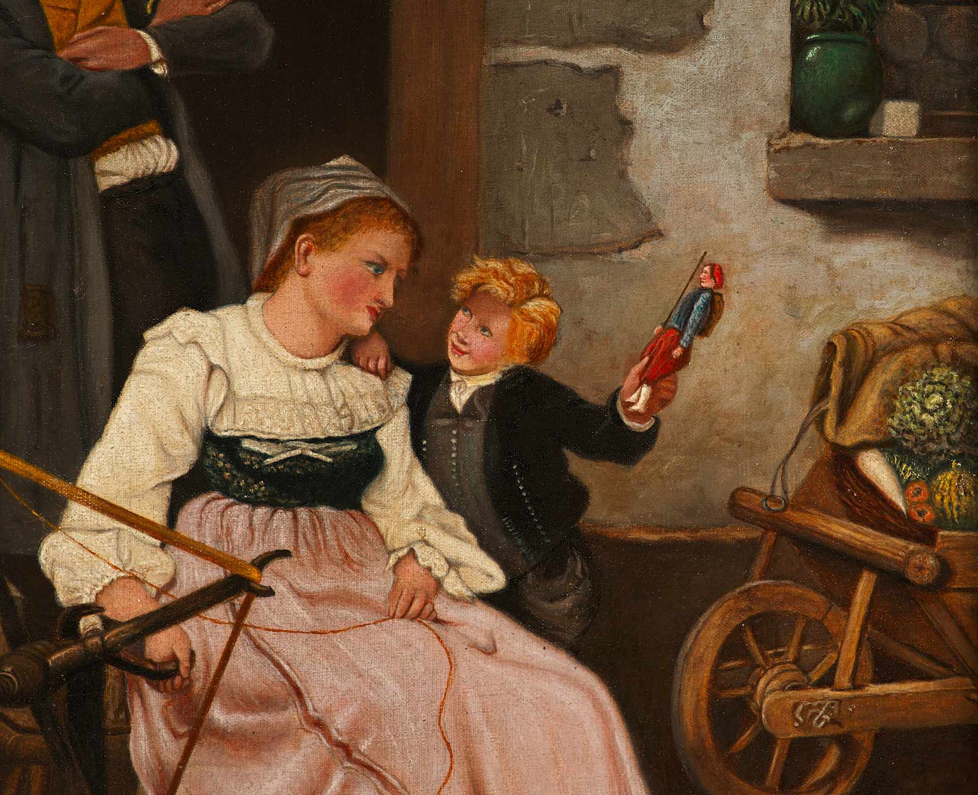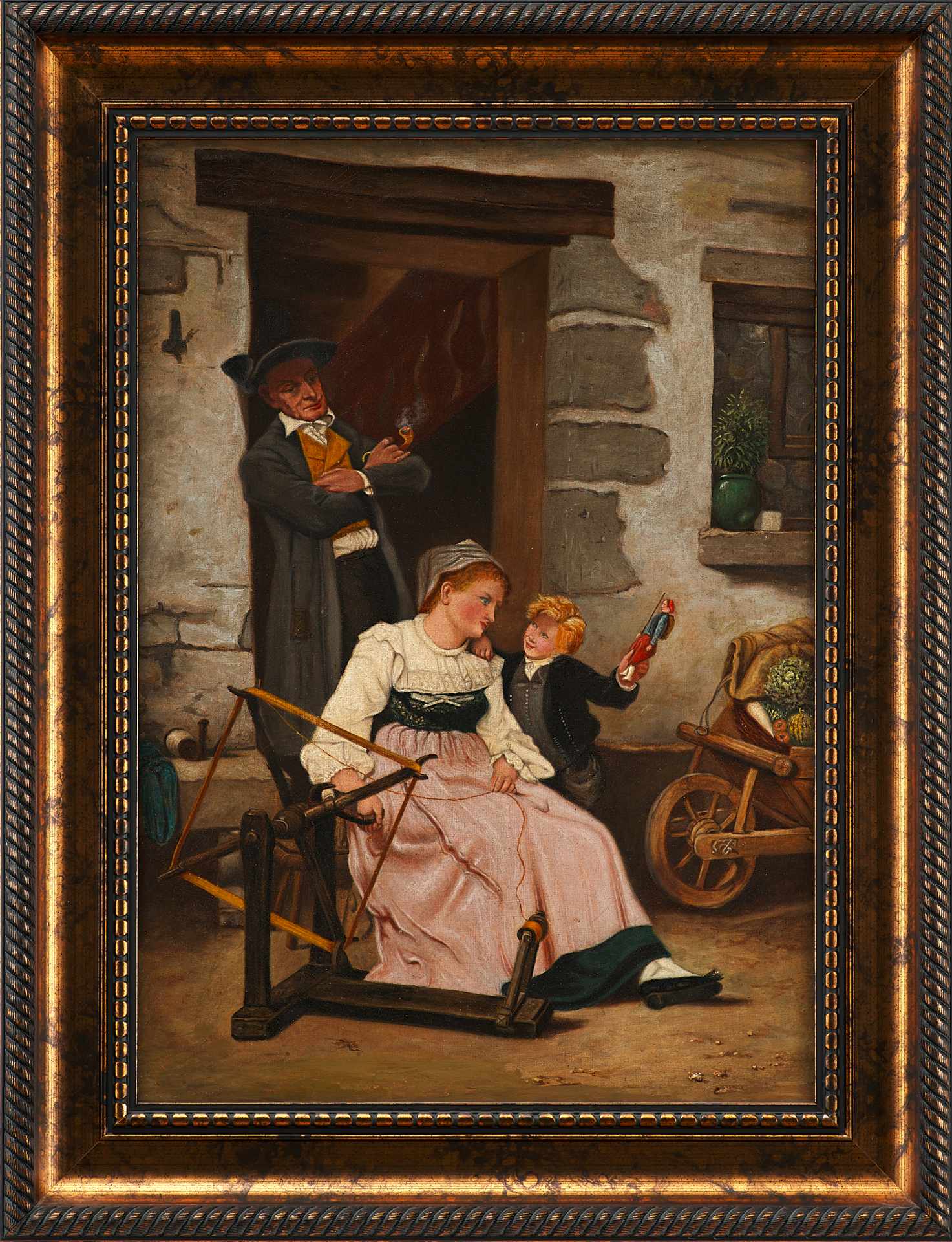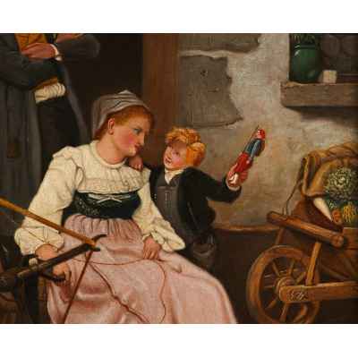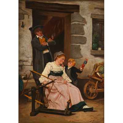 Изображена сценка из повседневной жизни. Женщина наматывает шерсть и разговаривает с сыном, который показывает ей игрушечного солдатика в костюме французского зуава; за ними у открытой двери стоит мужчина с трубкой в руке (вероятно, ветеран наполеоновских войн).