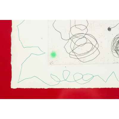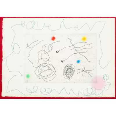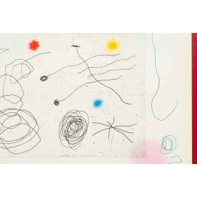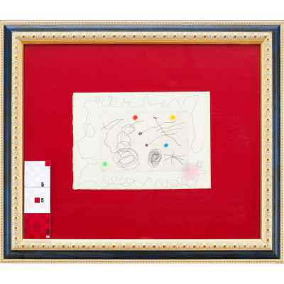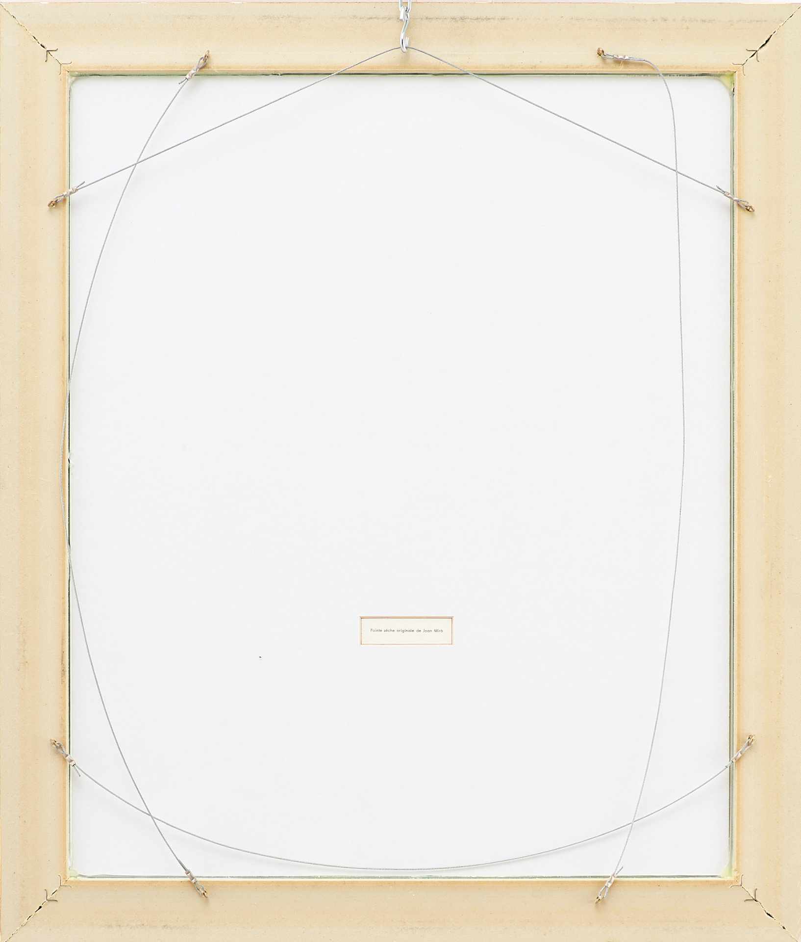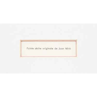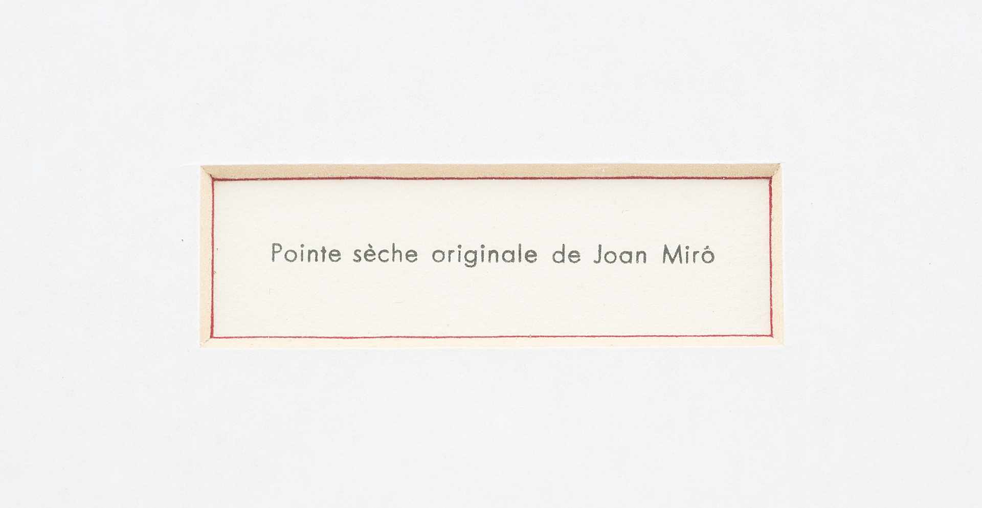 стороне листа печатная надпись: «Pointe seche originale de Joan Miro» («оригинальная (первая) печать «сухой иглы» Хуана Миро»)., подтверждающая подлинность произведения.